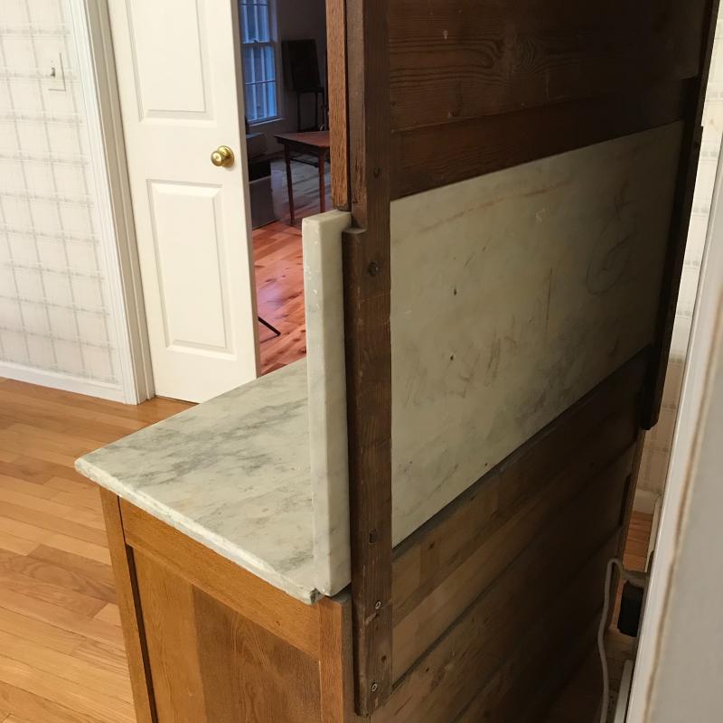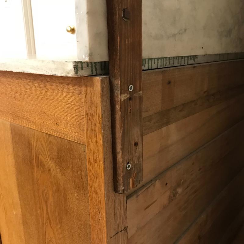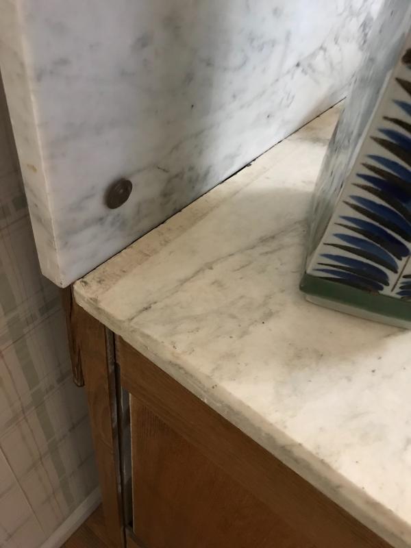 This marble topped antique dresser works great in a bedroom, dining room, or kitchen as a pastry table. Leaded glass mirror with three drawers. Could be broken down to 4 pieces. Measures 39.5”l x 19.5” w x 72” h. Needs some securing as it has been altered.. See photos.