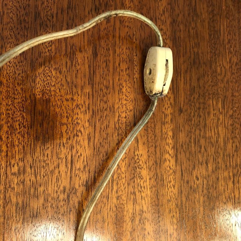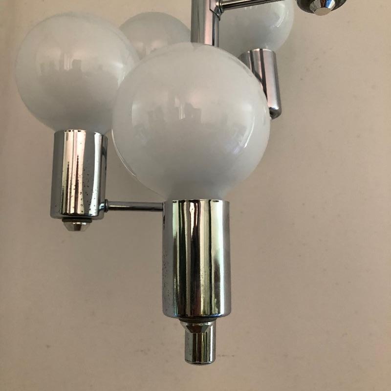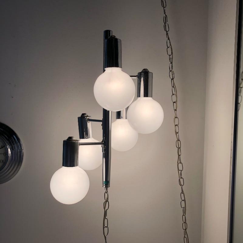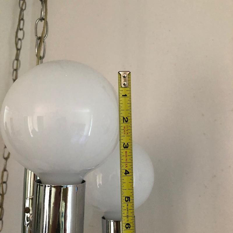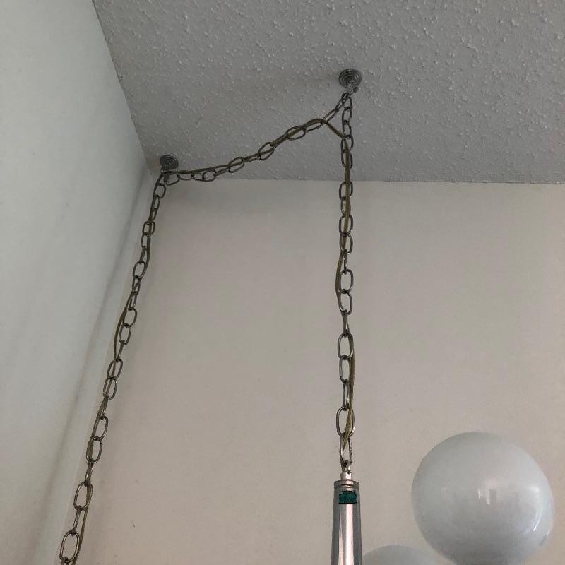 This is such a cool looking lamp that could be hung just about anywhere as it’s cord is very long. Comprised of 5 staggered bulbs on a central metal pole, this will be a focal point piece in its future home! Lamp measures 21” long and the chain is approximately 12ft long.