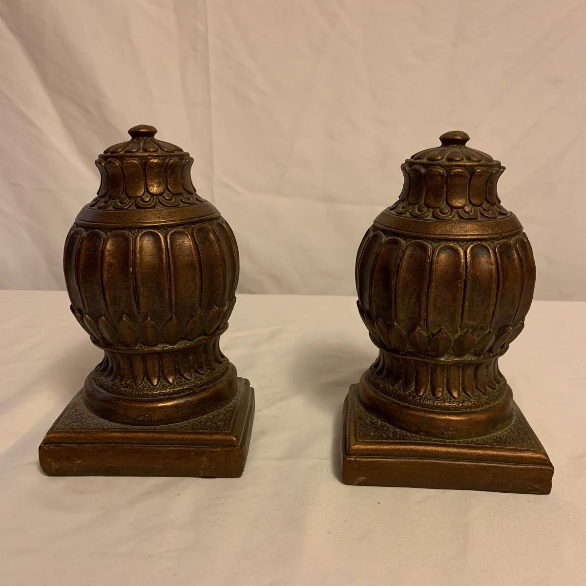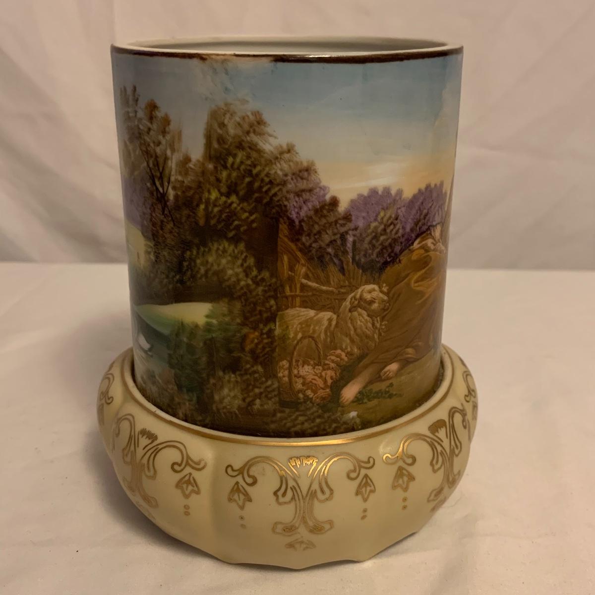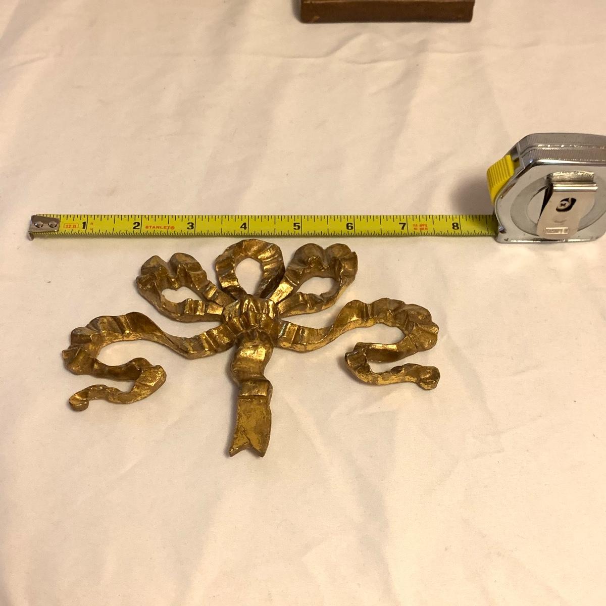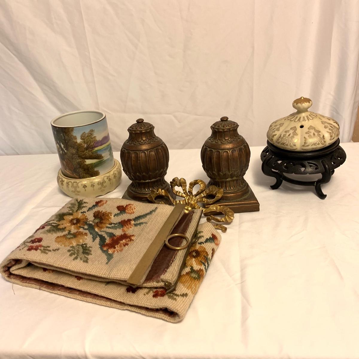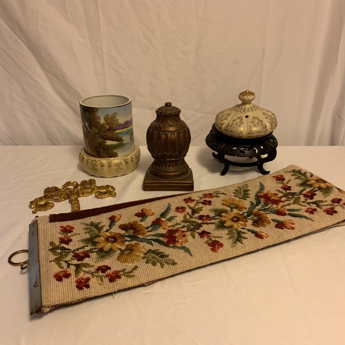 This lot consists of a needlepoint wall hanging, a ribbon wall hanging, bookends, a ceramic vase, and a music box. The wall hanging has a lovely array of red and yellow flowers. It has a metal hoop for hanging. The back is soft pink velvet. It measures 44” x 8”. There is a golden colored ribbon wall hanging as well. The bookends are heavy and urn-shaped. They have the appearance of tarnished copper. They are 7” tall. The ceramic vase has a lovely nature scene with two people and a lamb by a pond. It measures 6.25” tall. The music box is white ceramic with golden embellishments. It sits atop a wooden stand. Shipping available.