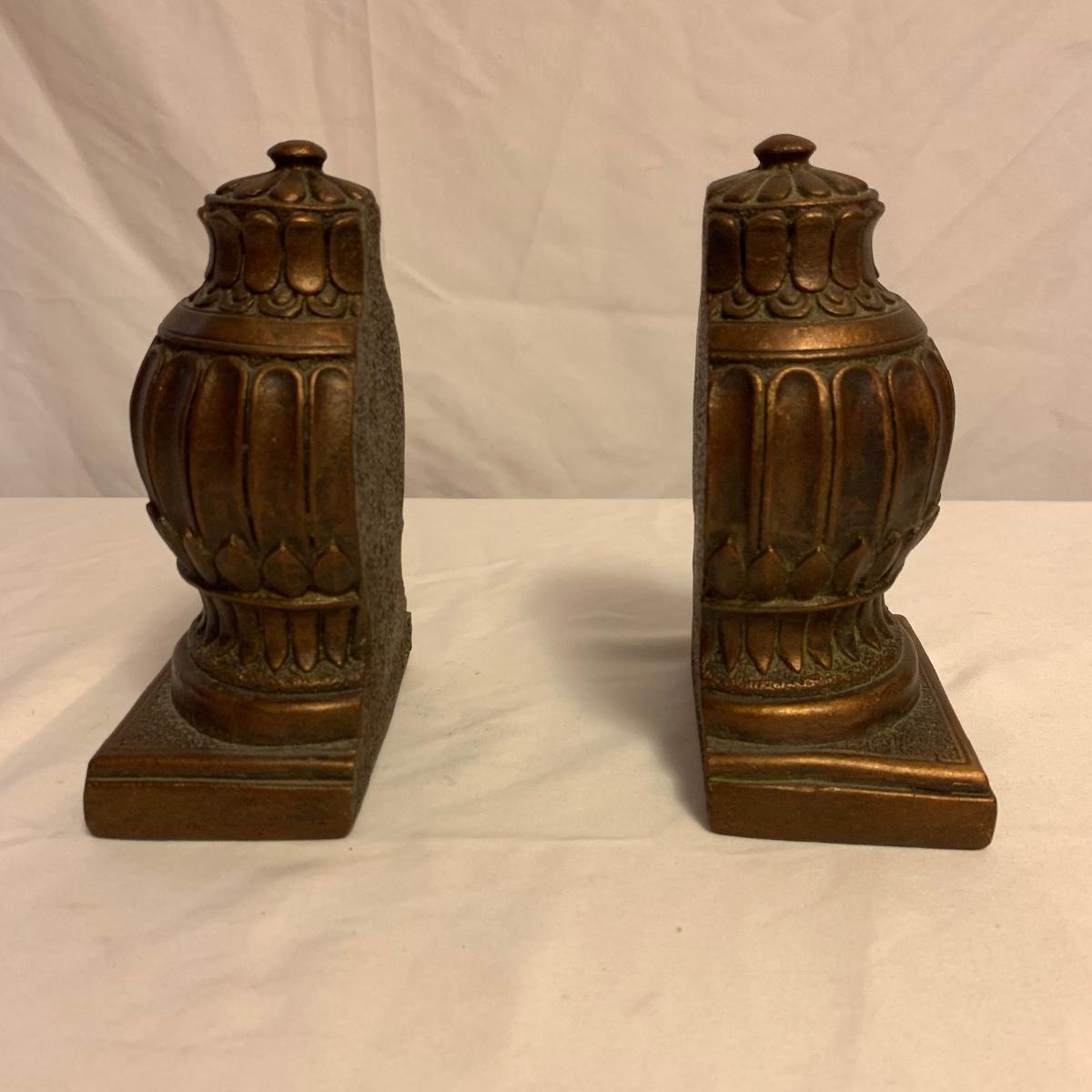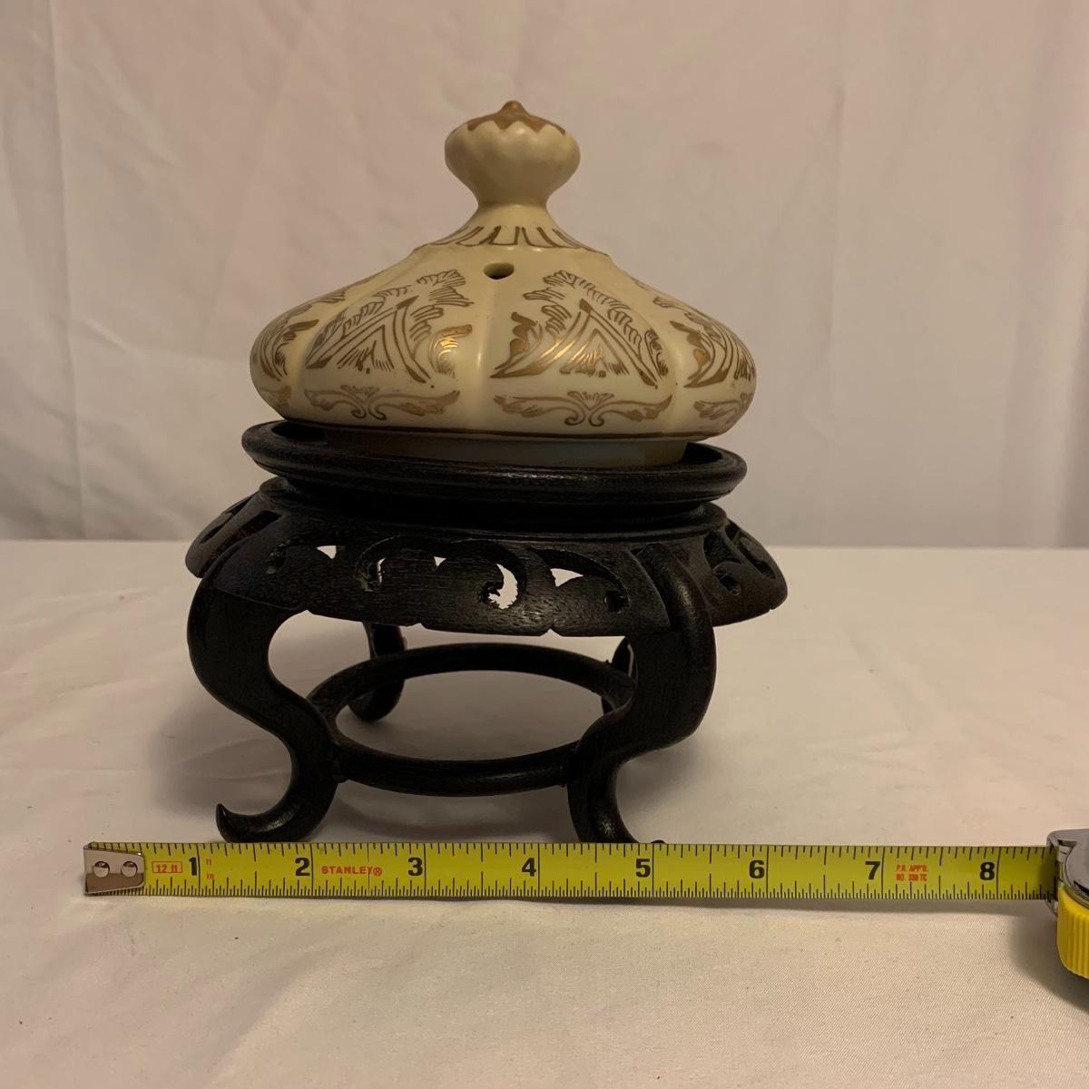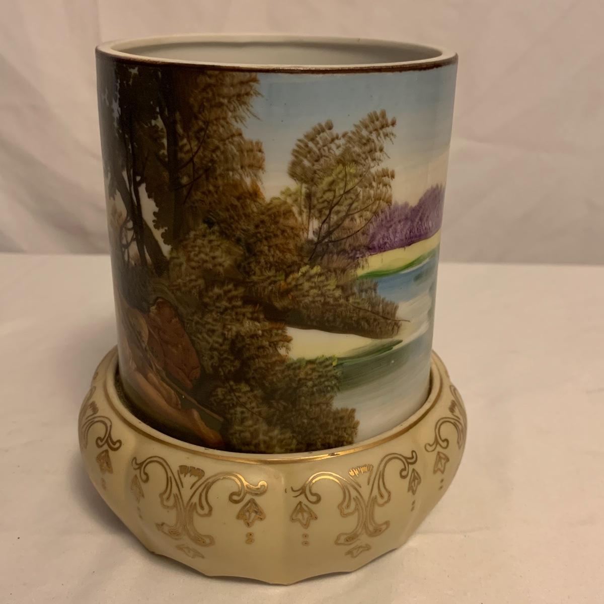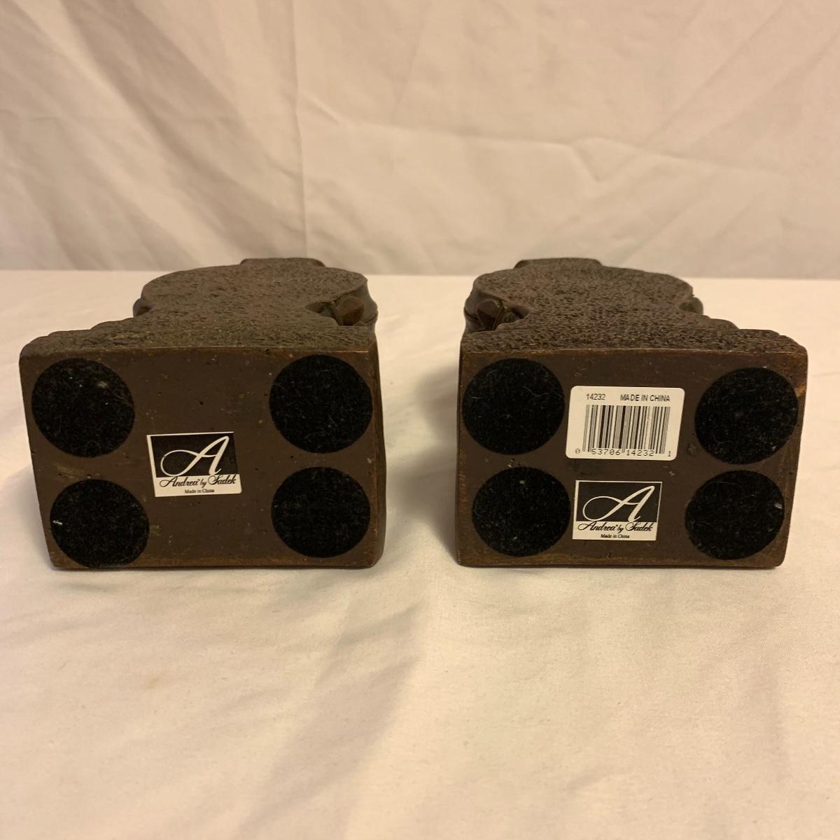 This lot consists of a needlepoint wall hanging, a ribbon wall hanging, bookends, a ceramic vase, and a music box. The wall hanging has a lovely array of red and yellow flowers. It has a metal hoop for hanging. The back is soft pink velvet. It measures 44” x 8”. There is a golden colored ribbon wall hanging as well. The bookends are heavy and urn-shaped. They have the appearance of tarnished copper. They are 7” tall. The ceramic vase has a lovely nature scene with two people and a lamb by a pond. It measures 6.25” tall. The music box is white ceramic with golden embellishments. It sits atop a wooden stand. Shipping available.
