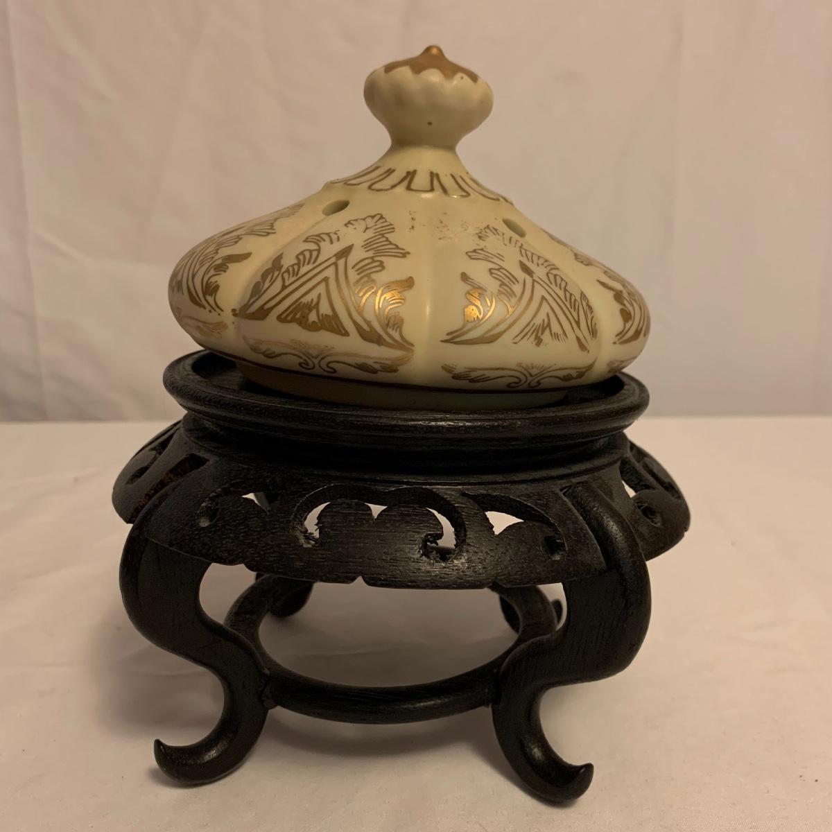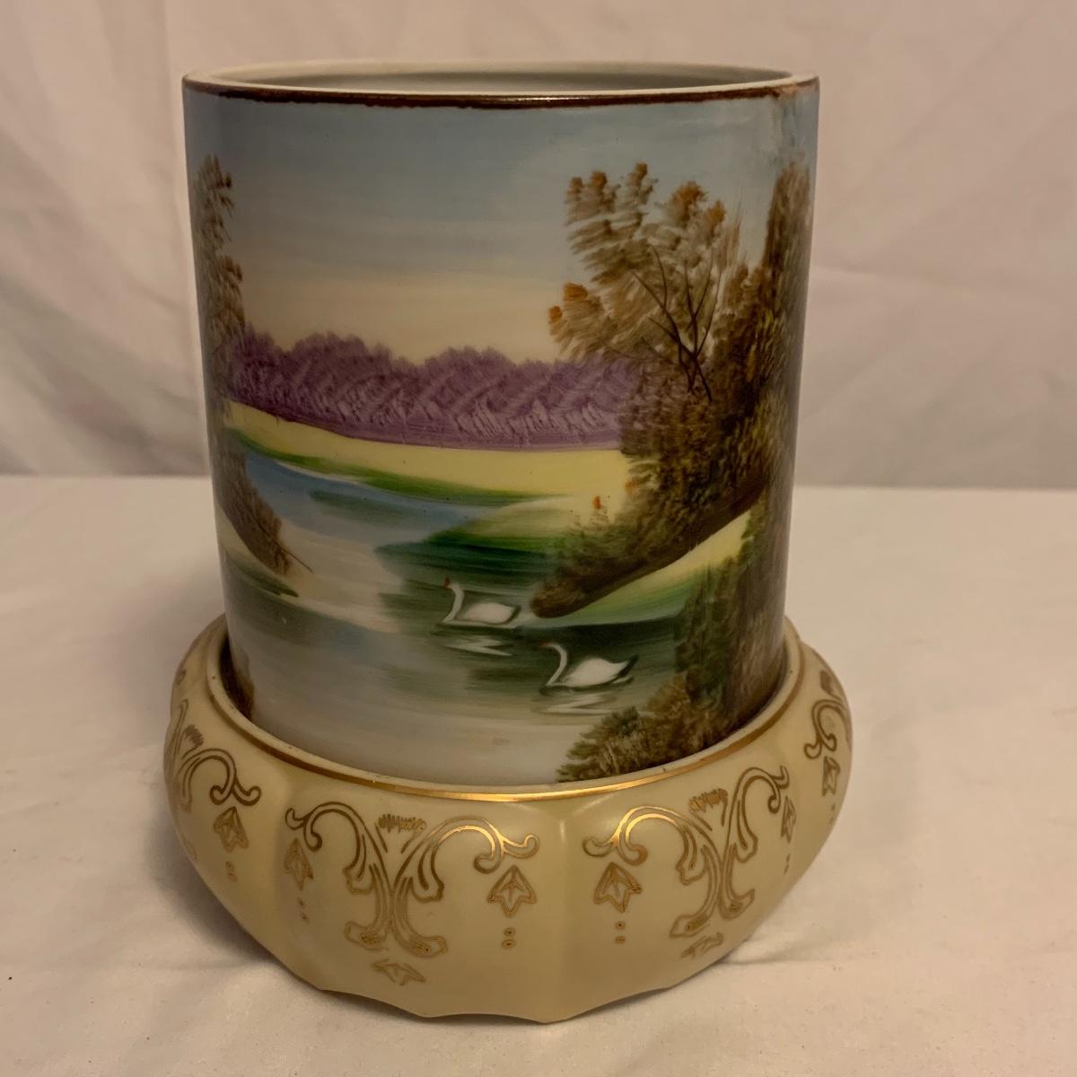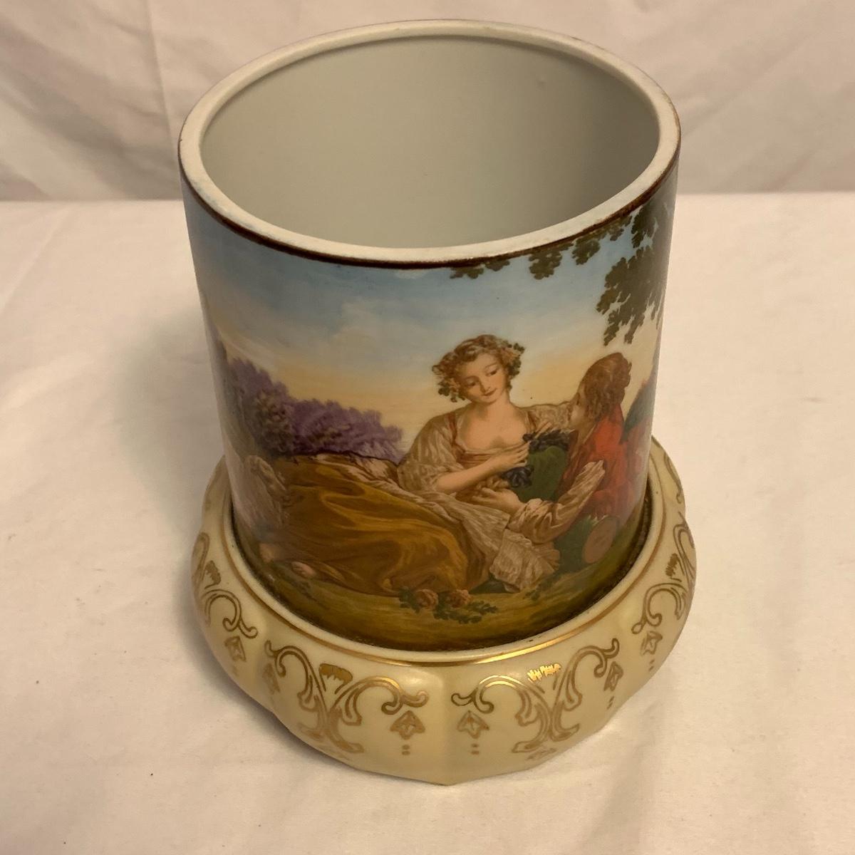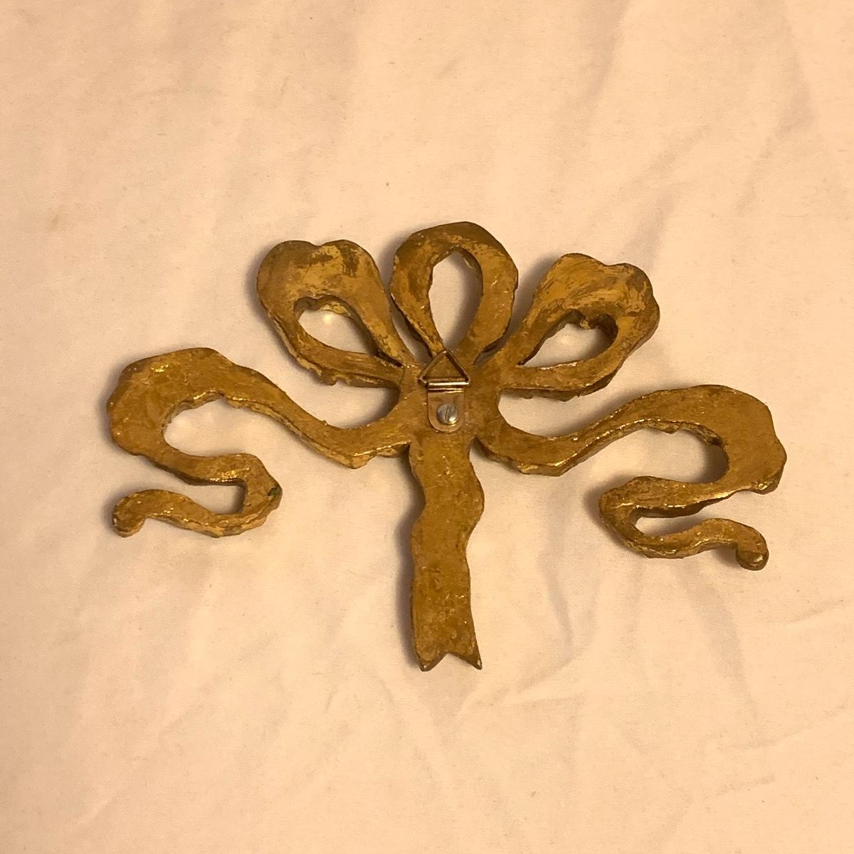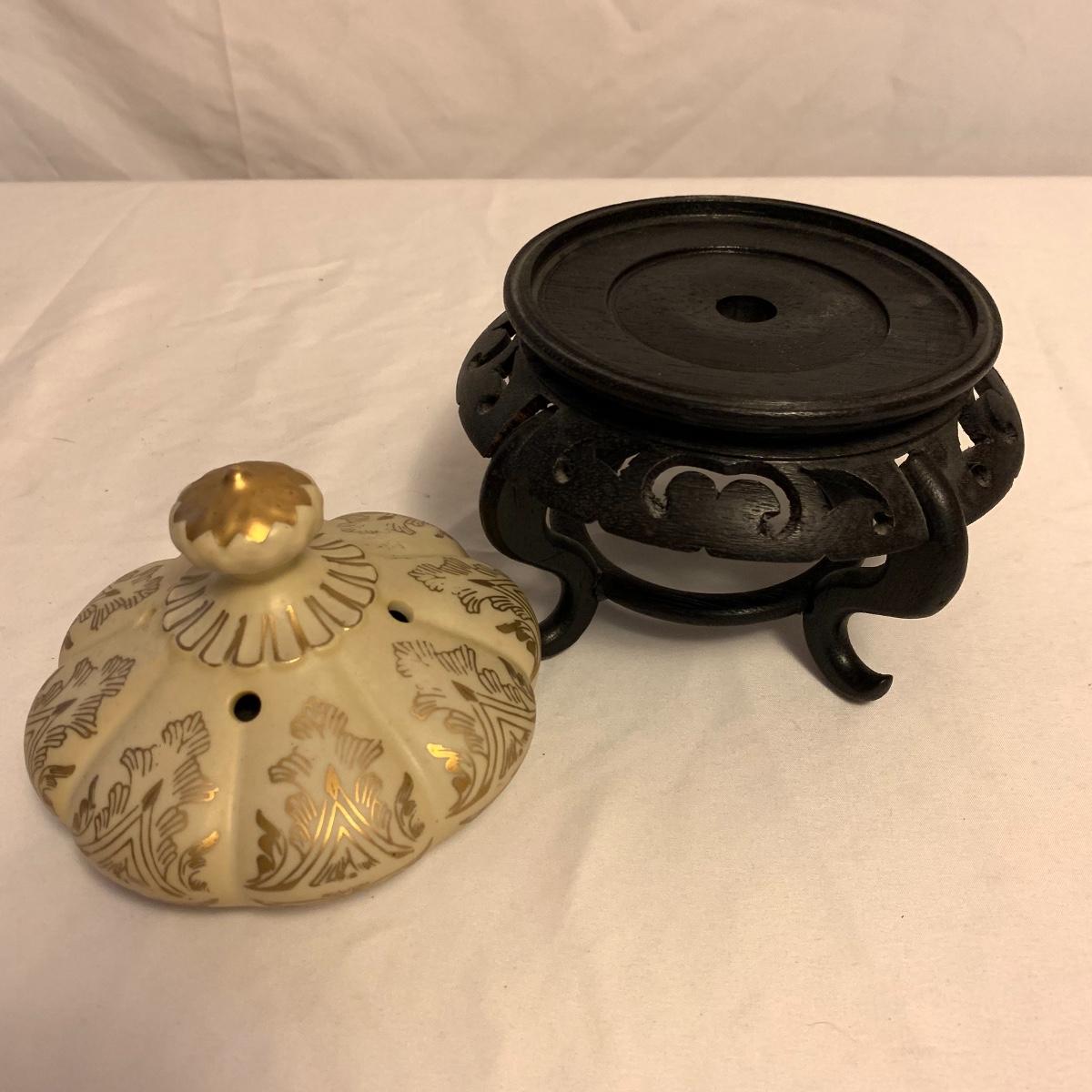 This lot consists of a needlepoint wall hanging, a ribbon wall hanging, bookends, a ceramic vase, and a music box. The wall hanging has a lovely array of red and yellow flowers. It has a metal hoop for hanging. The back is soft pink velvet. It measures 44” x 8”. There is a golden colored ribbon wall hanging as well. The bookends are heavy and urn-shaped. They have the appearance of tarnished copper. They are 7” tall. The ceramic vase has a lovely nature scene with two people and a lamb by a pond. It measures 6.25” tall. The music box is white ceramic with golden embellishments. It sits atop a wooden stand. Shipping available.