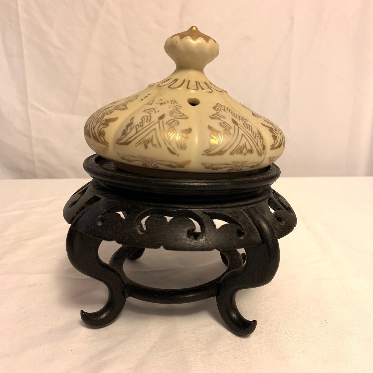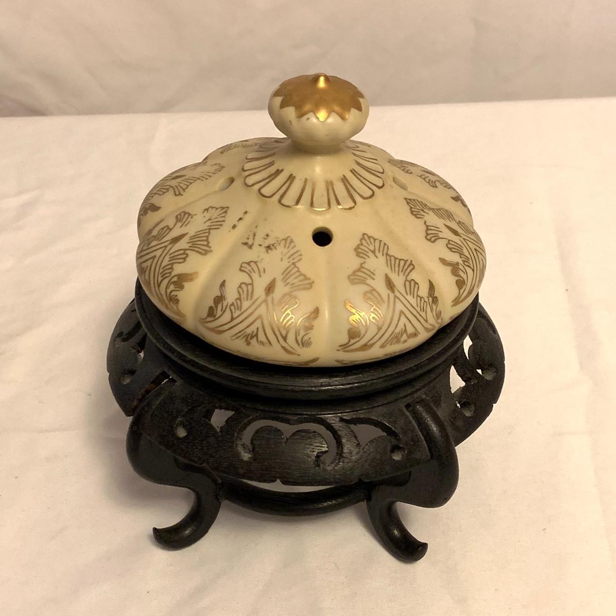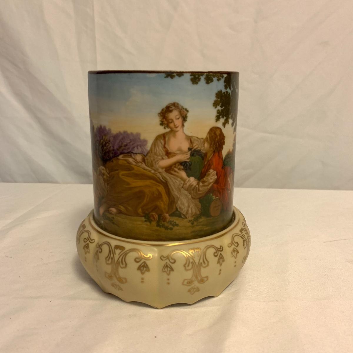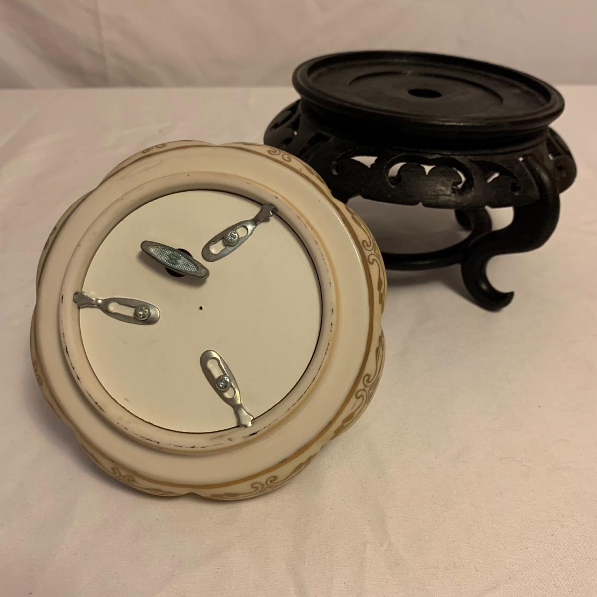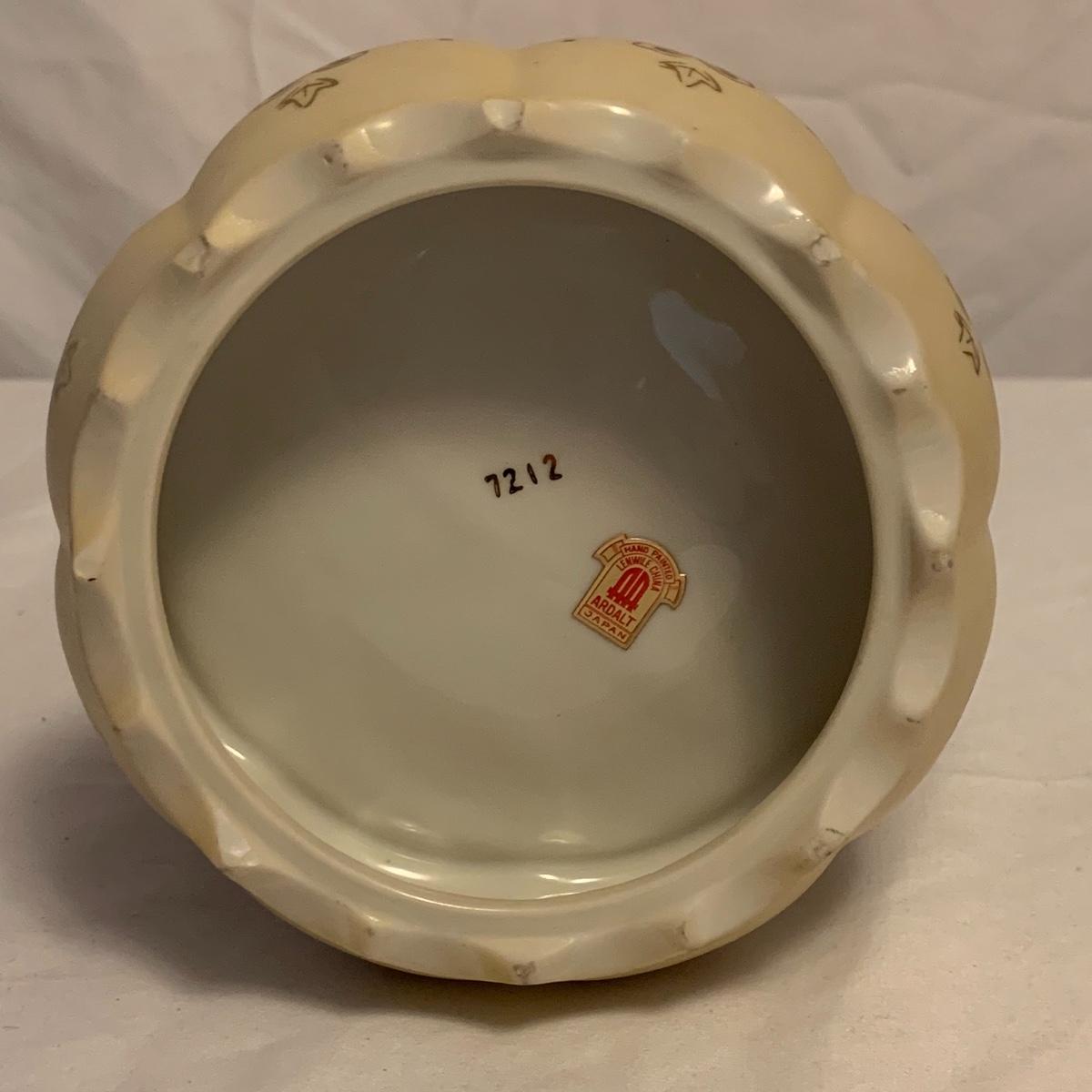 This lot consists of a needlepoint wall hanging, a ribbon wall hanging, bookends, a ceramic vase, and a music box. The wall hanging has a lovely array of red and yellow flowers. It has a metal hoop for hanging. The back is soft pink velvet. It measures 44” x 8”. There is a golden colored ribbon wall hanging as well. The bookends are heavy and urn-shaped. They have the appearance of tarnished copper. They are 7” tall. The ceramic vase has a lovely nature scene with two people and a lamb by a pond. It measures 6.25” tall. The music box is white ceramic with golden embellishments. It sits atop a wooden stand. Shipping available.