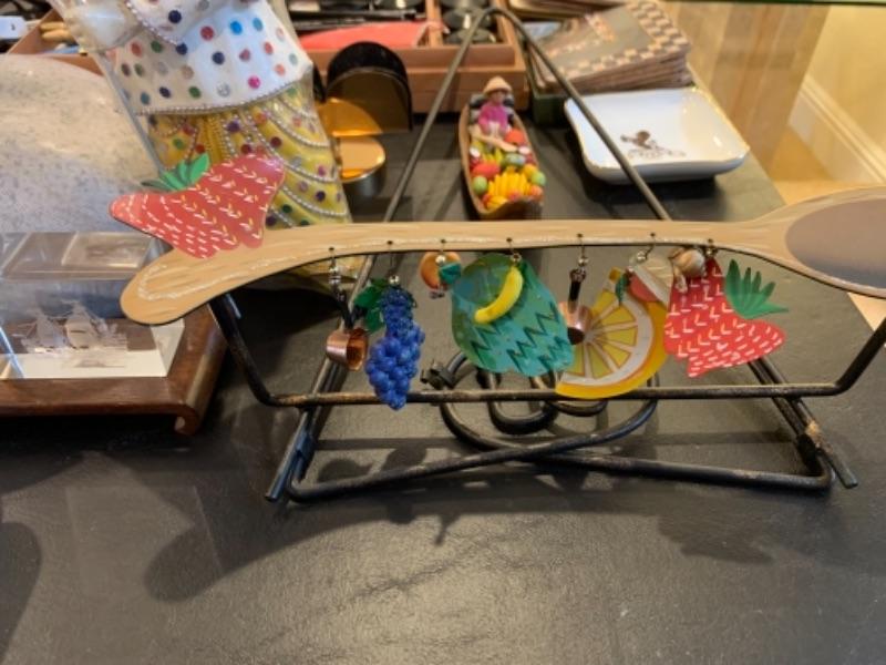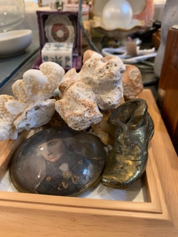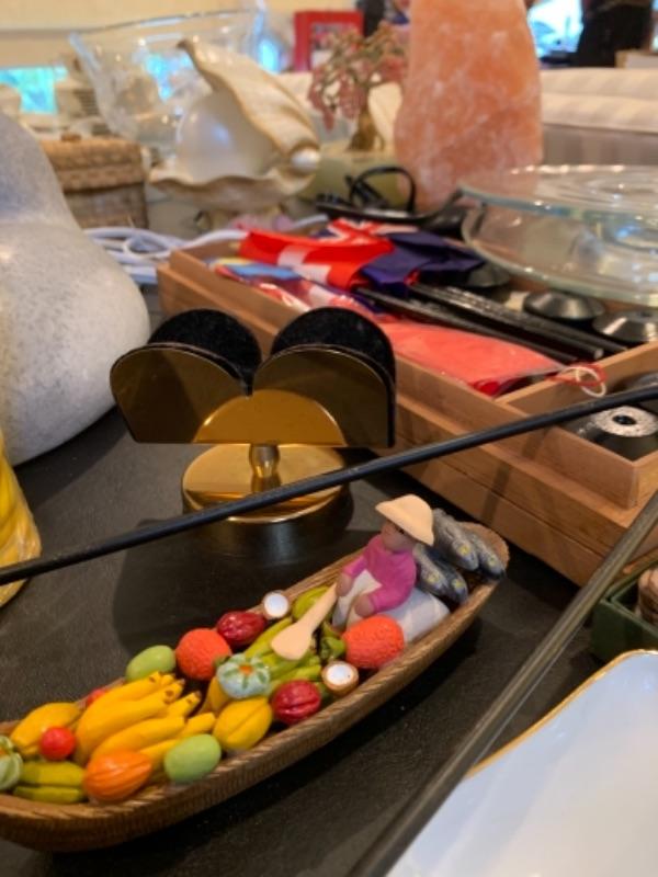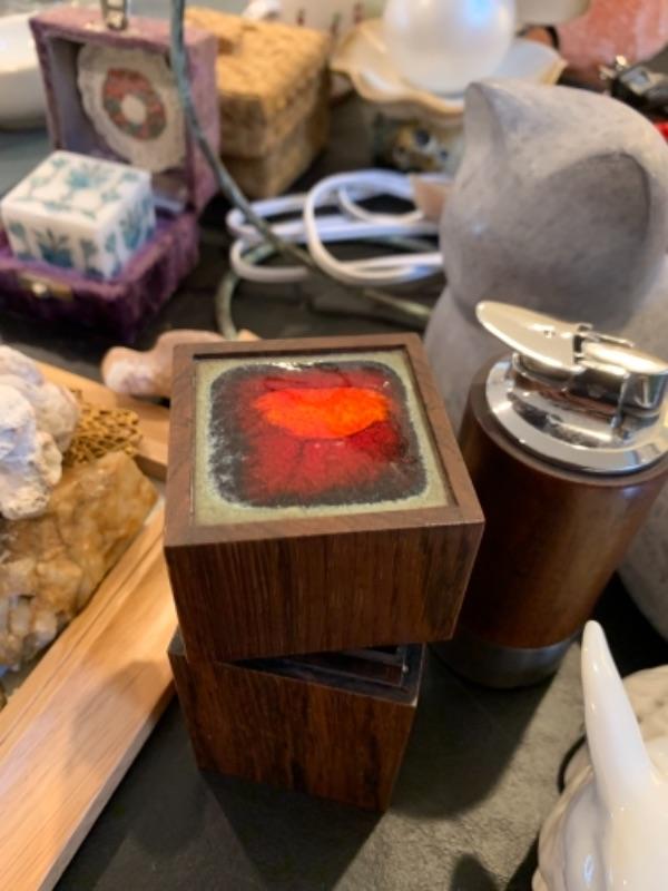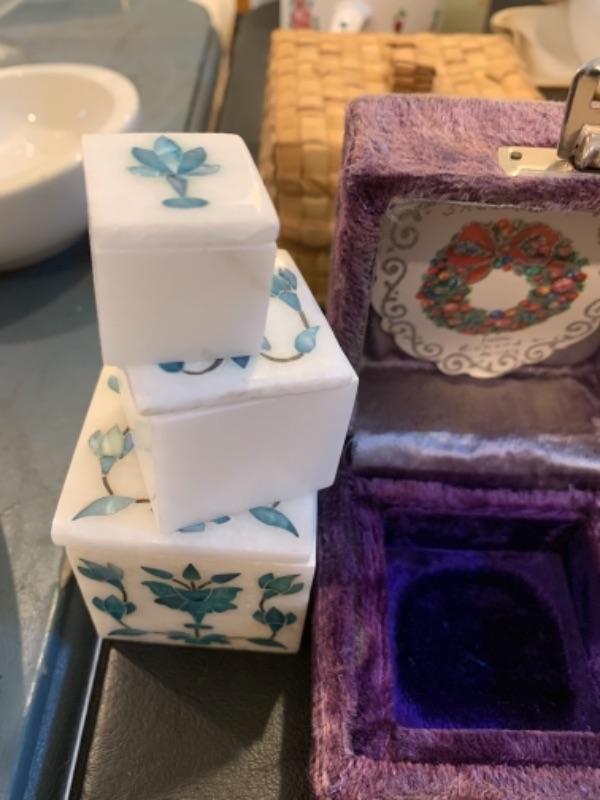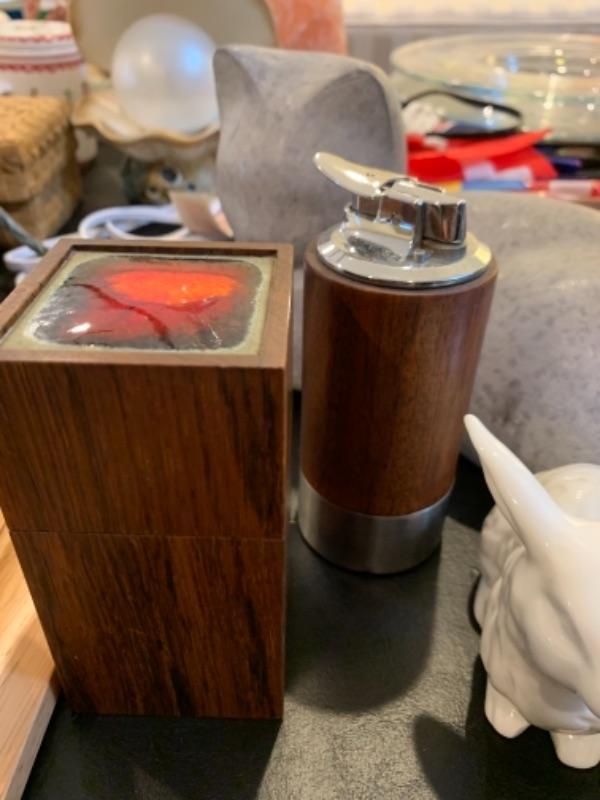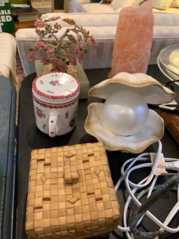 Lot 37. Nest of boxes, Himalayan salt lamp, table lamps, figurine, coasters, flags, mid-century Ronson table lighter, stone cat figure, etc.--$95