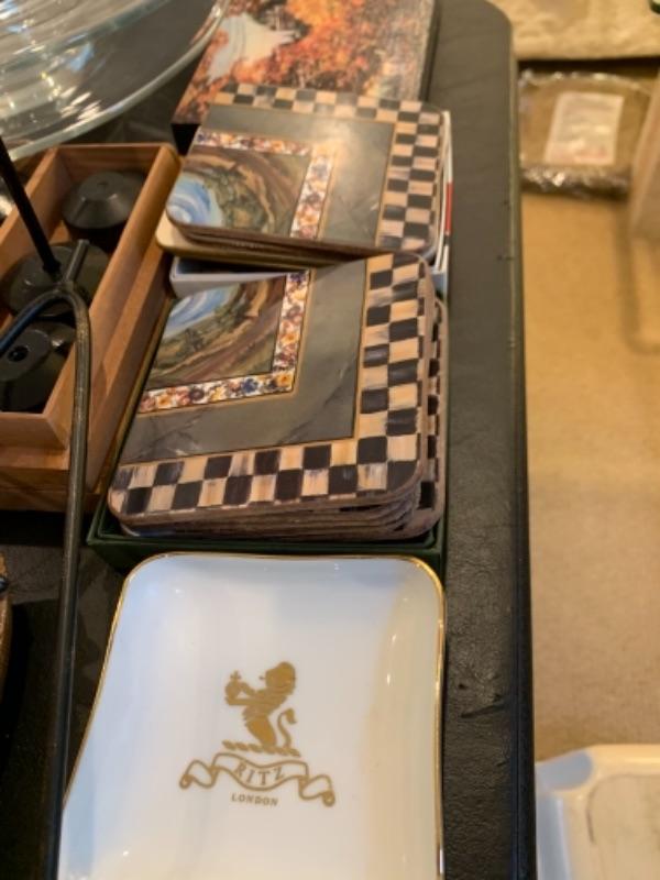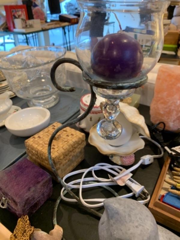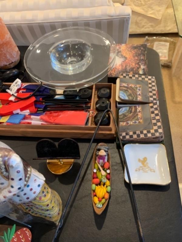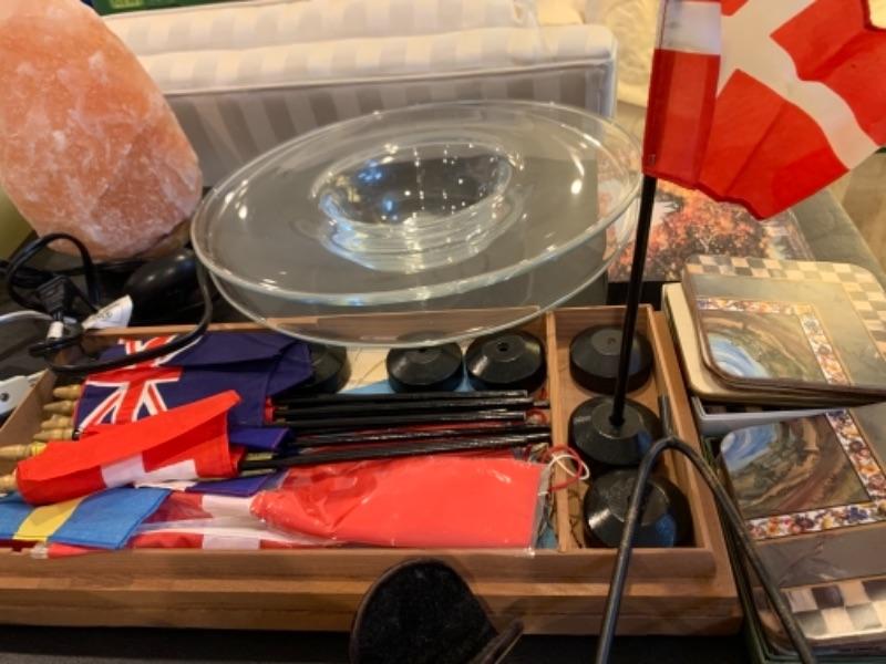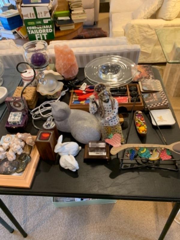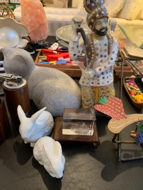 Lot 37. Crystal plate, nest of boxes, jade plant, Himalayan salt lamp, porcelain rabbits, table lamps, figurine, coasters, international flag set, mid-century Ronson table lighter, stone cat figure, etc.--$95