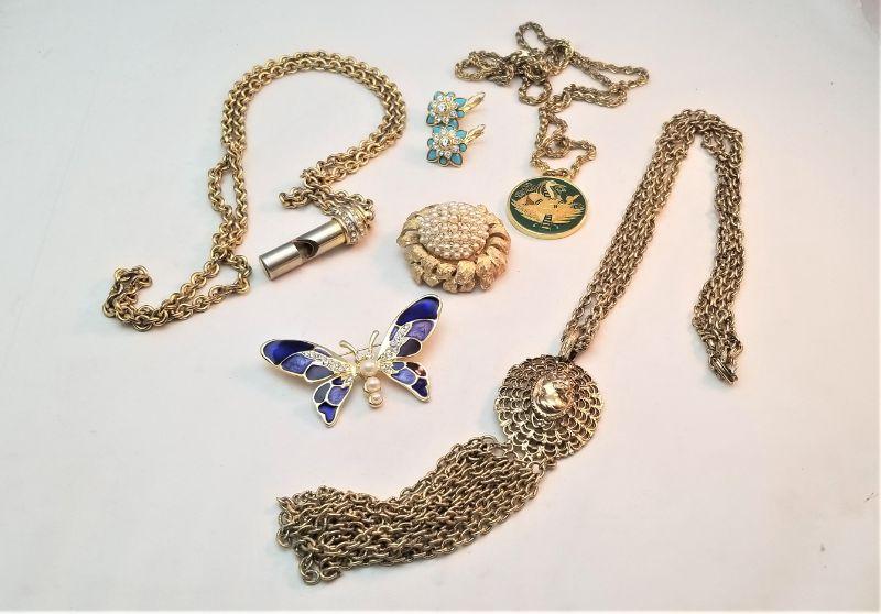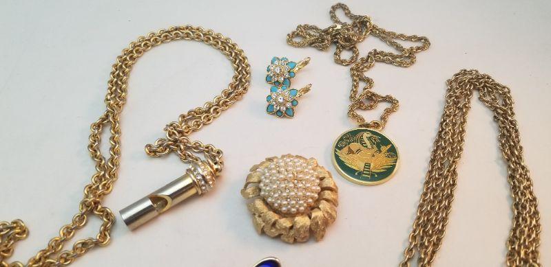 You get all you see here - Thoth 2001 "Heavy" doubloon on chain - Gold tone "cameo" on 24" chain - HAR Gold tone "pearl" brooch - 32" gold tone chain with a pendant in the form of a police whistle set with CZs - A pair of pierced earrings set with faux Turquoise, and a Butterfly brooch (2.5" tall).