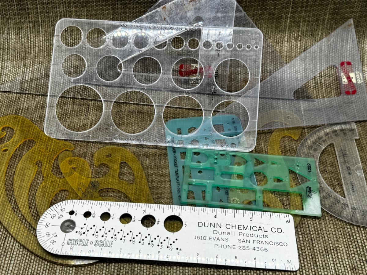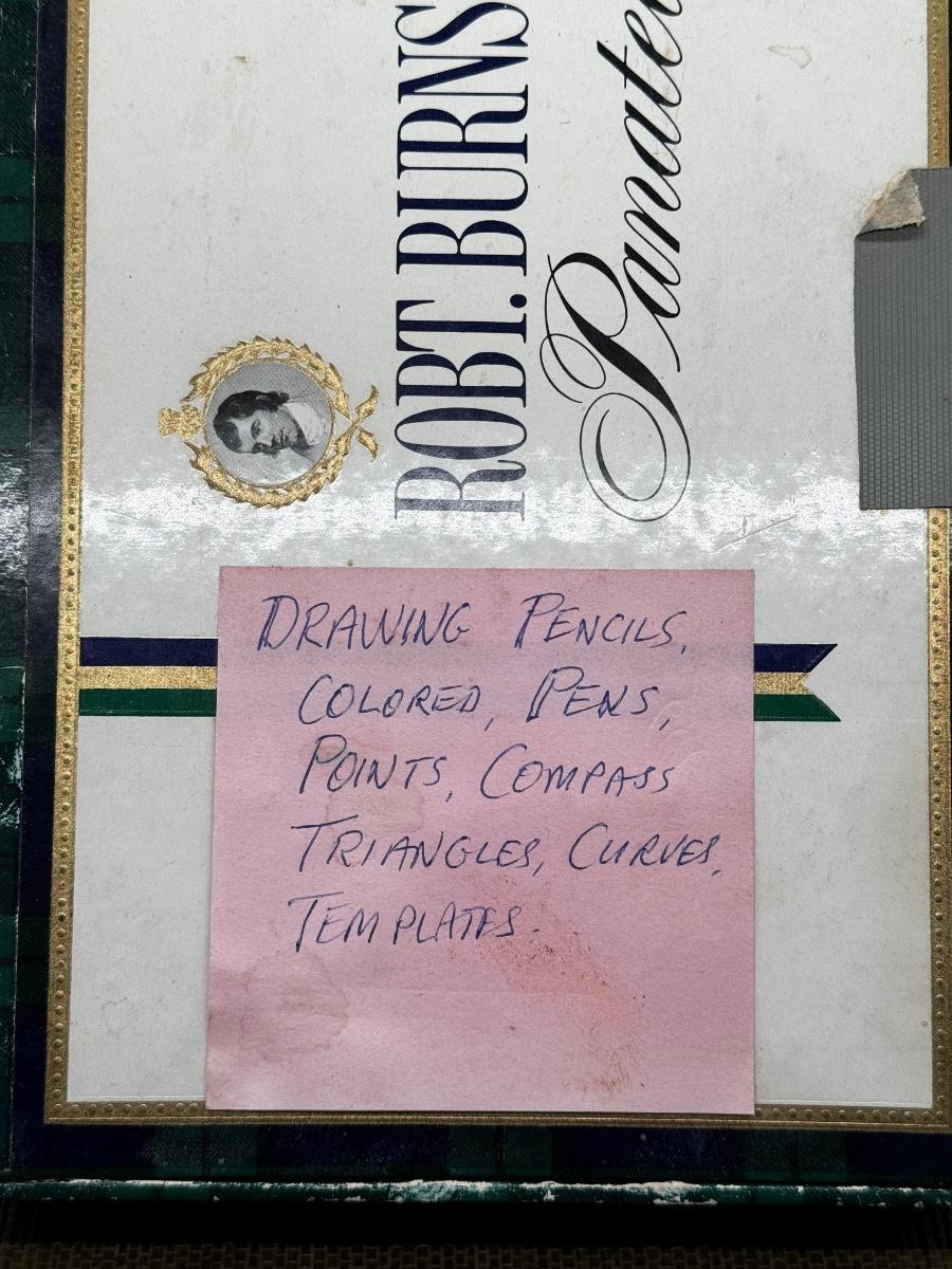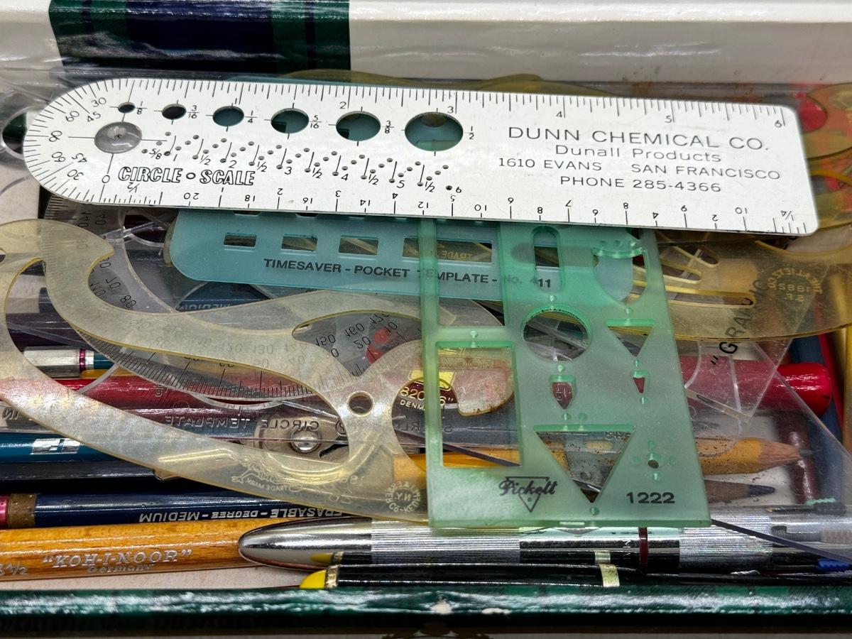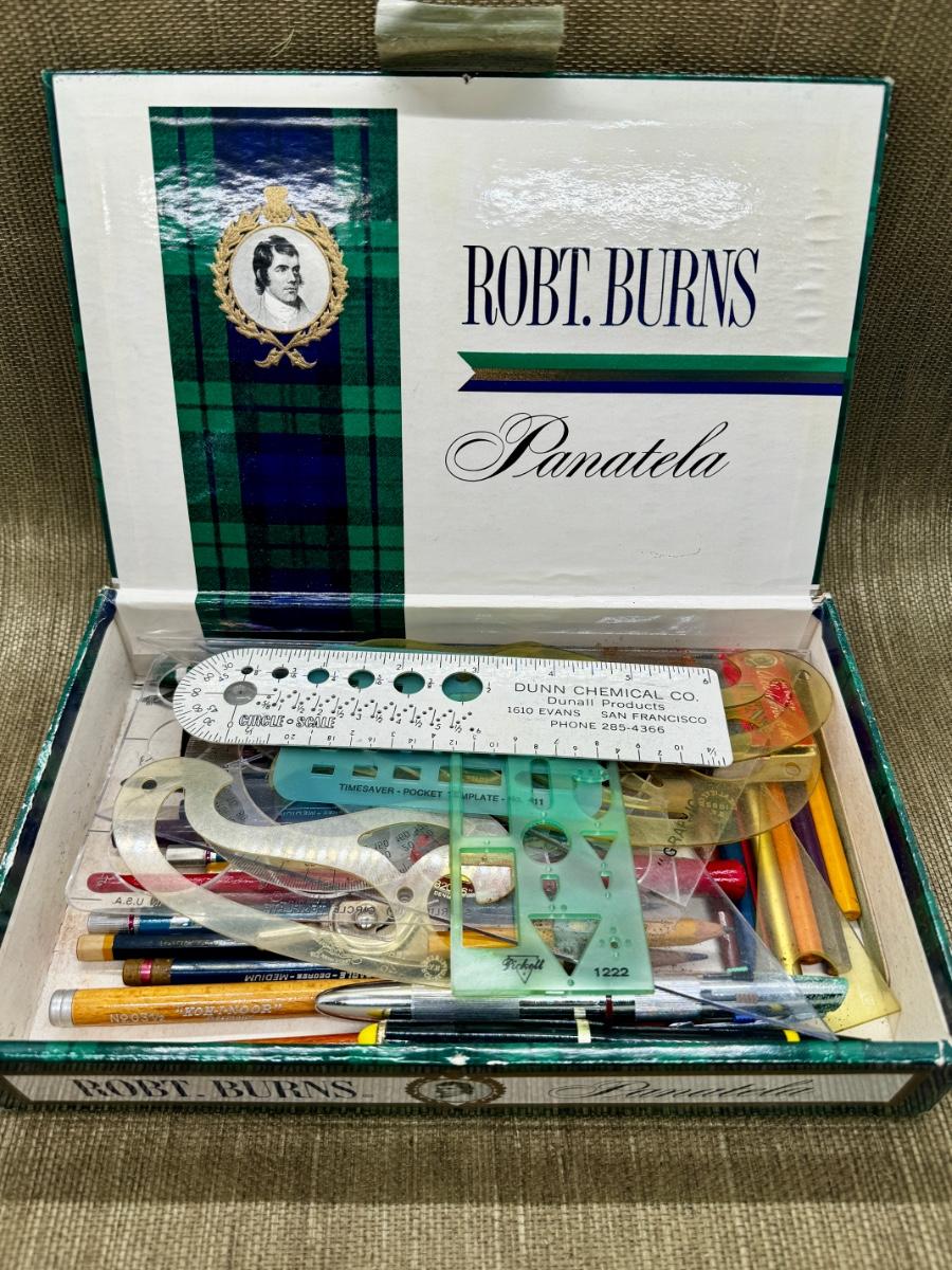 LOT 37 - Vintage Office Supplies Cigar Box Lot - This collection was found in the office of an estate from San Rafael that we are currently emptying. It's a sweet collection of drawing pencils, colored pens, pen nibs, metal drawing compass, triangles, curves and templates. It includes the owner's original note on the cigar box. All are in as is condition so please take a close look at the photos.