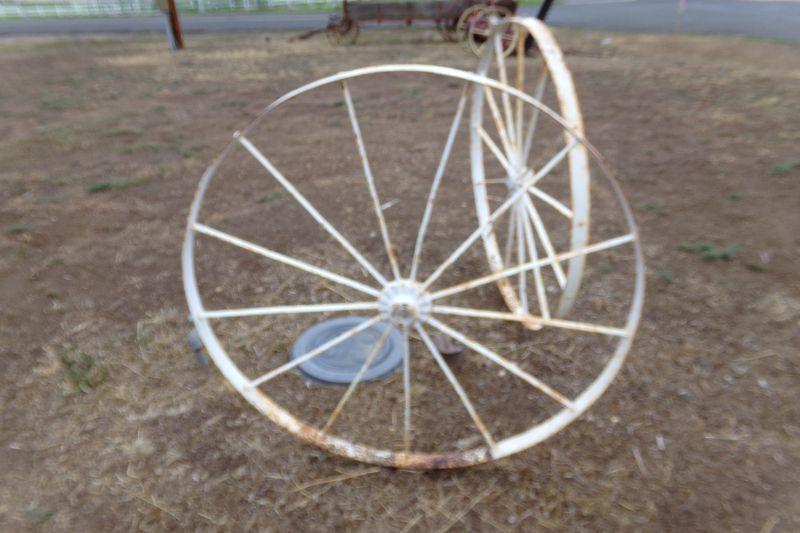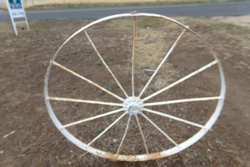 THIS LOT IS FOR 1 OF THE METAL WHEELS THAT MEASURES 40" DIAMETER. 2 METAL PEGS HAVE BEEN WELDED TO THE OUTSIDE OF THE WHEEL TO HOLD THE WHEEL FIRMLY IN THE GROUND