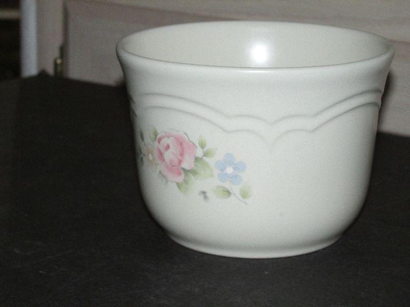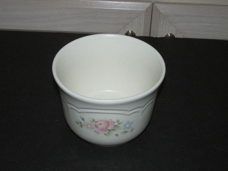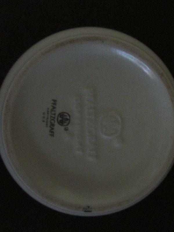 White Pfaltzgraff bowl with flower print on front. Embossed mark and print mark on bottom.