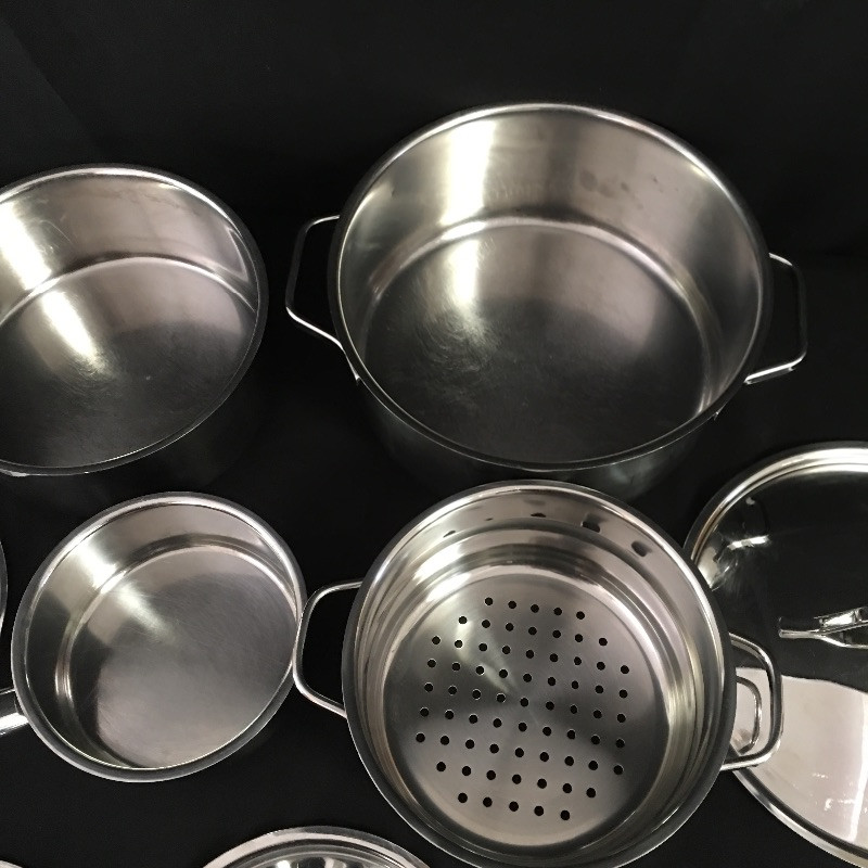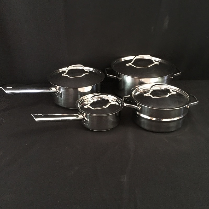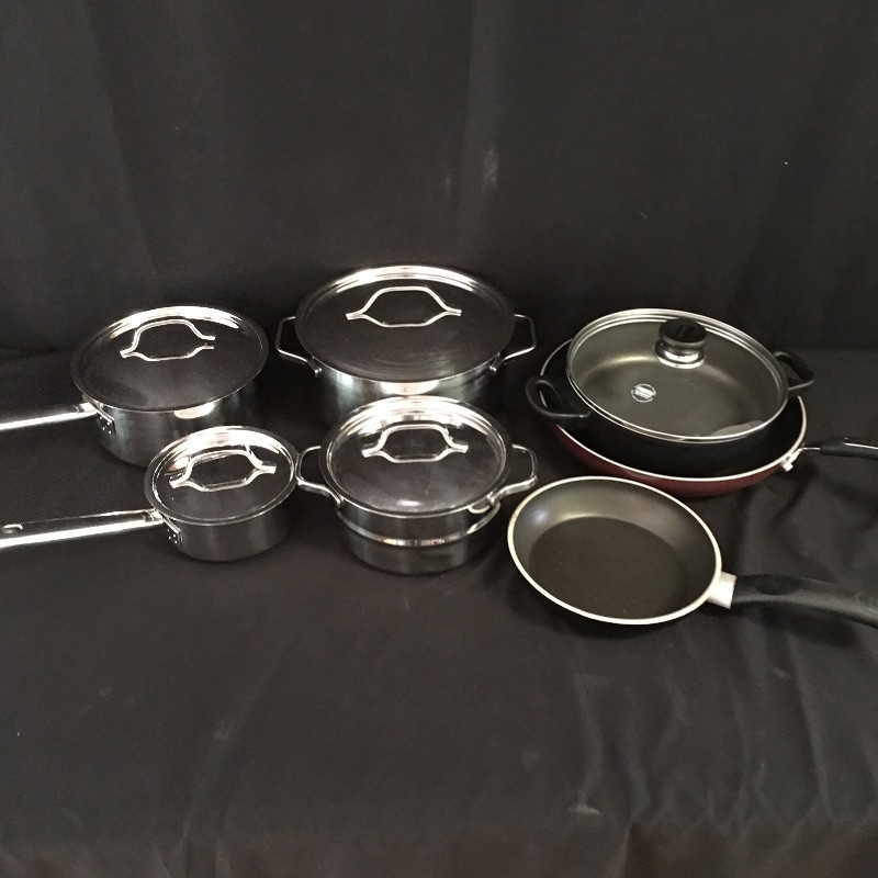These pots and pan include an eight piece Royalty set, two frying pans and one covered pot. Keep your kitchen sizzling with this selection of pots and pans. Largest frying pan measures 12”D.