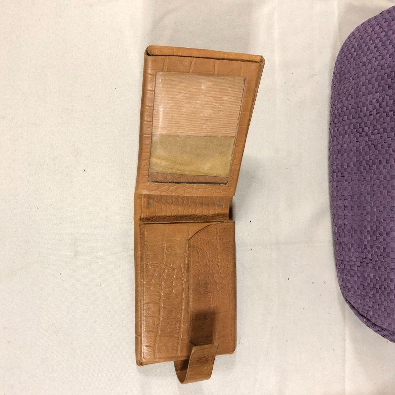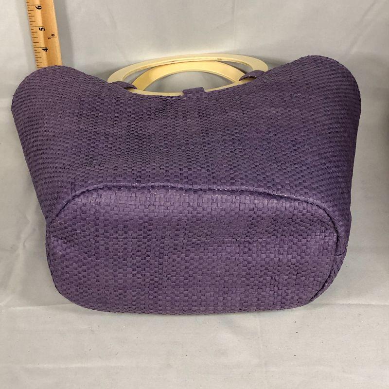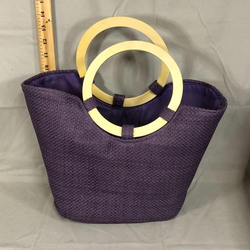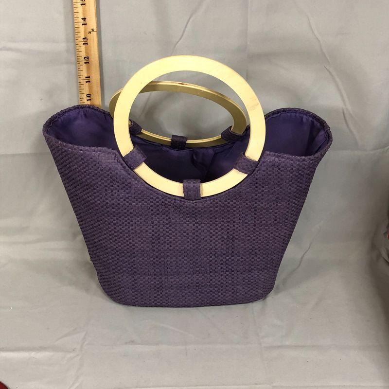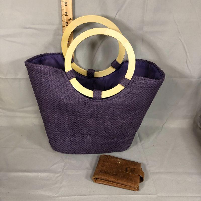 Both are in very good condition. The purse doesn't have any pockets or clasps and is made of a woven material, cotton fabric lining, and wood handles. The wallet has minor wear on the bottom fold, but otherwise looks great.