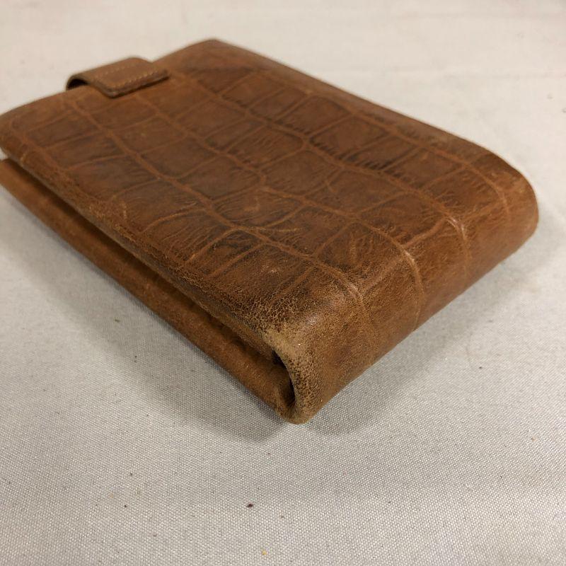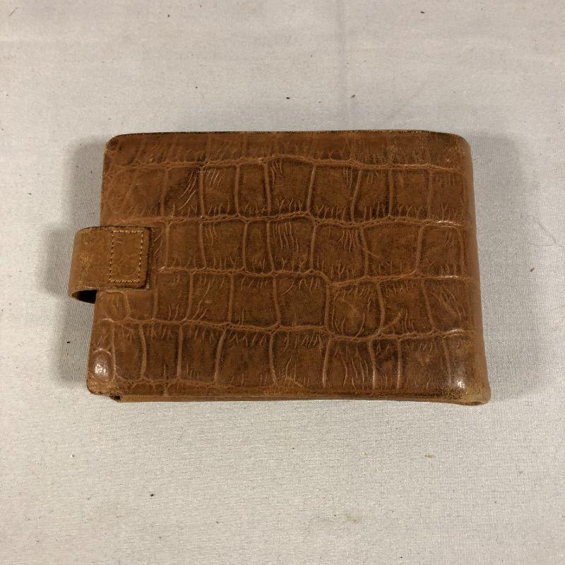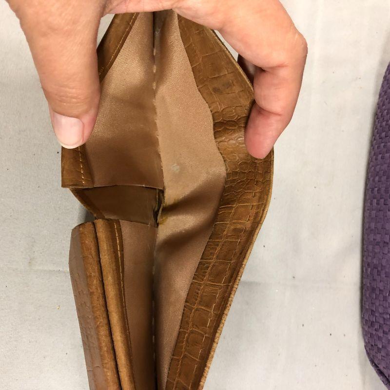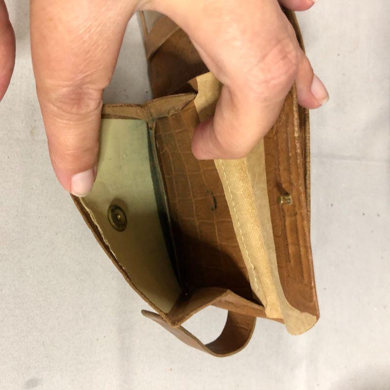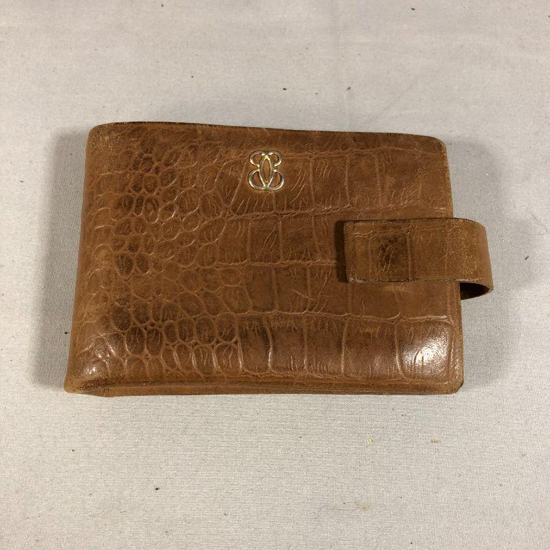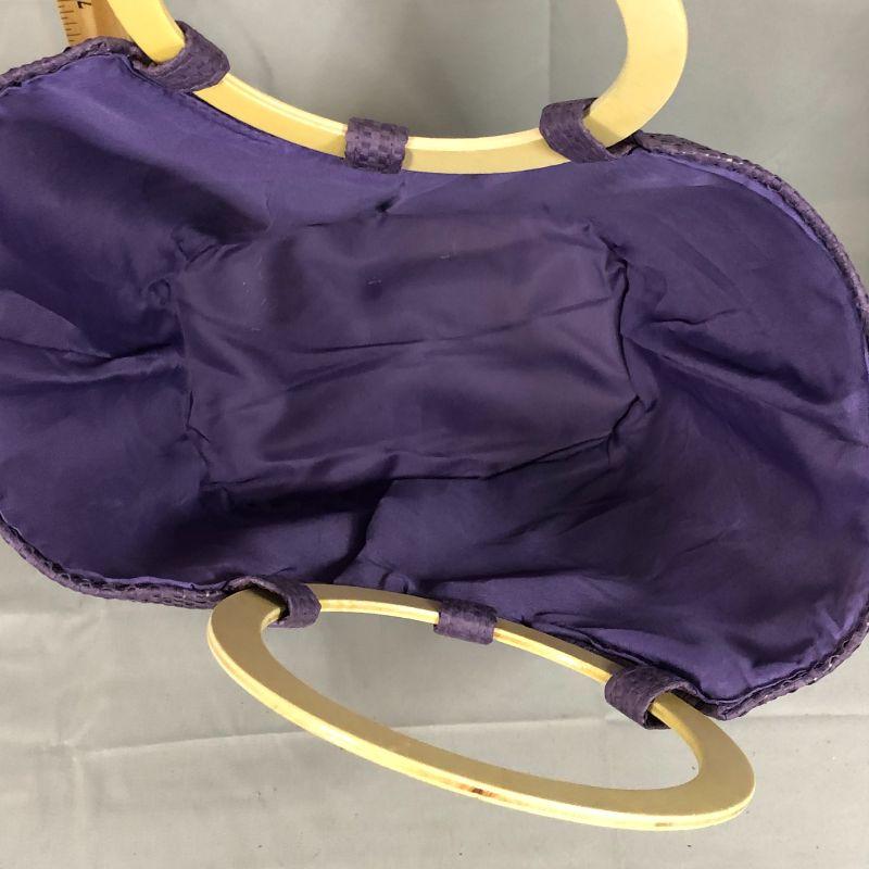 Both are in very good condition. The purse doesn't have any pockets or clasps and is made of a woven material, cotton fabric lining, and wood handles. The wallet has minor wear on the bottom fold, but otherwise looks great.