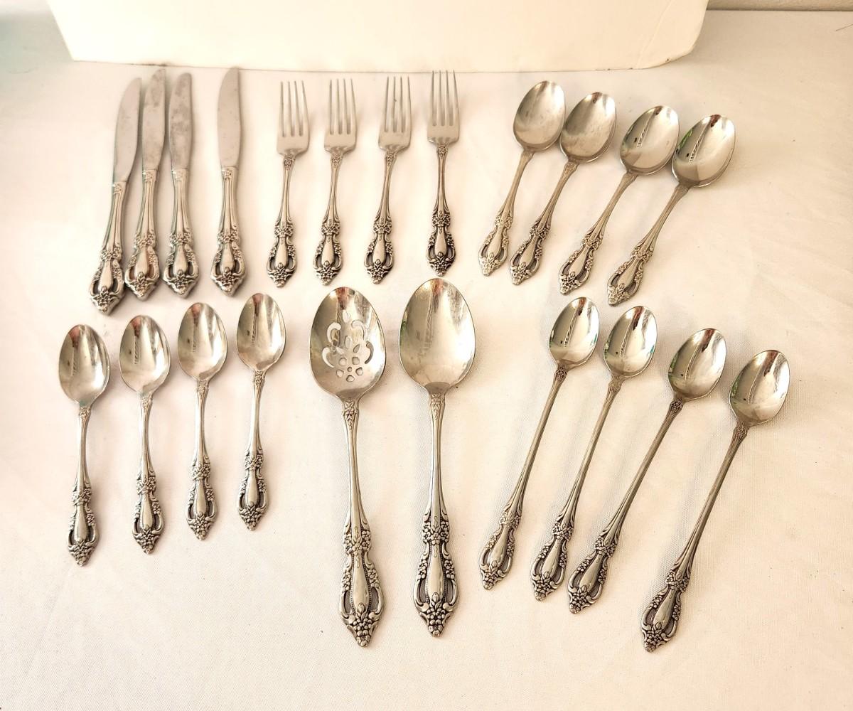 You get all you see here - 22 pieces of Oneida Stainless Flatware in the "Raphael" pattern. 4 teaspoons, 4 iced Tea spoons, slotted serving spoon, regular serving spoon, 4 tablespoons, 4 knives, 4 dinner forks. All in gently used condition.