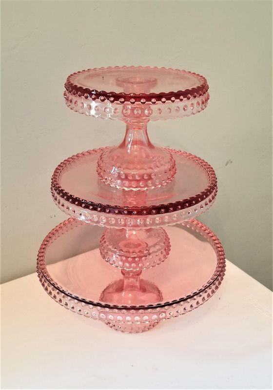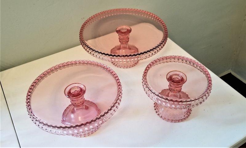 You get all you see here - contemporary - three pink glass cake plates (pedestal style) in graduated sizes. Good condition. Largest is 11" across, 5" tall, Middle is 9" across, 5" tall, and Smallest is 7" across and 5" tall. Hobnail trim.
