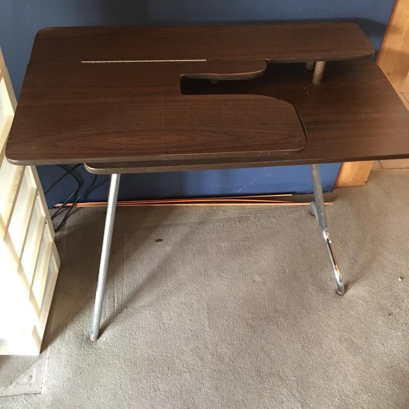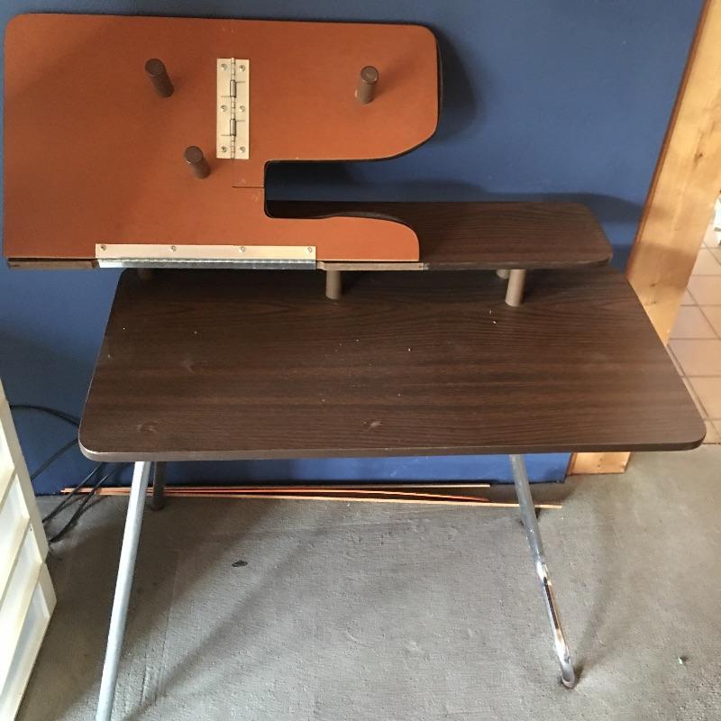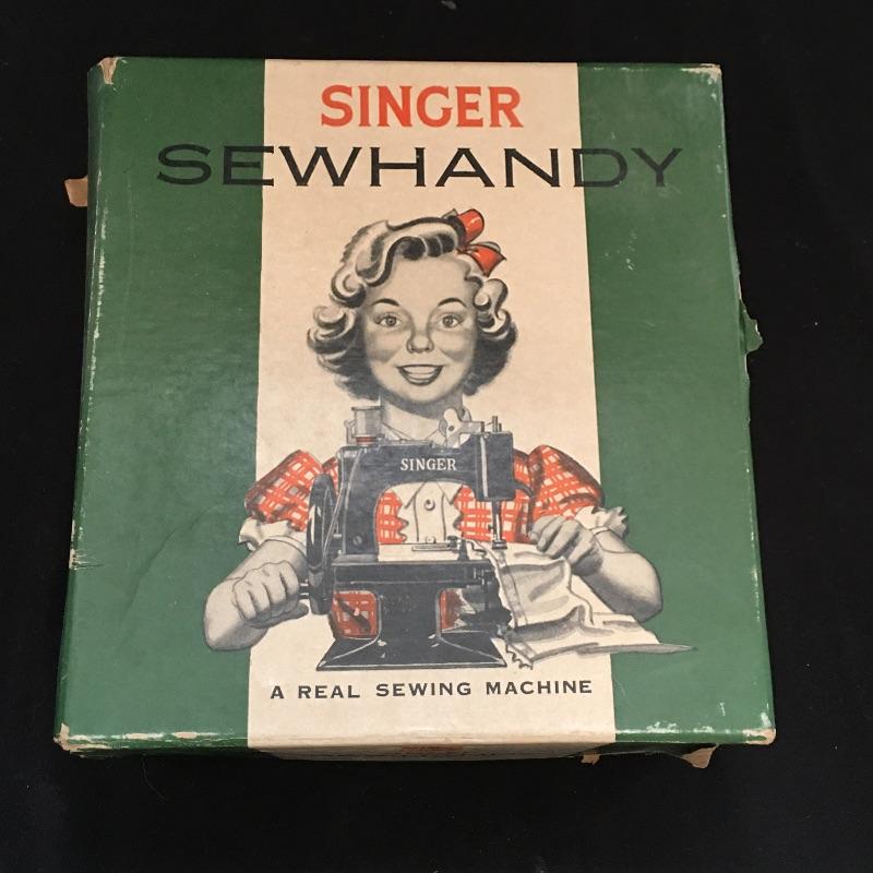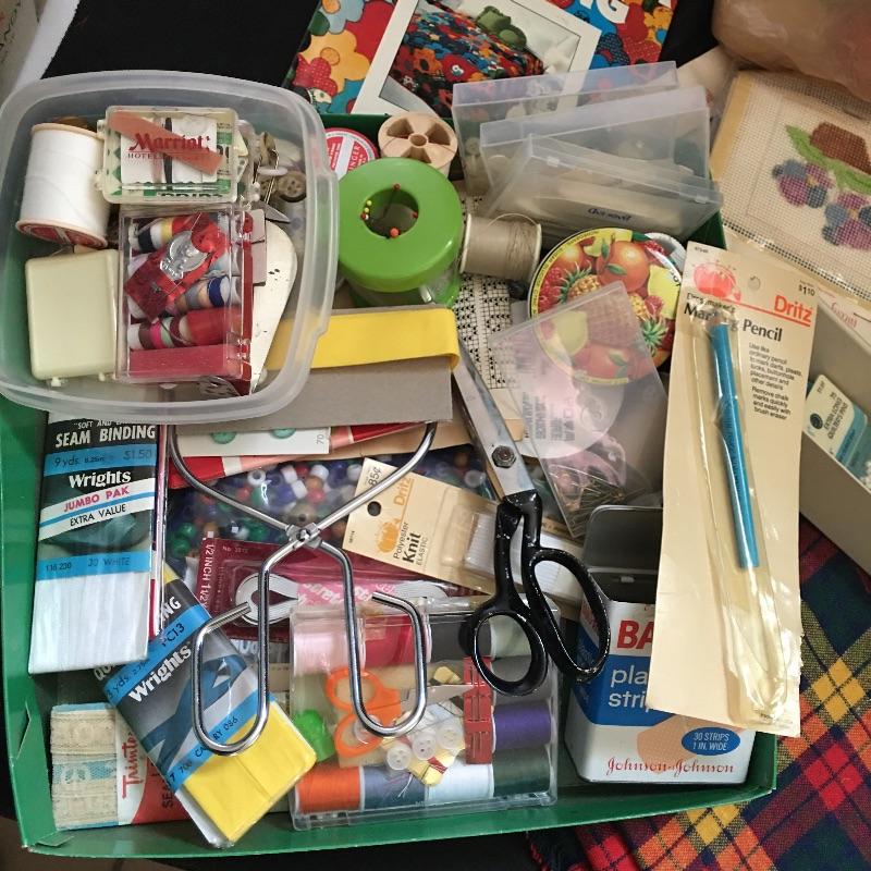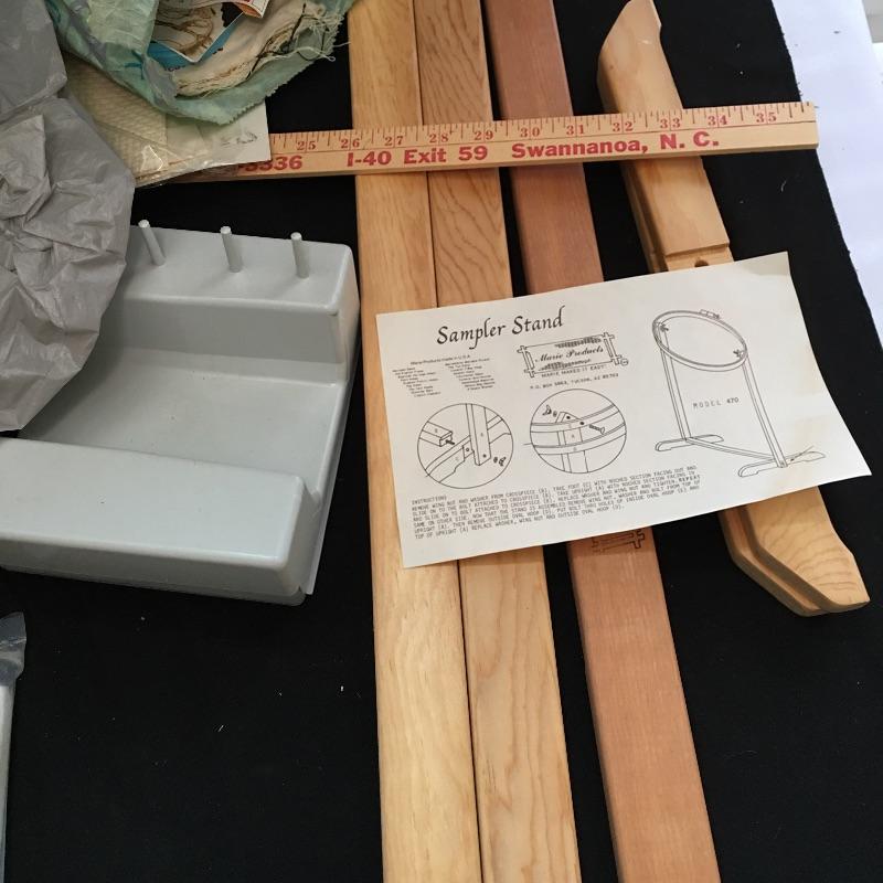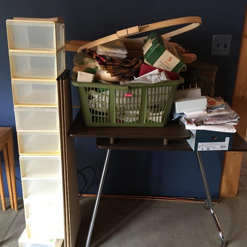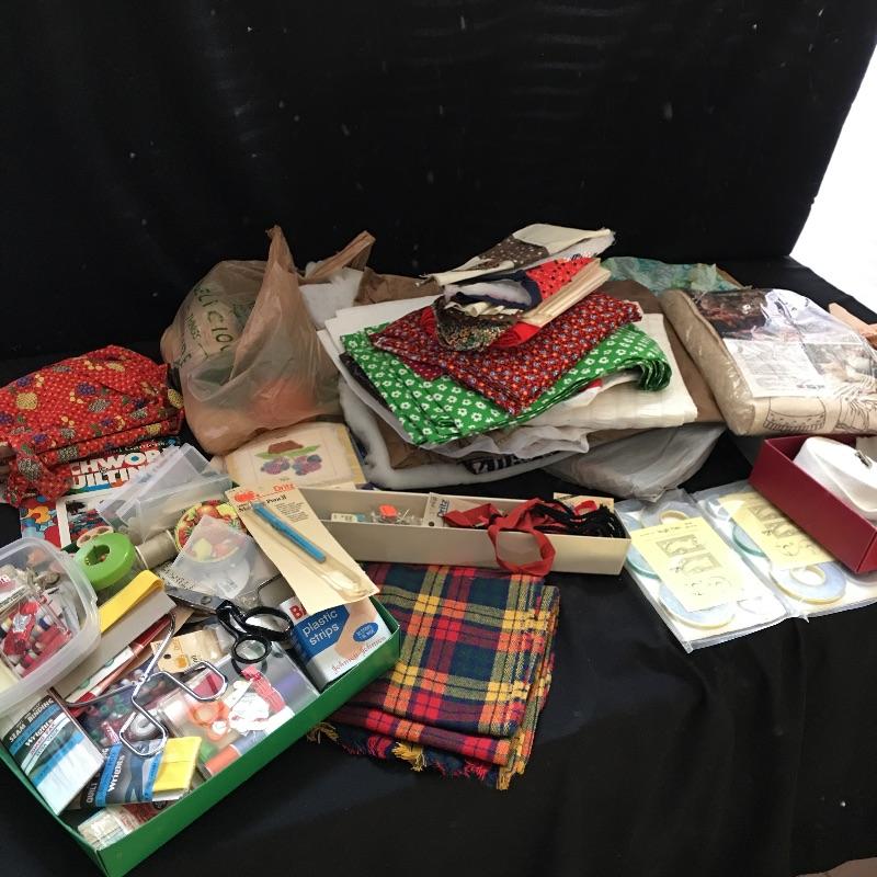 Sewing essentials. Lot includes Singer Sew-handy machine(cute little machine works with a turn of the handle) sewing machine table, fabric, thread, yarn, fabric weights, scissors and more. A great lot for the seamstress or someone just starting out their sewing/crafting career. Table measures 20.5” x 37.5” x 29.25”.