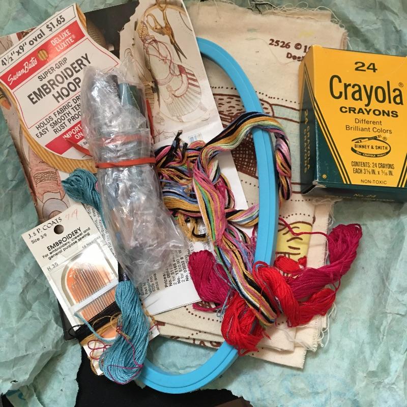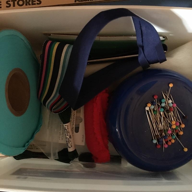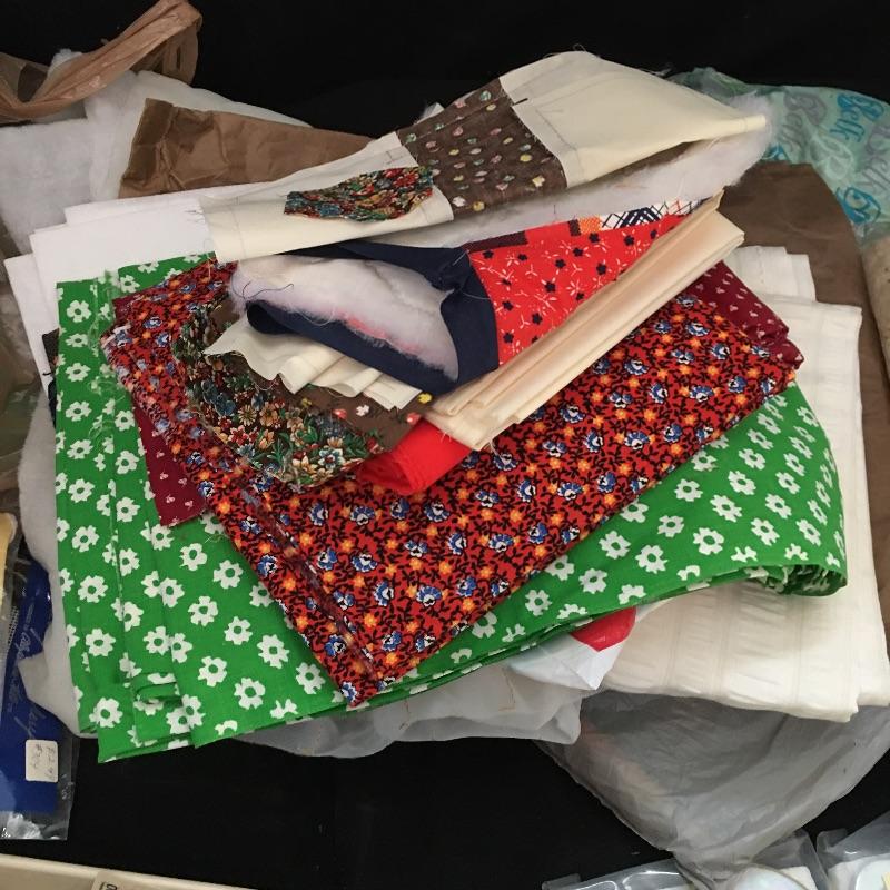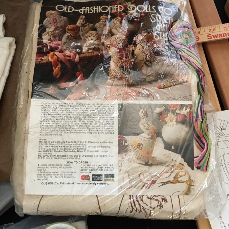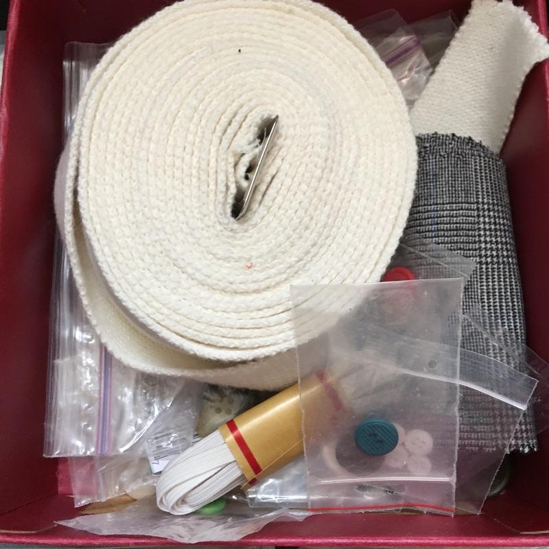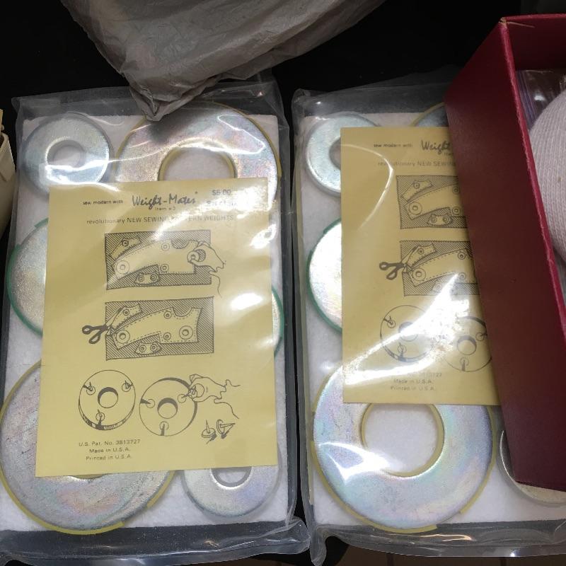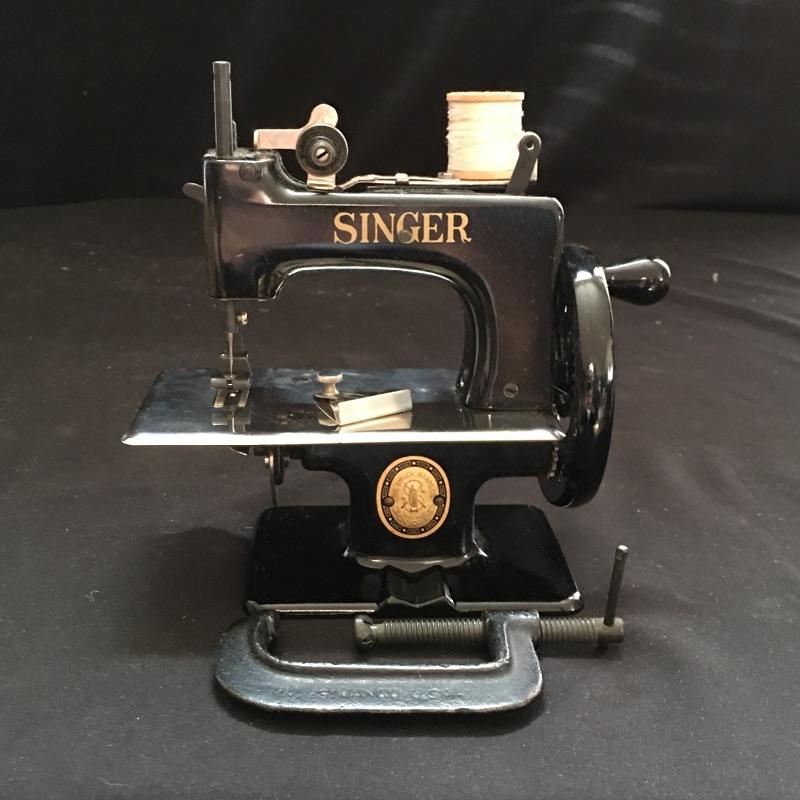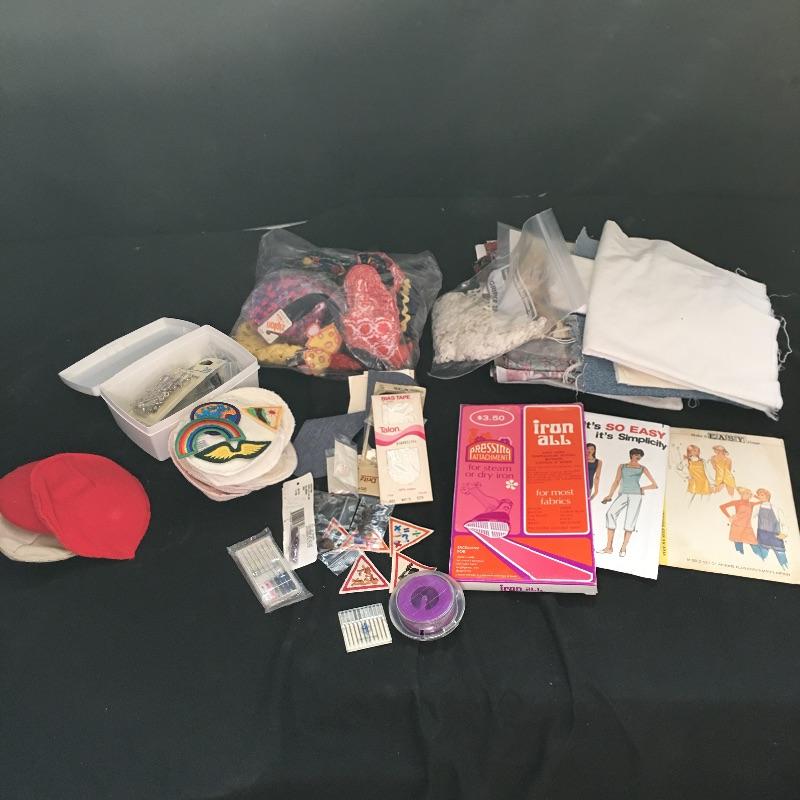 Sewing essentials. Lot includes Singer Sew-handy machine(cute little machine works with a turn of the handle) sewing machine table, fabric, thread, yarn, fabric weights, scissors and more. A great lot for the seamstress or someone just starting out their sewing/crafting career. Table measures 20.5” x 37.5” x 29.25”.