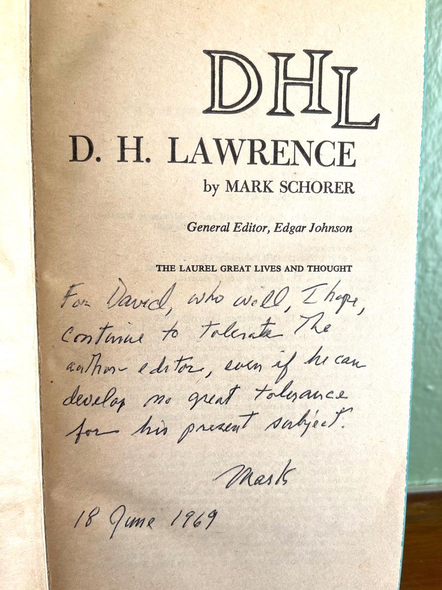 LOT 37 - D.H. Lawrence by Mark Schorer. This Paperback book is signed by the author with a personal inscription to David.. This is a paperback book published in 1968.