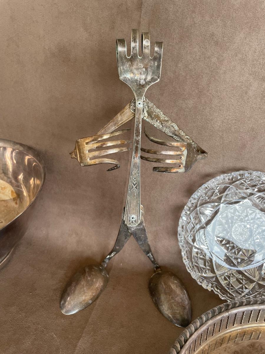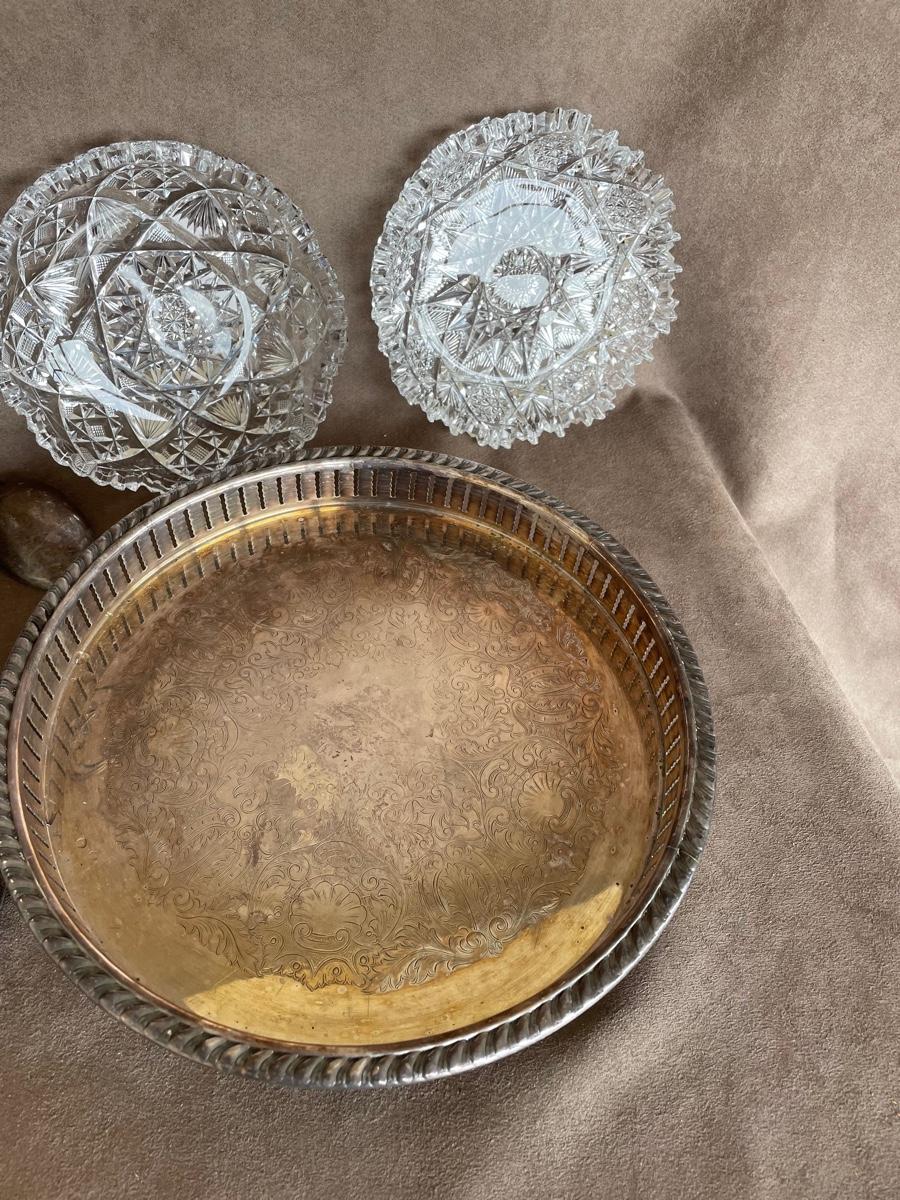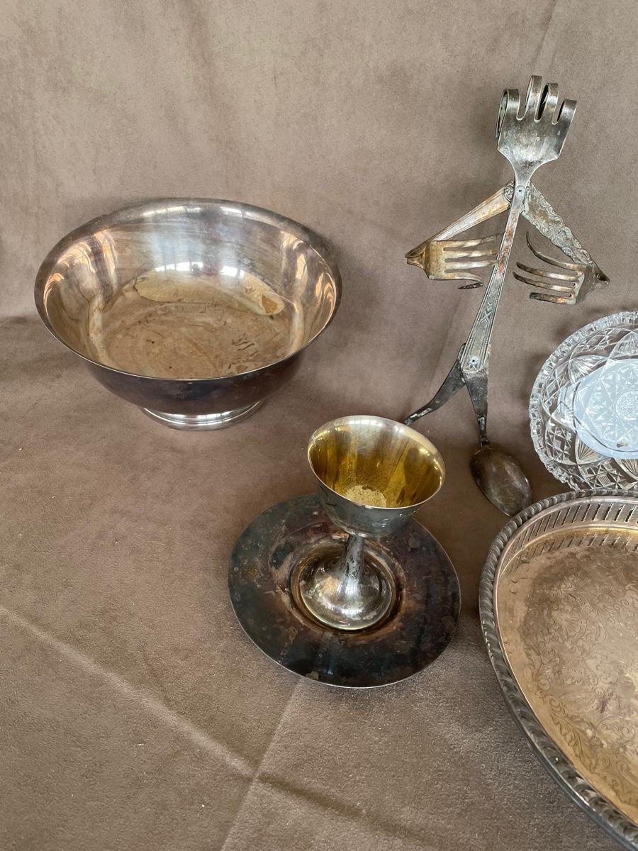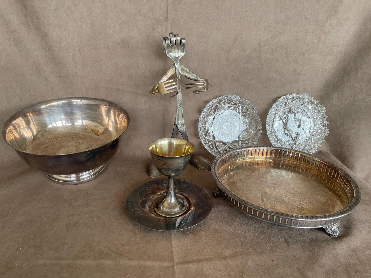 Four silver-plate pieces, 2 cut crystal small dishes and a decorative piece made from silverware
