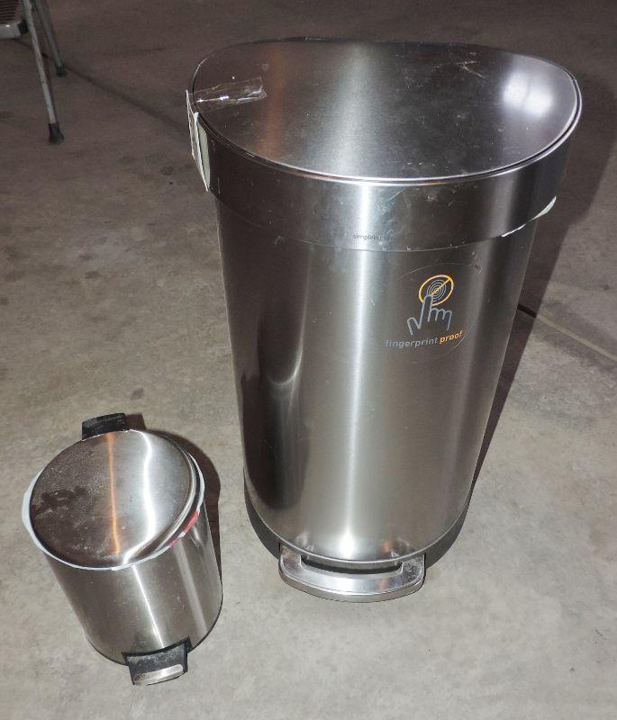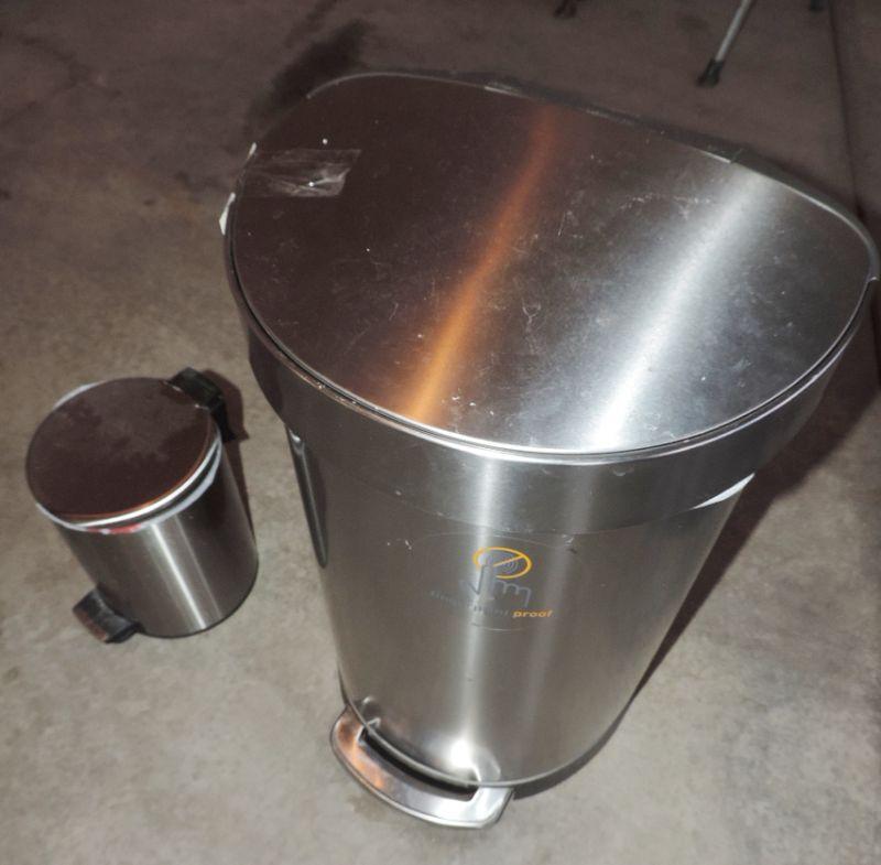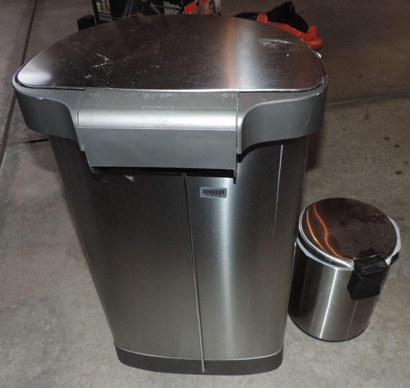 NICE SIZE KITCHEN STEP ON TRASH CAN AND A MUCH SMALLER ONE FOR THE BATHROOM OR OTHER ROOM