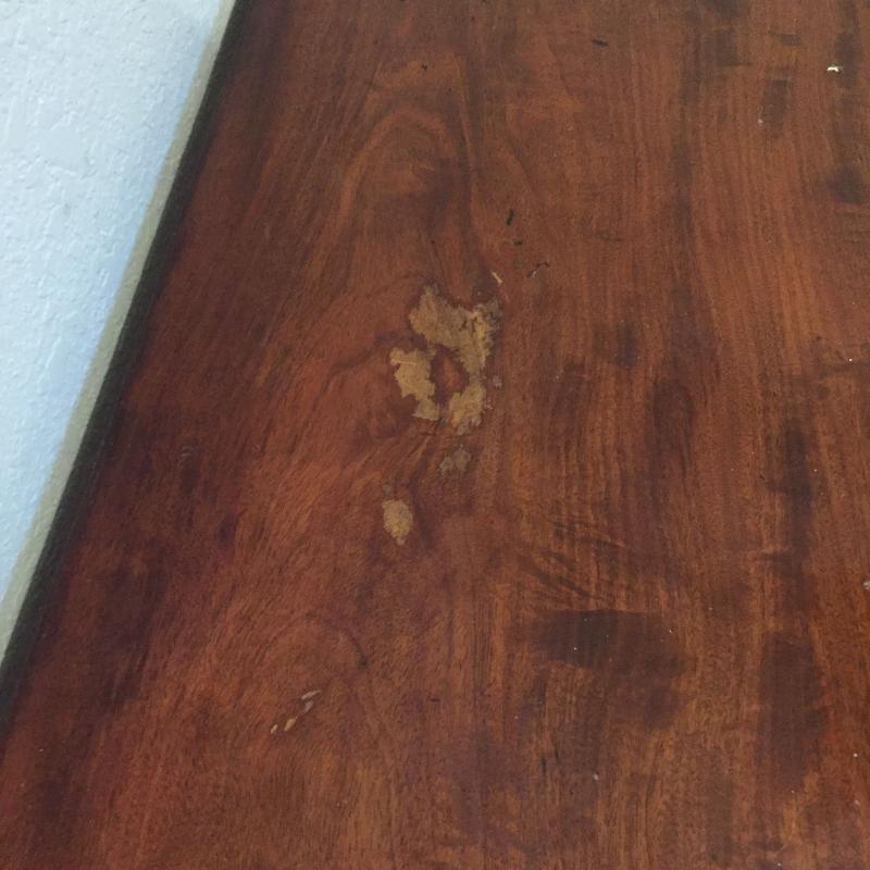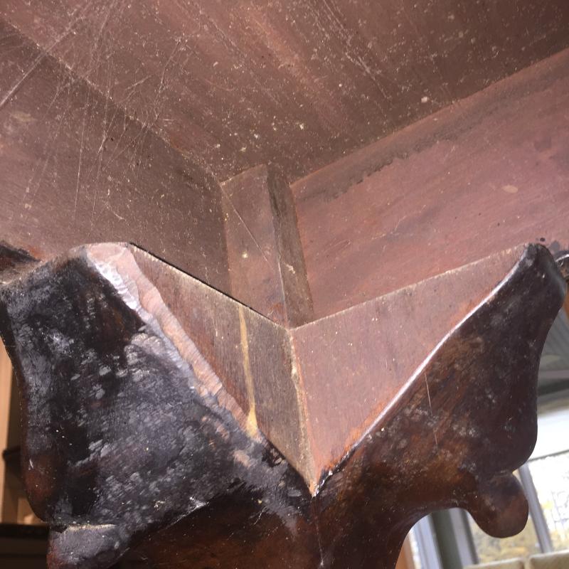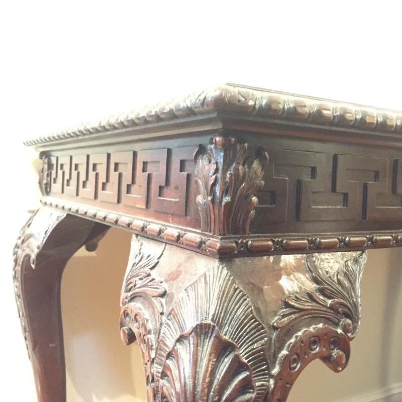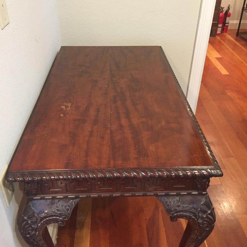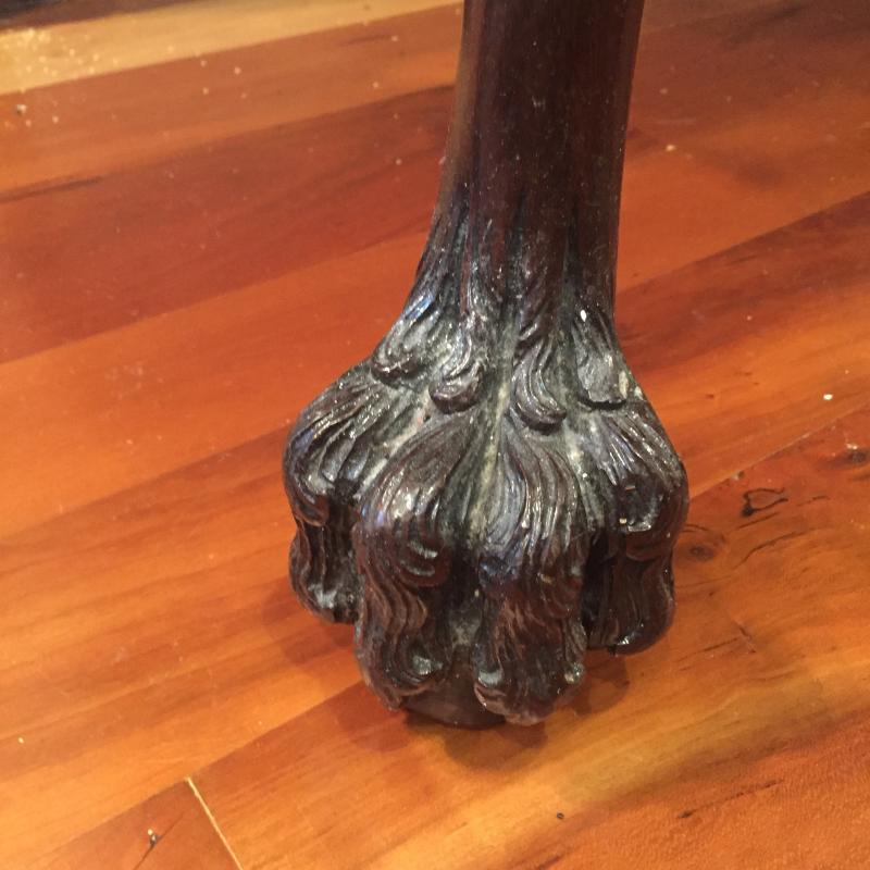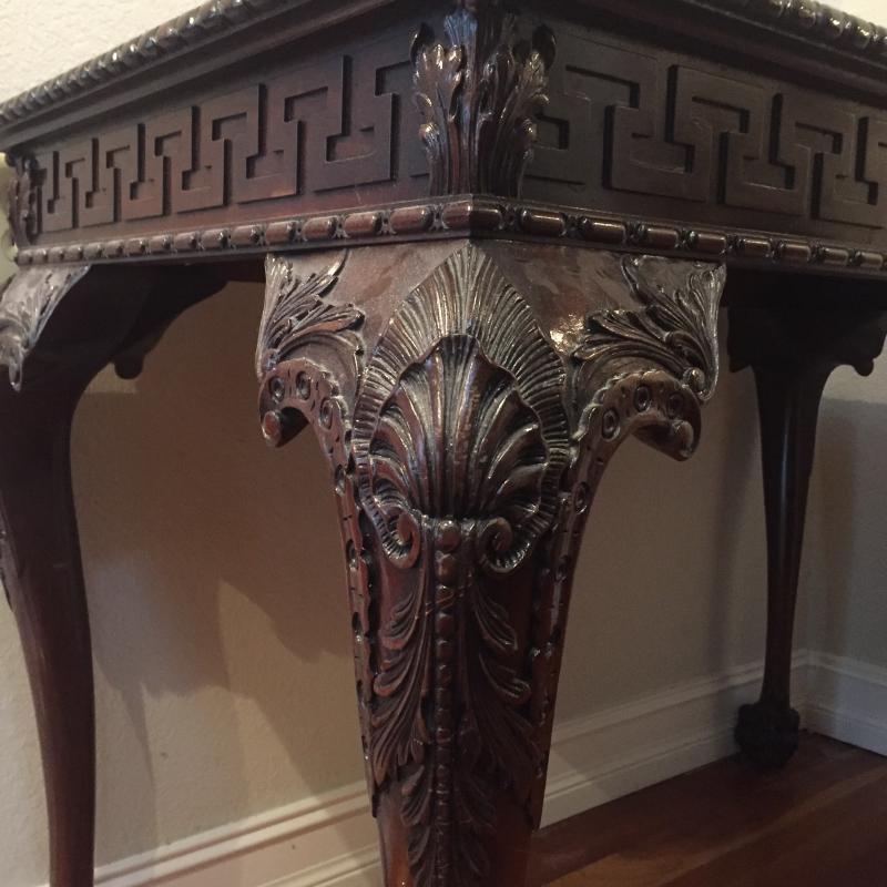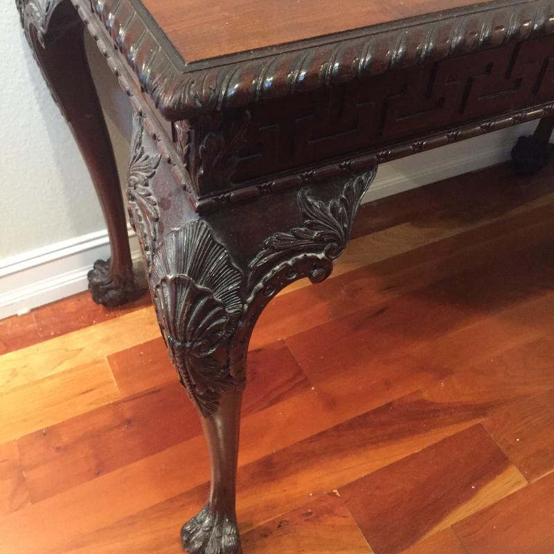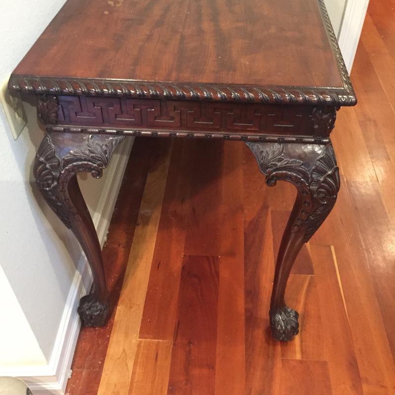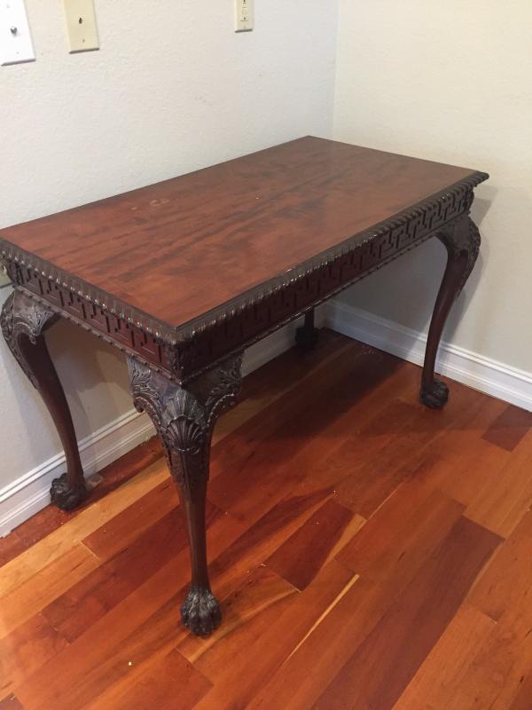 Stunning wooden table with carved sides and legs and claw feet. Use it as a table or a desk. Top has spot that needs attention-see pictures. Table measures 24.5” x 46” x 32.5”.