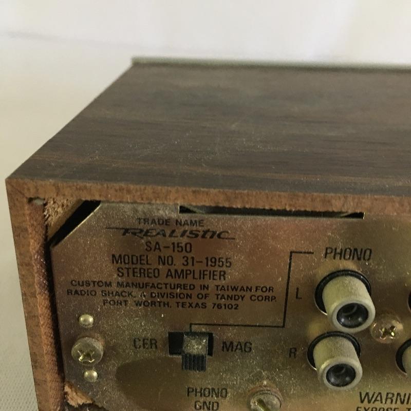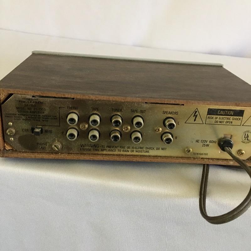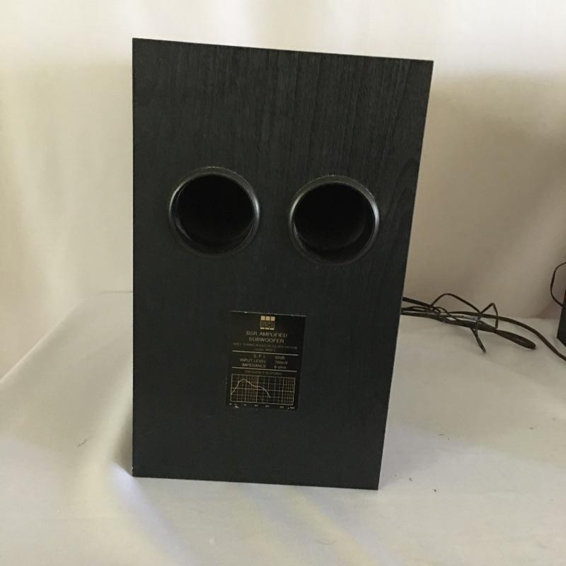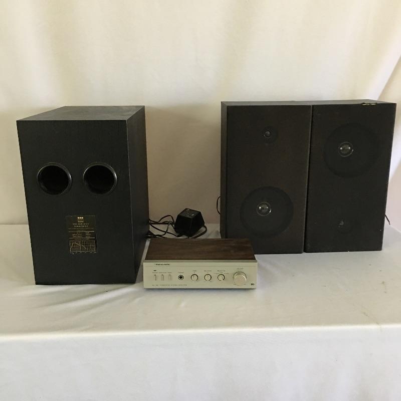 Hear your music the way the artist intended with this lot! Lot includes BSR amplified sub woofer, Realistic stereo amp model # 31-1955 and a pair of speakers. Amp powered on when tested and sub woofer could not be tested. Sub woofer measures 8.75” x 13.75” x 13.75”.