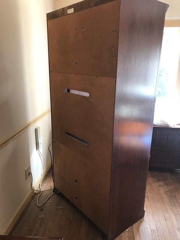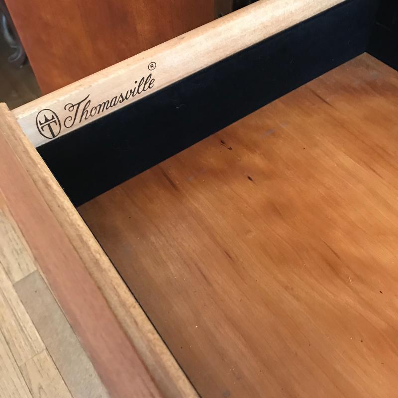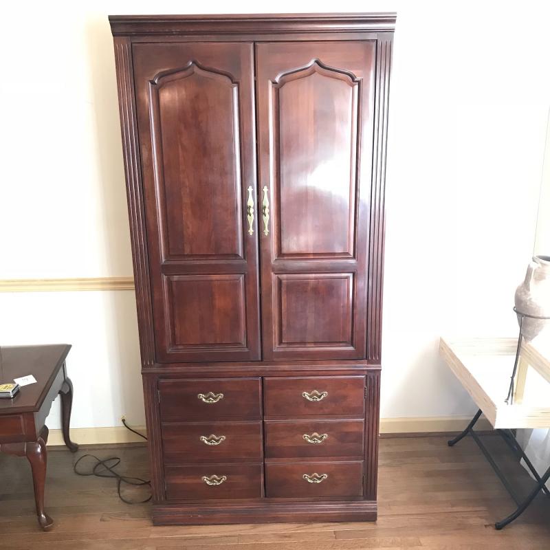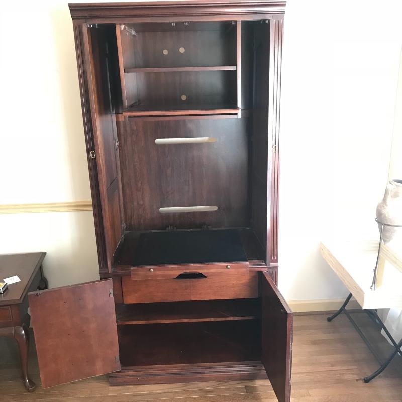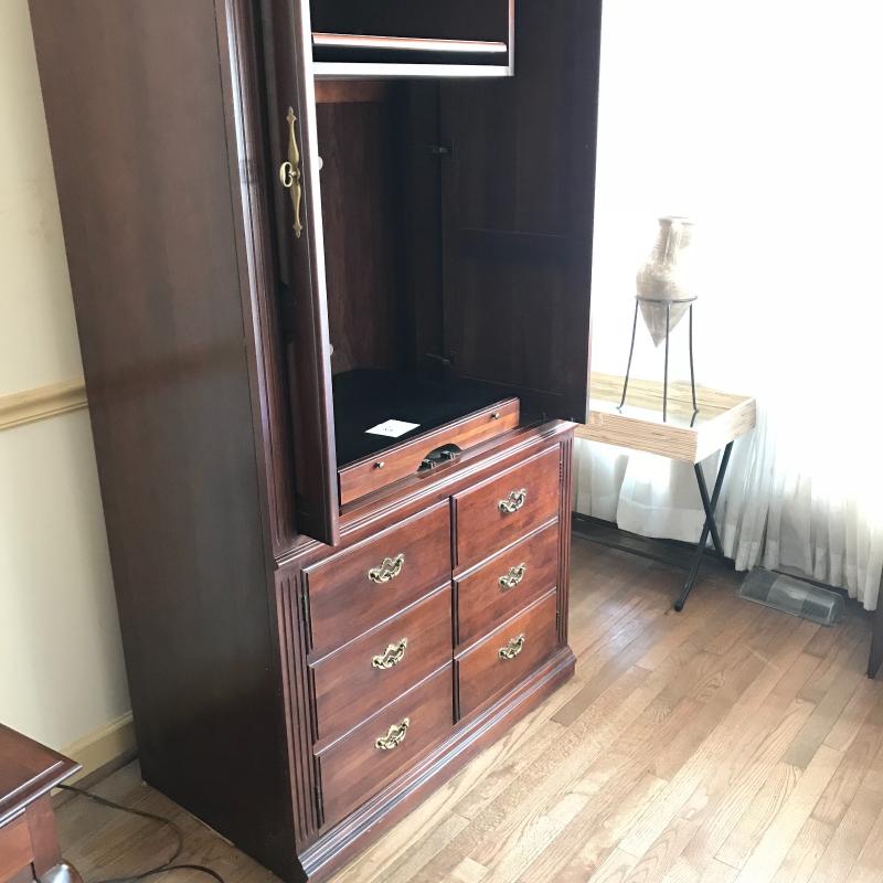 Solid Thomasville entertainment center. Has two slide out shelves and a dual plug-in unit on top and two-door cabinet with one drawer on bottom. Piece measures 38” x 22.5” x 80”. This lot is on main level of home but is heavy and you will need to bring help to load it. Available for local pick up in Flat Rock, NC only.