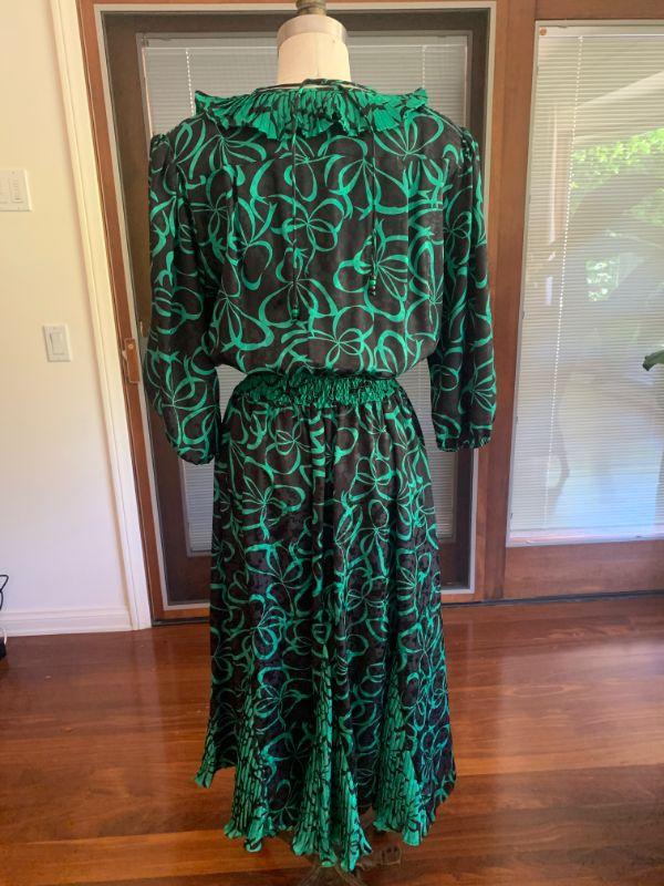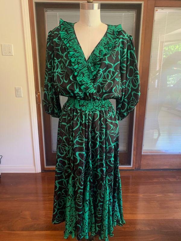 Vintage 70s 80s designer Susan Freis, who designed with her sister Diane under the label Assorti, together creating loose fitting easy care flowing dresses. Later Susan would start her own label with a different look. Bold green and black polyester, big sleeves, ruffled collar and inserted flounces, marking all the elements of this boho chic look.
