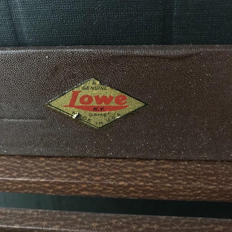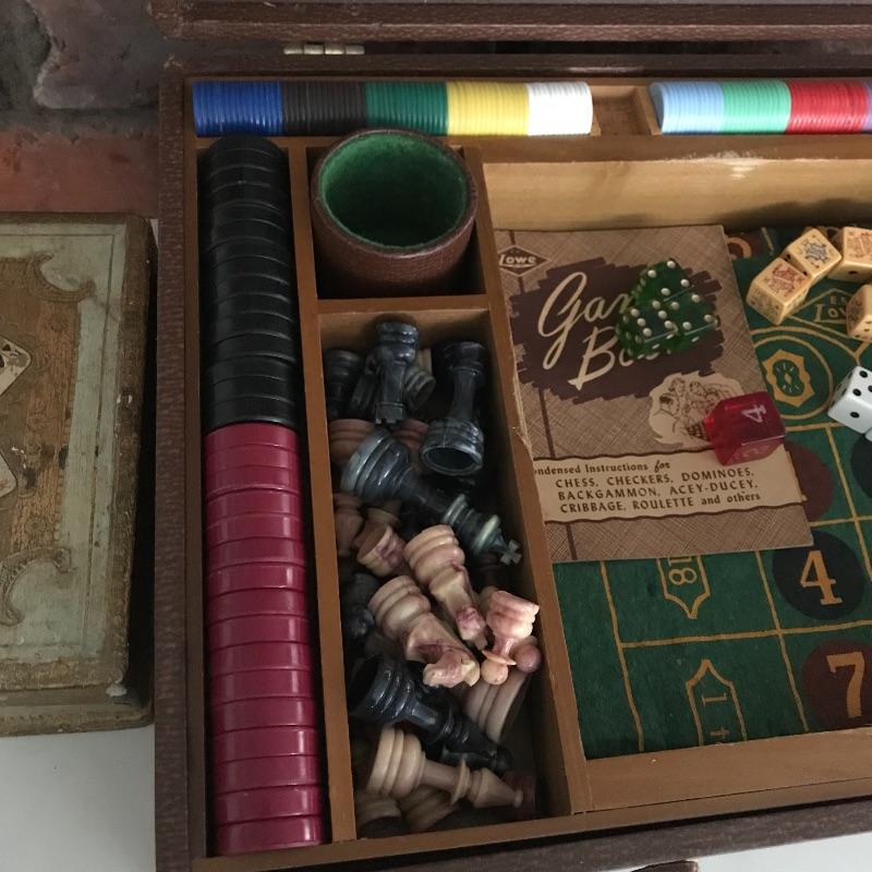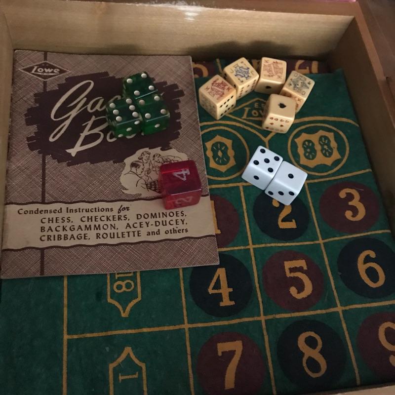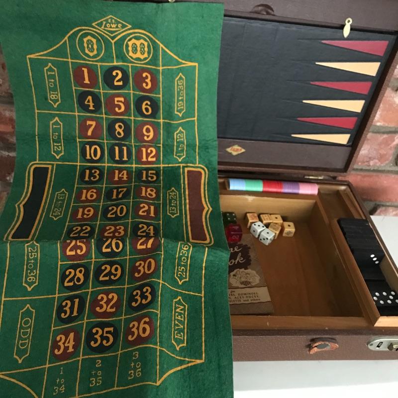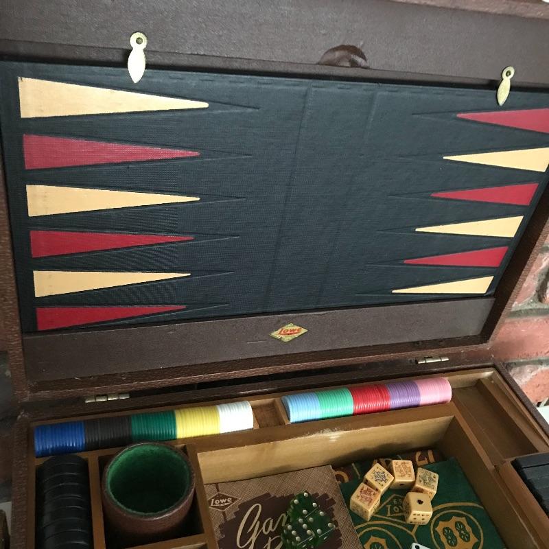 A little bit for everyone in one Lowe NY box! Chess, Backgammon, dice, wooden dominos and more! Pieces included are shown in photos. Dominoes appear to be wooden and painted black with dragons, completed set of dominos not verified. Chess pieces are plastic. Collection also includes extra dice, a decorative roulette bowl with ball (spins reluctantly) and a vintage wooden card box that holds two decks of cards. Lowe NY box is missing its handle and measures 15” x 11” x 3.5” when closed. Shipping available.