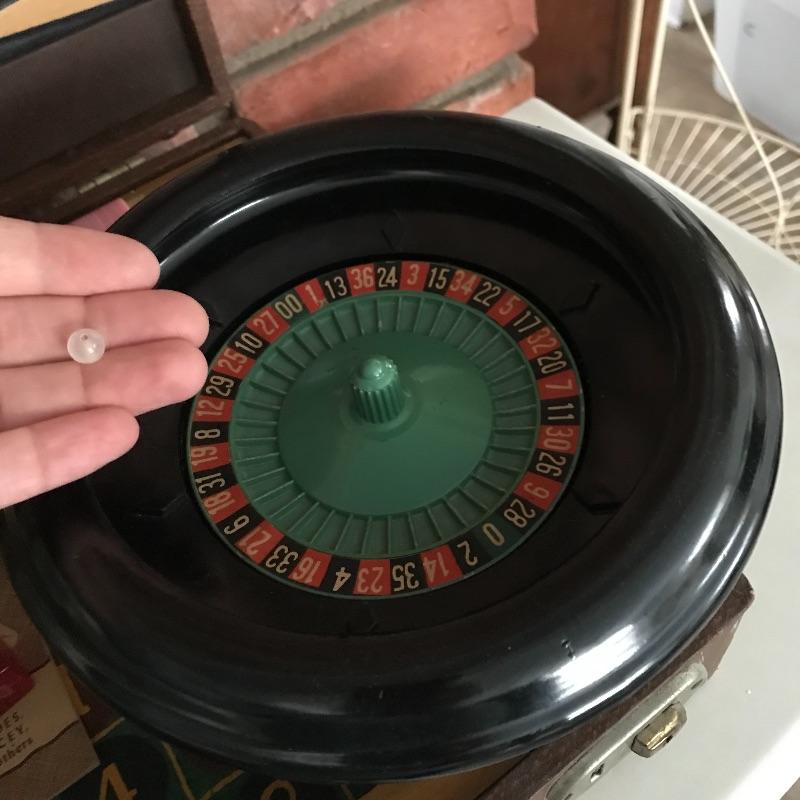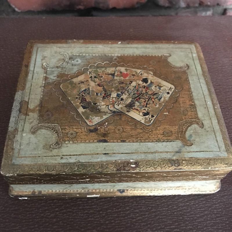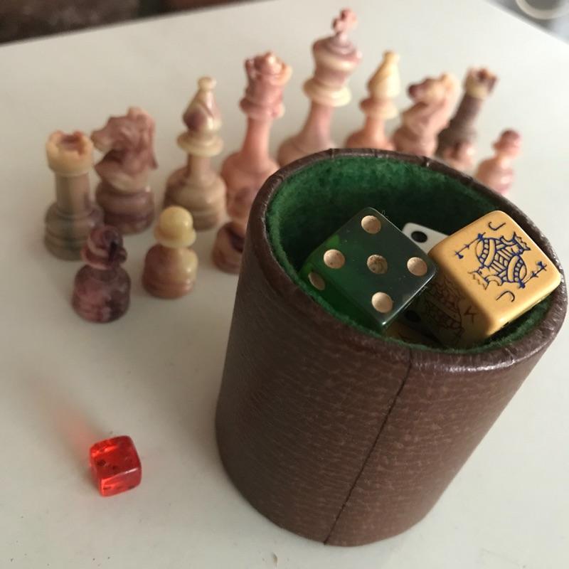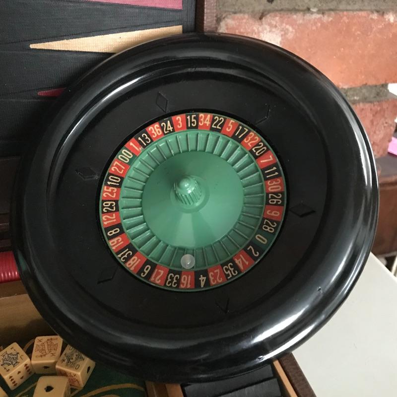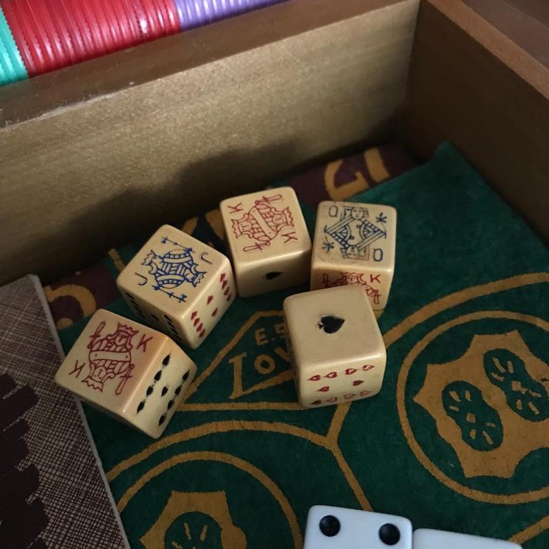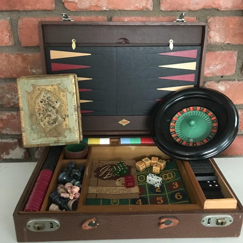 A little bit for everyone in one Lowe NY box! Chess, Backgammon, dice, wooden dominos and more! Pieces included are shown in photos. Dominoes appear to be wooden and painted black with dragons, completed set of dominos not verified. Chess pieces are plastic. Collection also includes extra dice, a decorative roulette bowl with ball (spins reluctantly) and a vintage wooden card box that holds two decks of cards. Lowe NY box is missing its handle and measures 15” x 11” x 3.5” when closed. Shipping available.