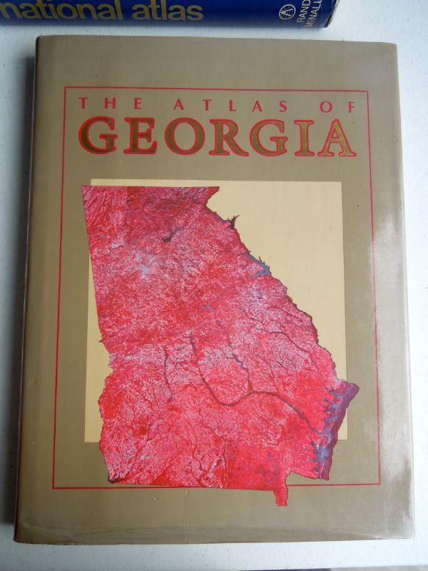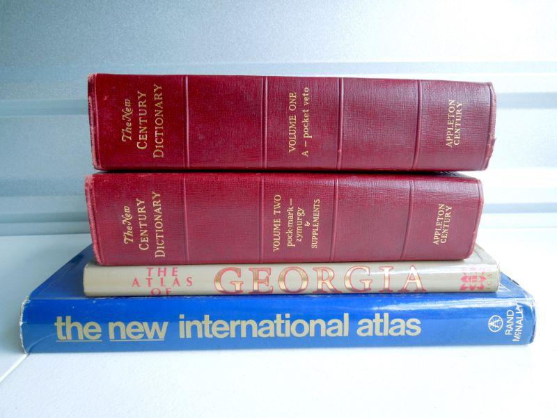 4 books total. A handsome 1930's set of leather bound dictionary in two volumes. Also included is an Atlas of Georgia and the New International Atlas.