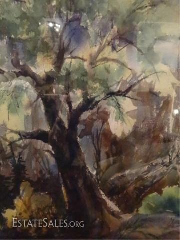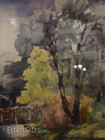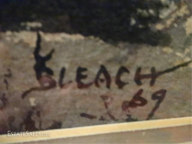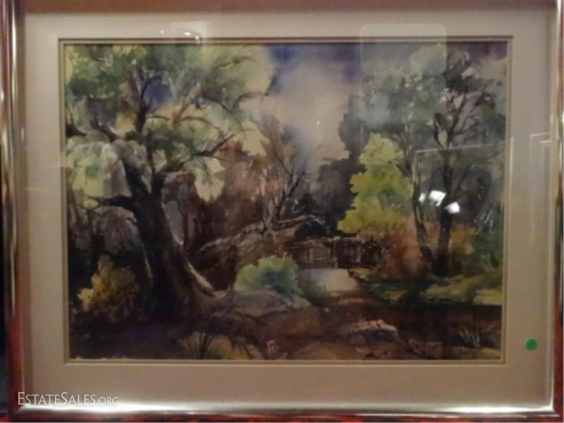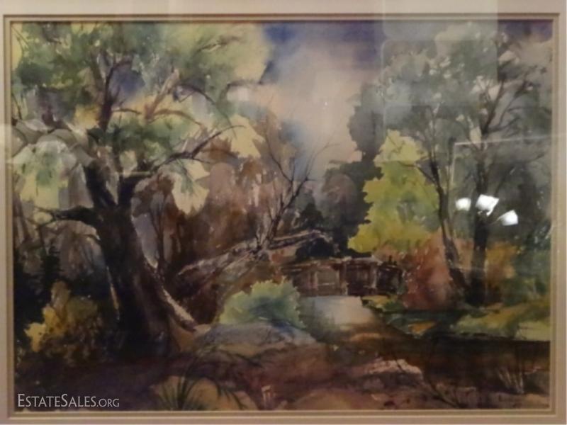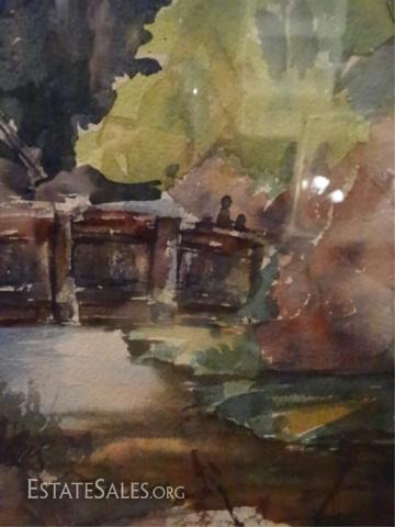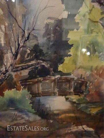 LOT 37: WATERCOLOR PAINTING ON PAPER, LANDSCAPE WITH BRIDGE AND STREAM, SIGNED K. BLEACH AND DATED '69 LOWER RIGHT, FRAMED SIZE 38" X 28", SKU128.06