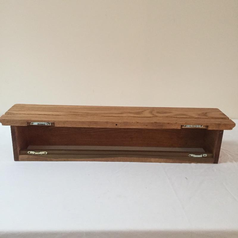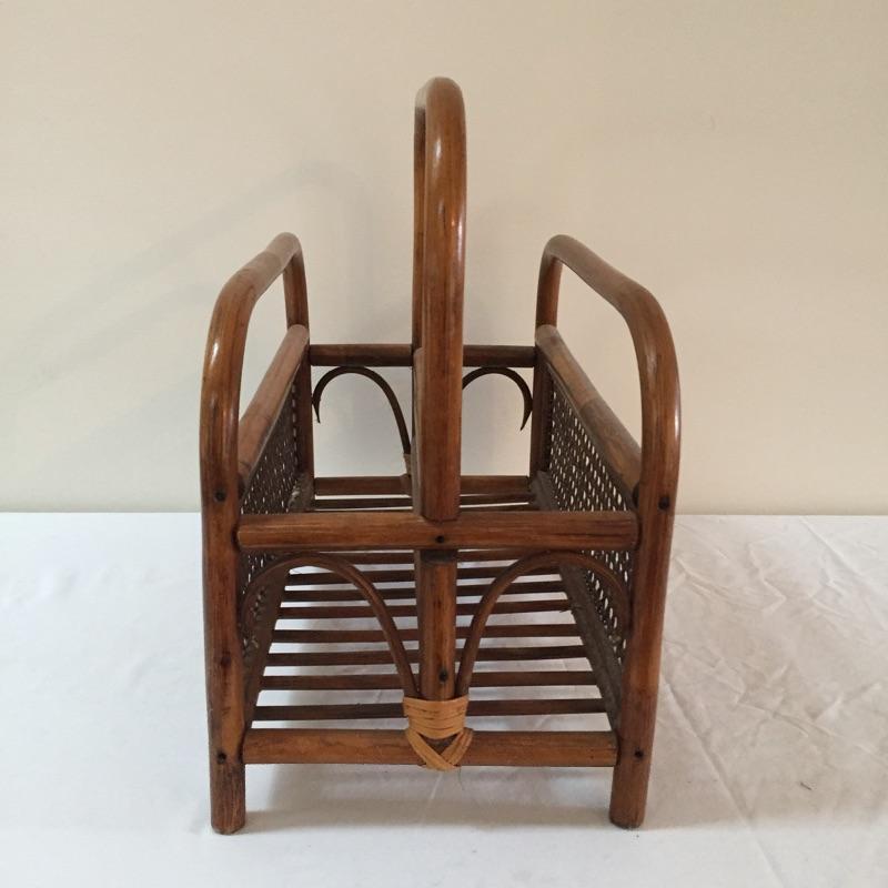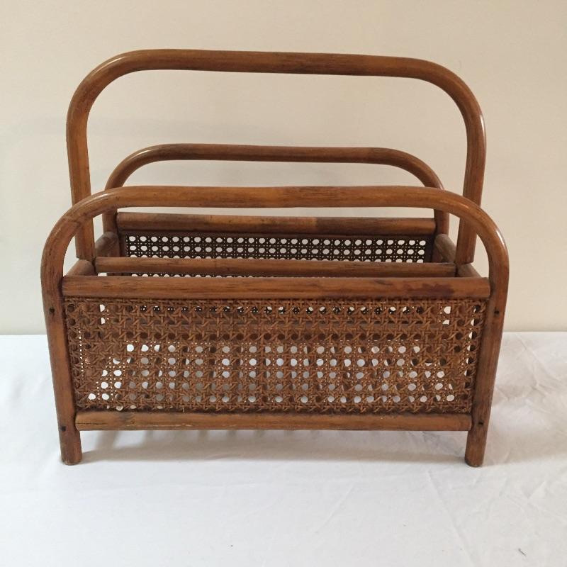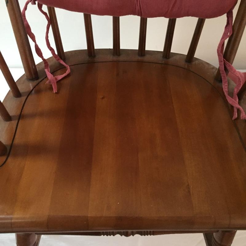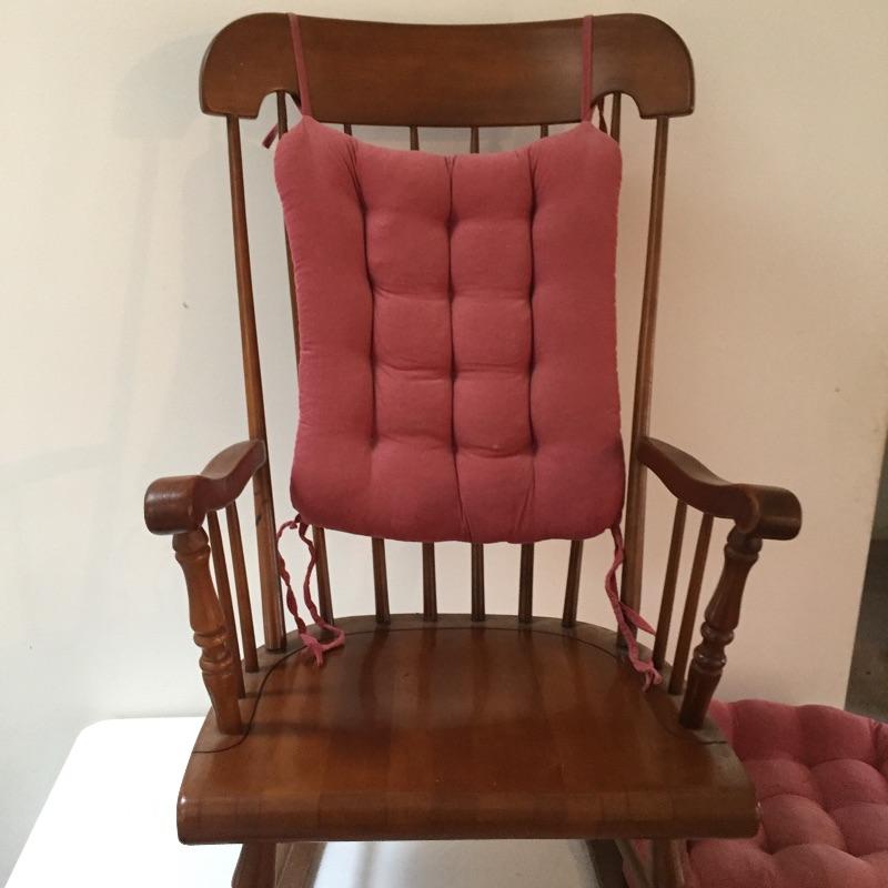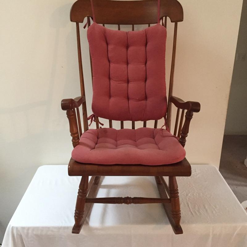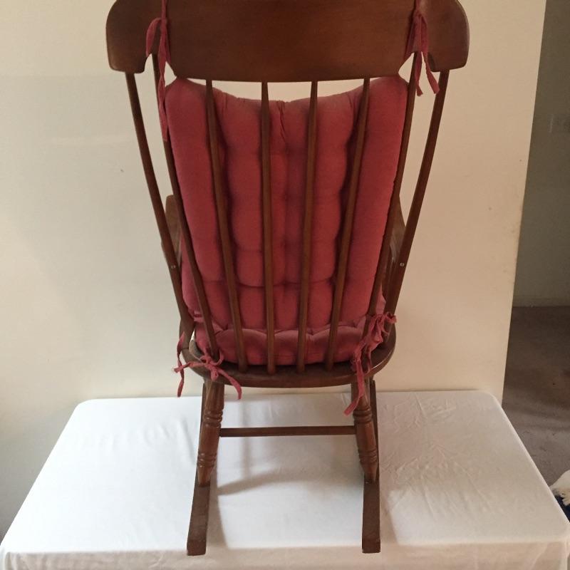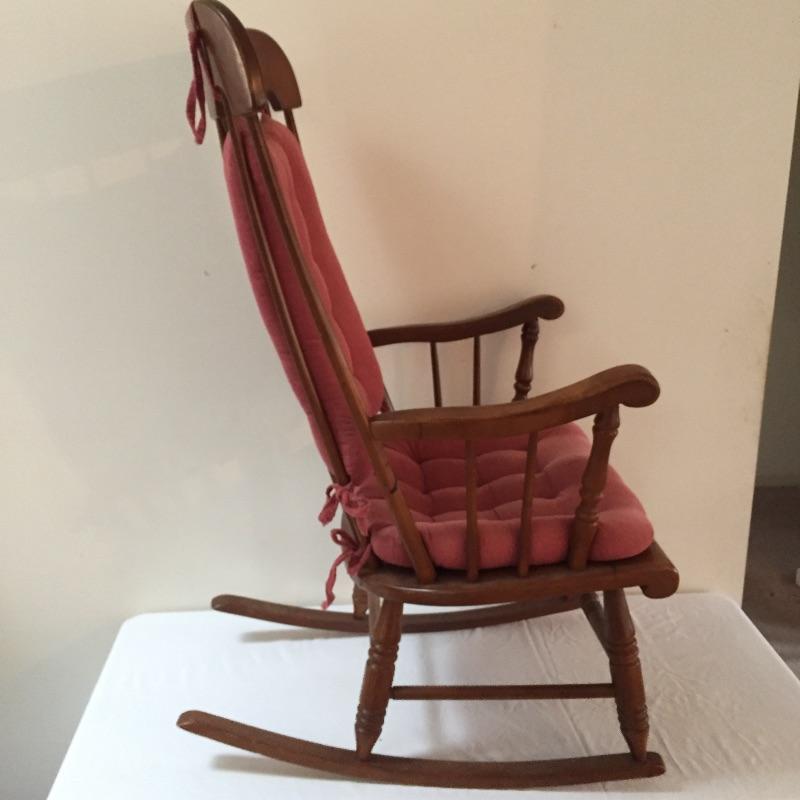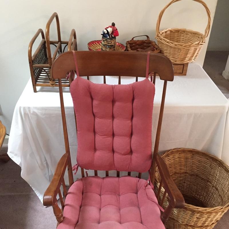 Lovely wooden rocking chair with removable cushion , magazine rack , baskets and more. Sit back and relax in this great rocker. Rocker measures 22.5” x 28” x 41.5”. Seat height measures 15”.