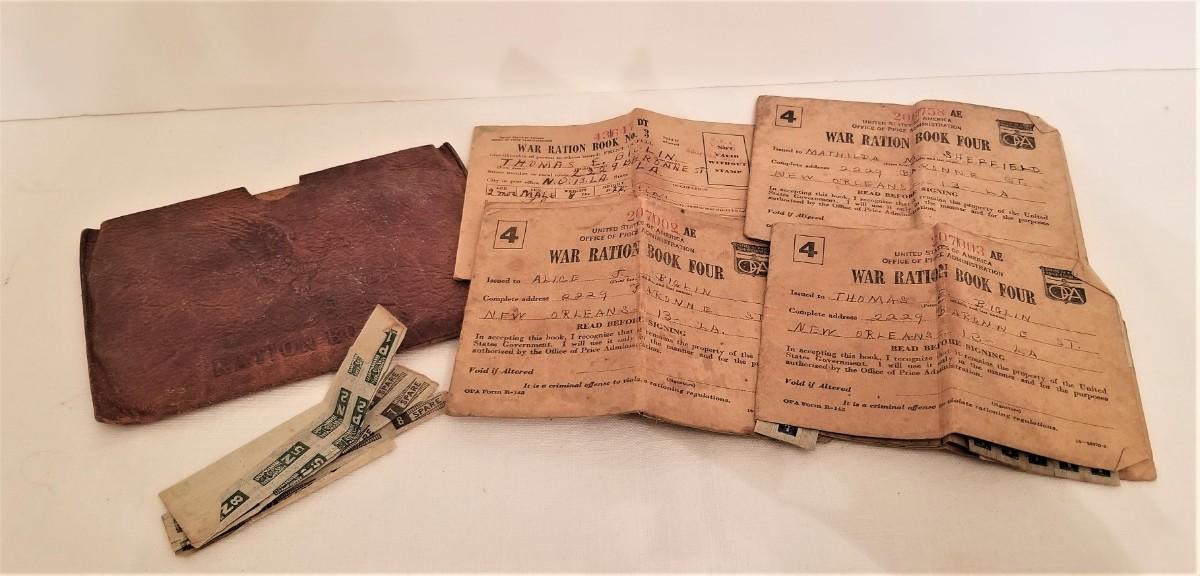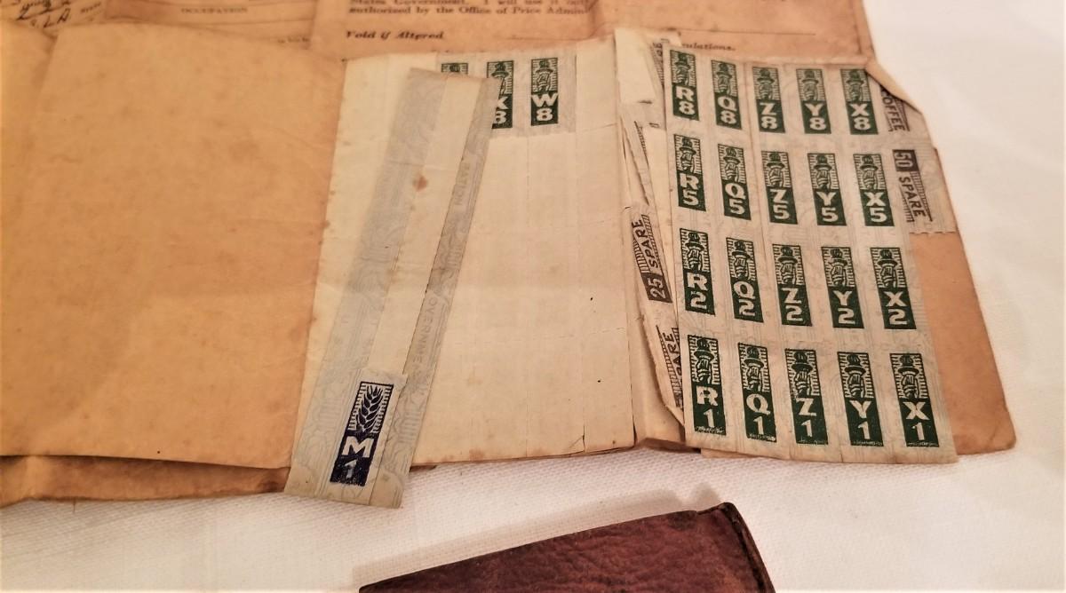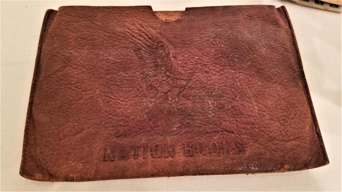 Four World War II Ration books - some still have stamps, plus the original leather Ration Book Wallet.