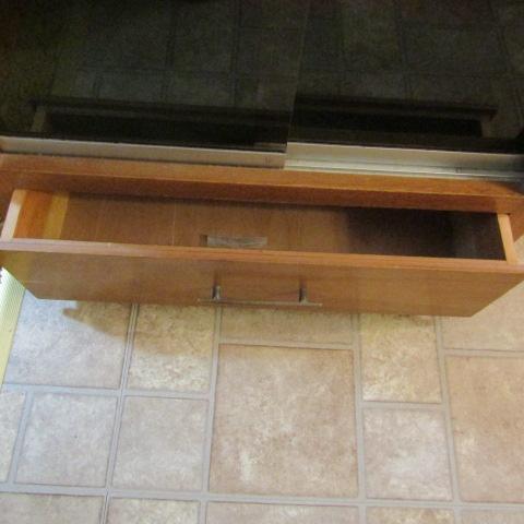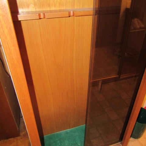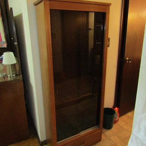 GLASS FRONT SLIDING DOORS, NO LOCK, NARROW DRAWER AT THE BOTTOM 25" X 11" X 63"
