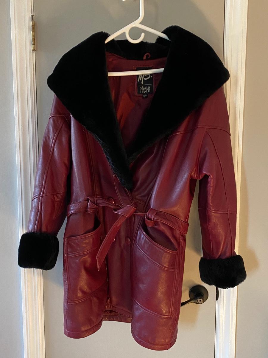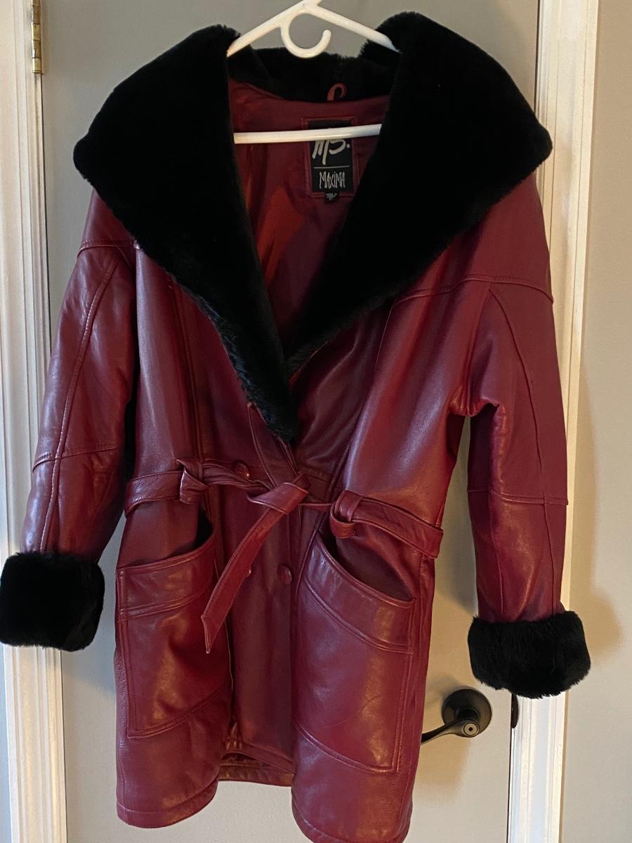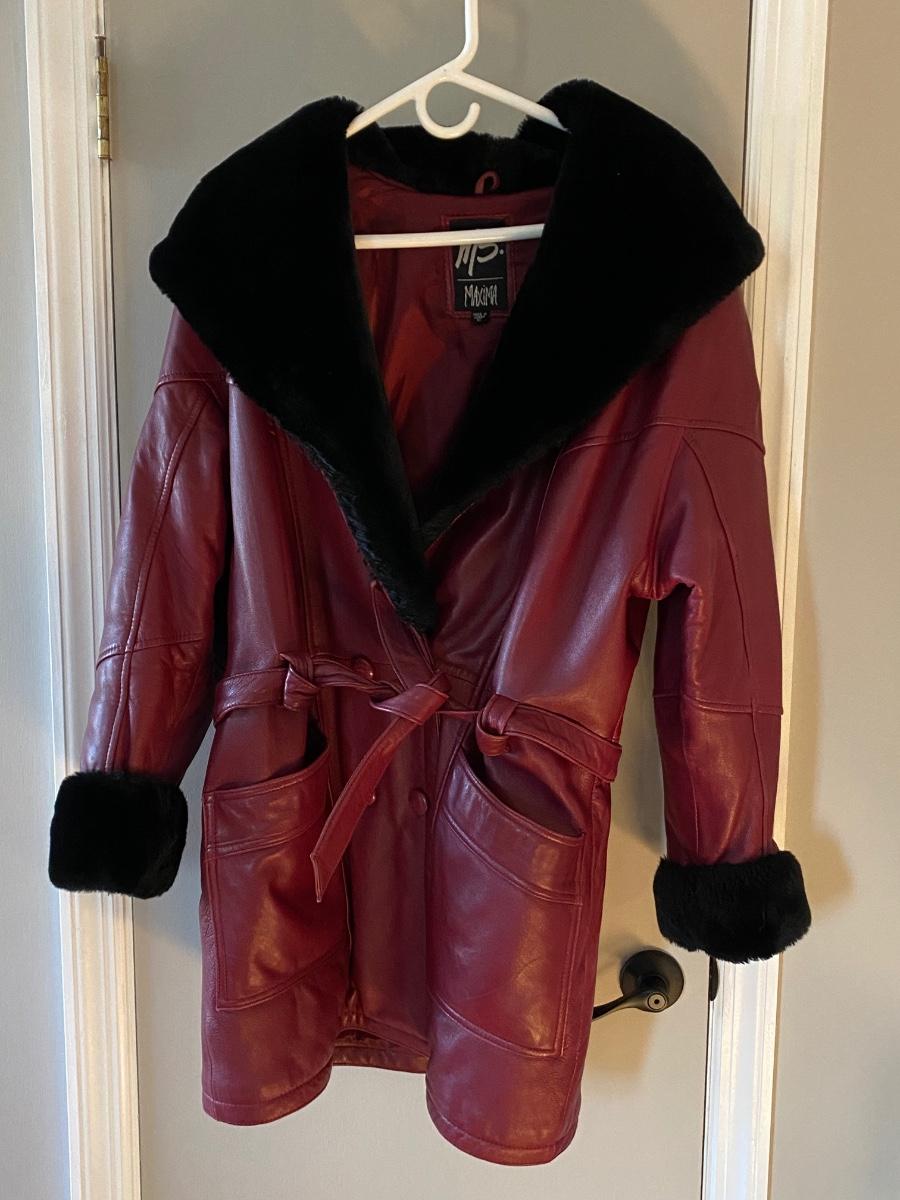 Size large burgundy leather coat with black faux fur trim by Maxima.