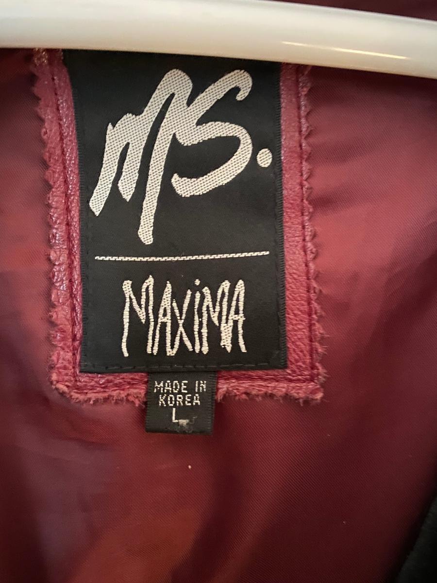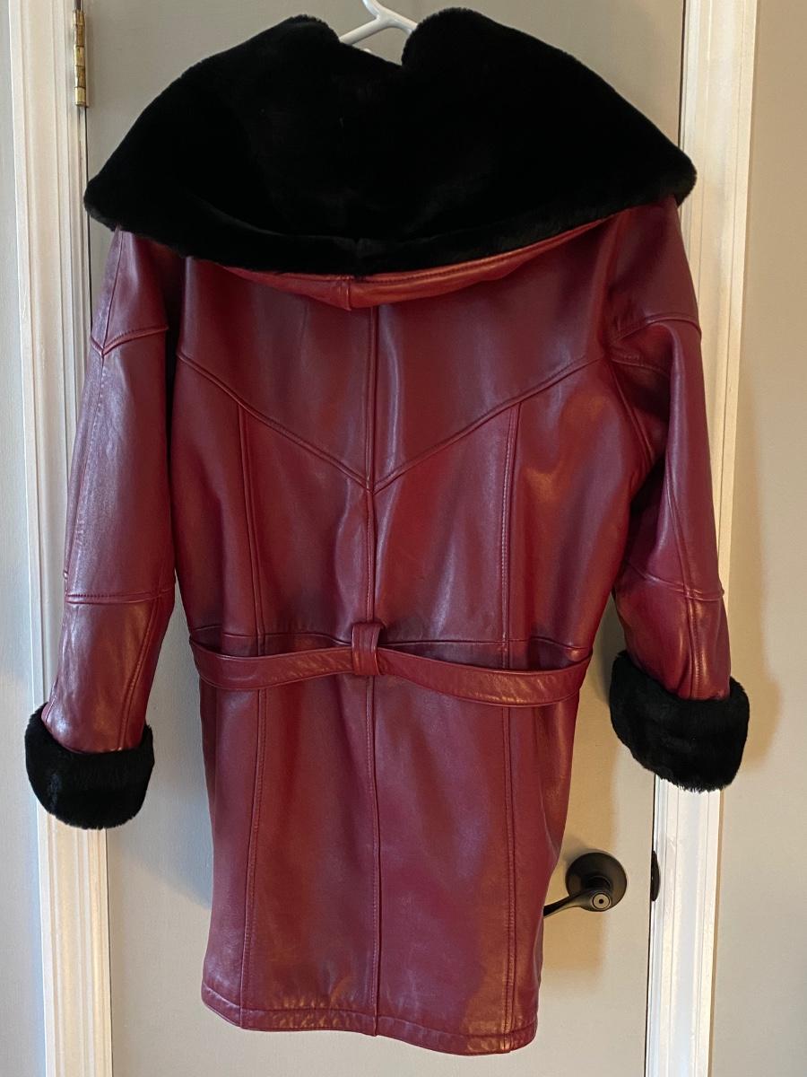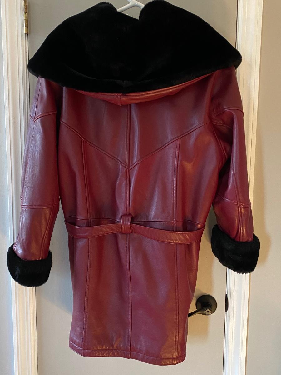 Size large burgundy leather coat with black faux fur trim by Maxima.