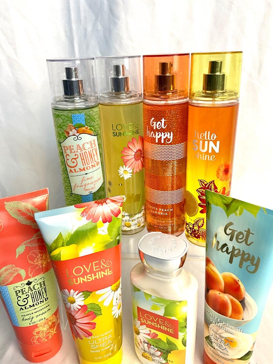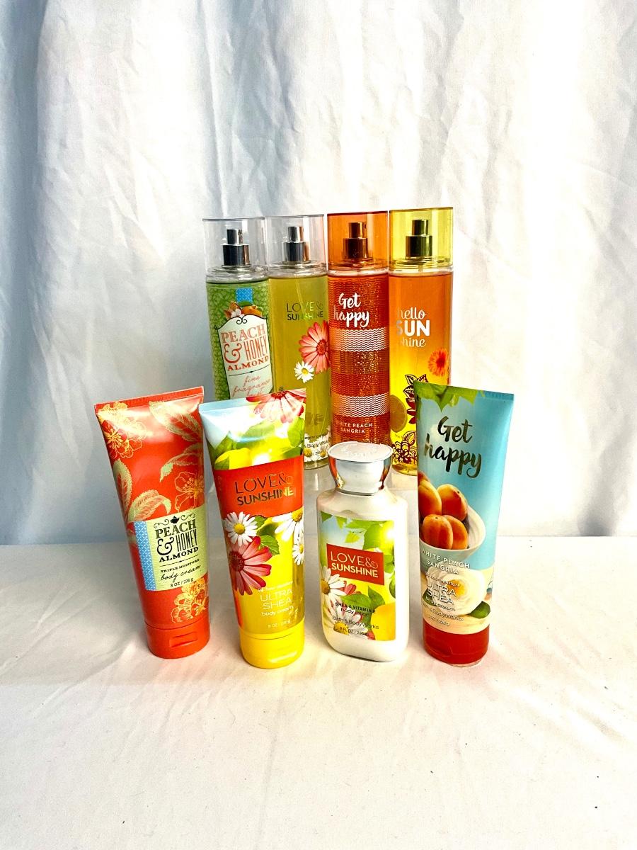 This lot contains 4 fragrance body sprays and 4 lotions. The scents in this lot are: Love & Sunshine, Get Happy, Peach & Honey Almond.