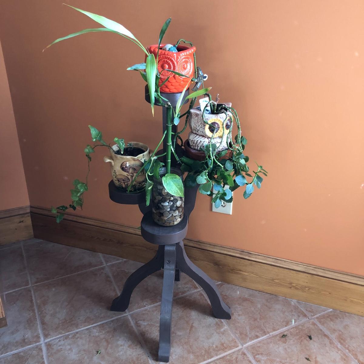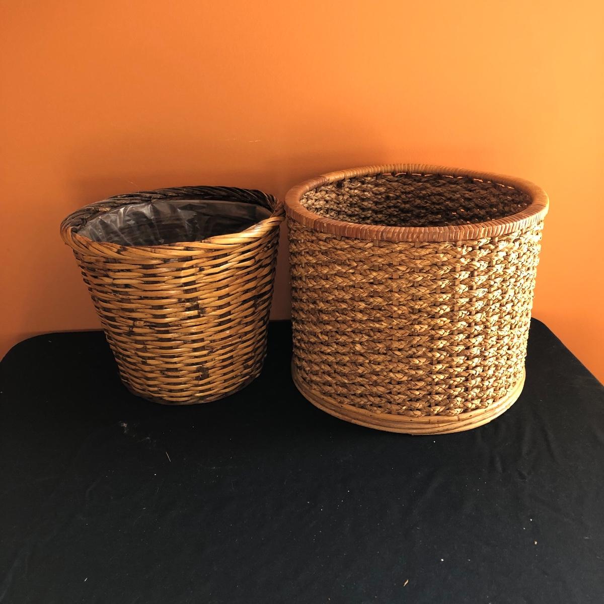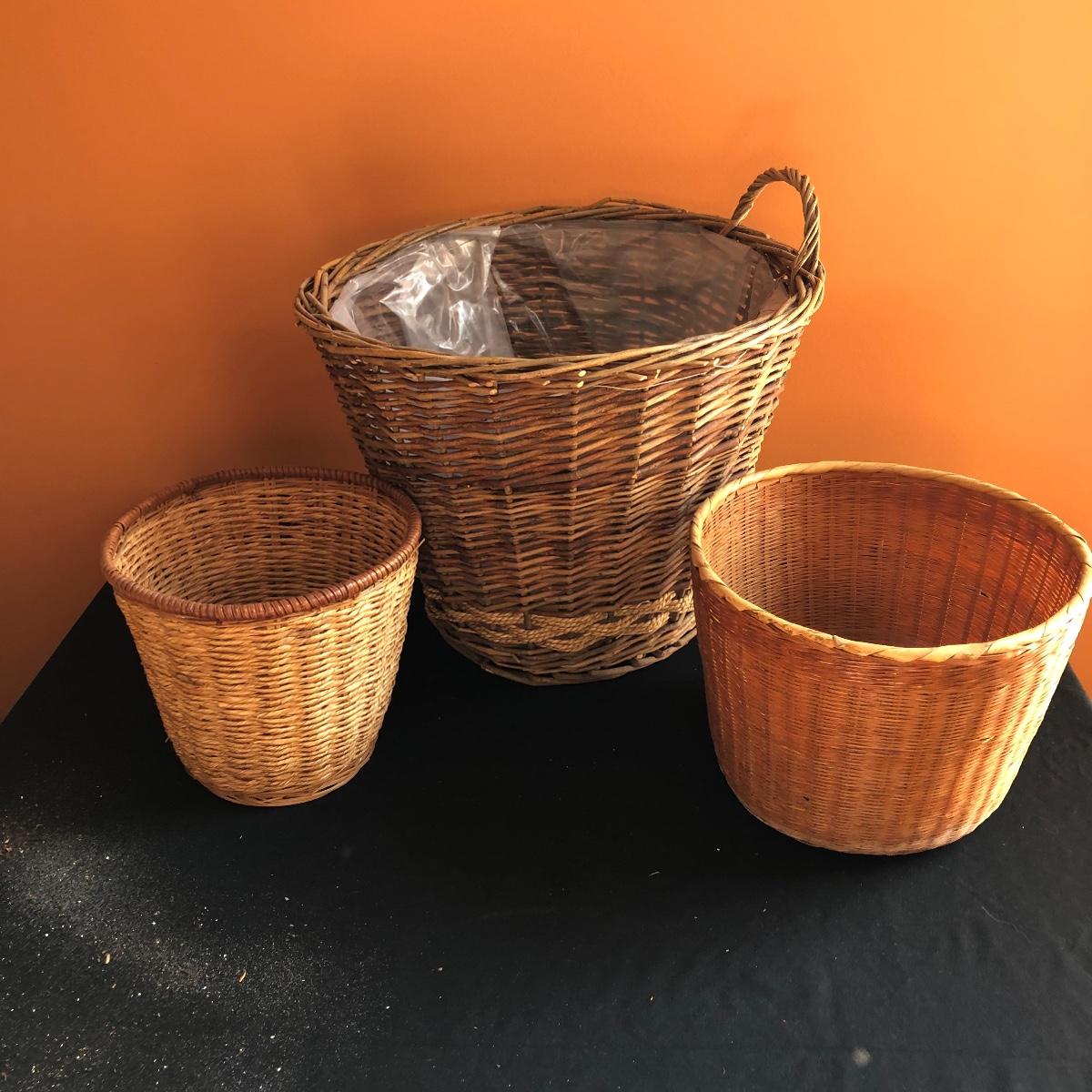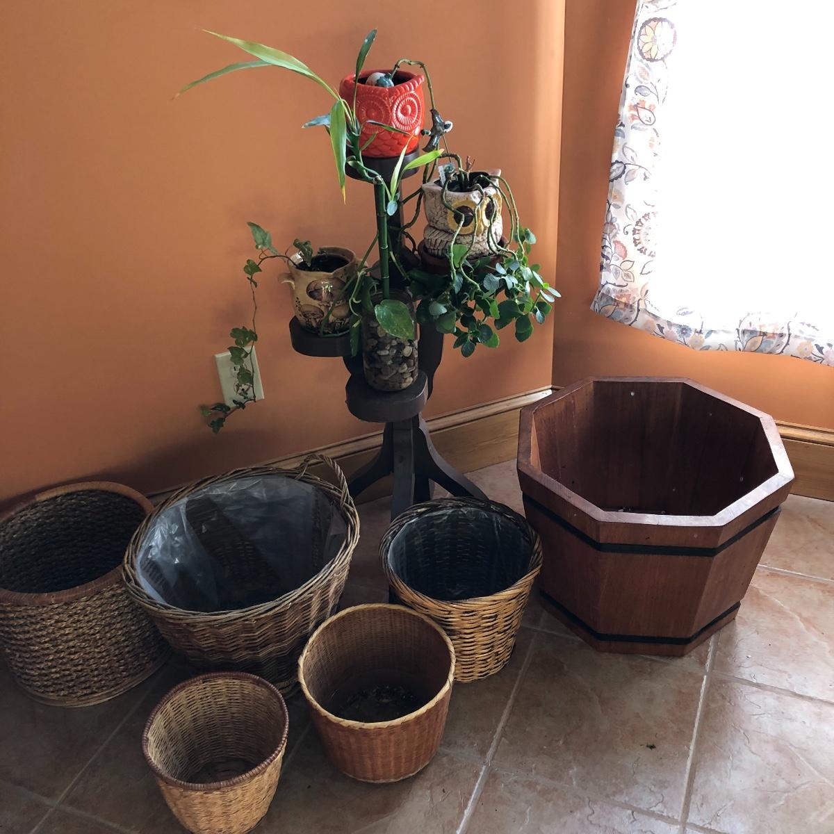 Bring nature indoors with this collection of plants and more. Lot includes wooden plant stand with three ceramic pots and plants. Also includes one large wooden planter and five woven baskets. Plant stand measures 16” x 16” x 35”.