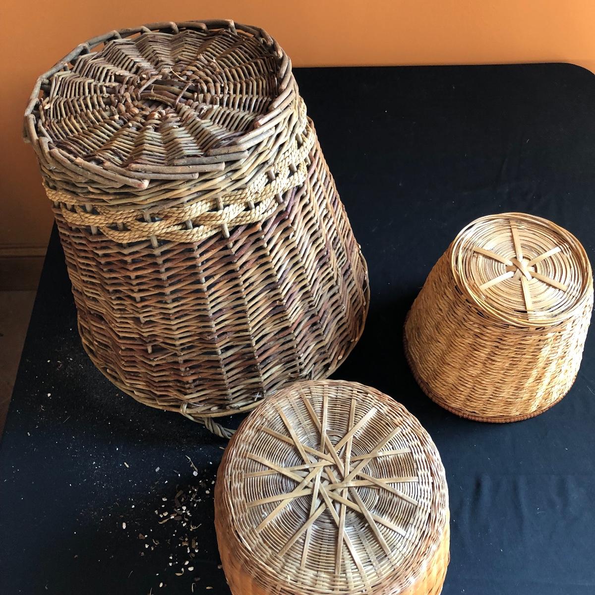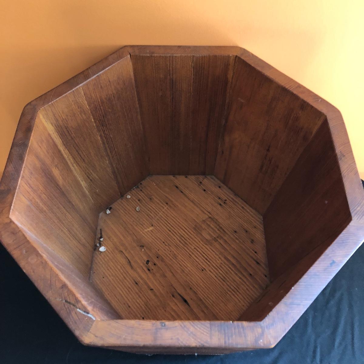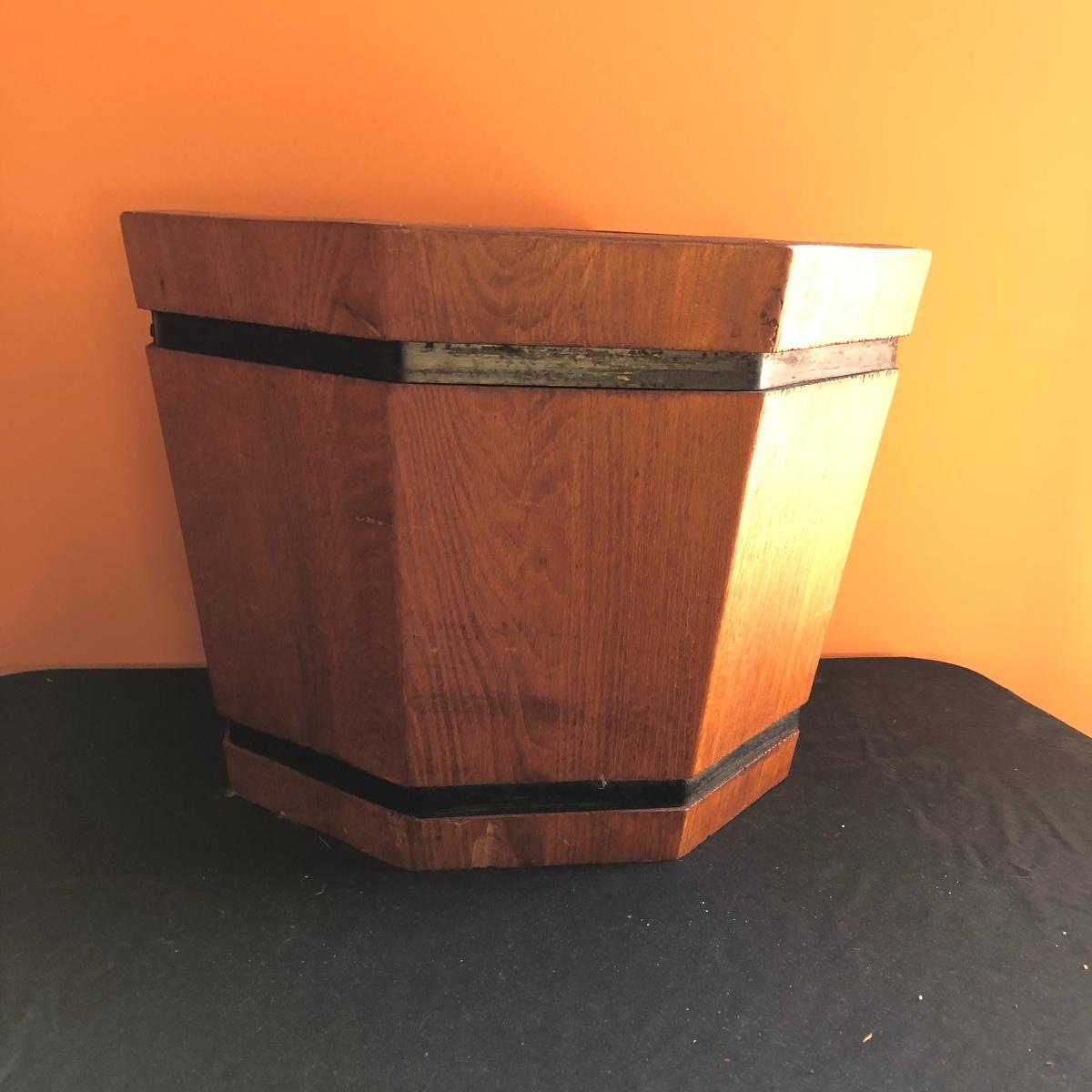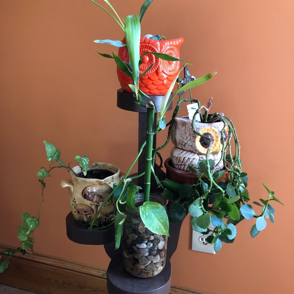 Bring nature indoors with this collection of plants and more. Lot includes wooden plant stand with three ceramic pots and plants. Also includes one large wooden planter and five woven baskets. Plant stand measures 16” x 16” x 35”.