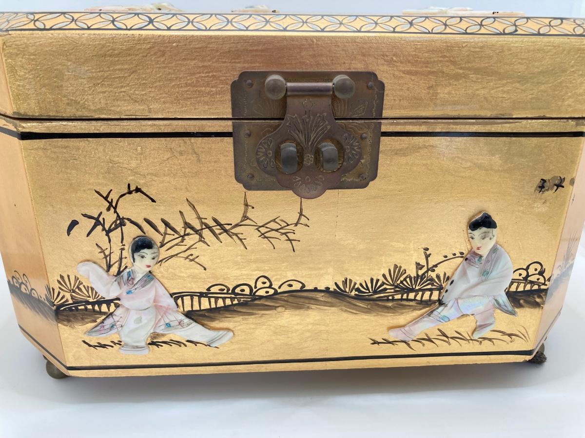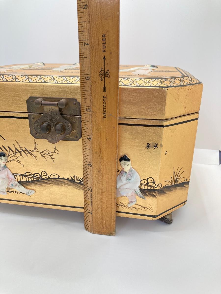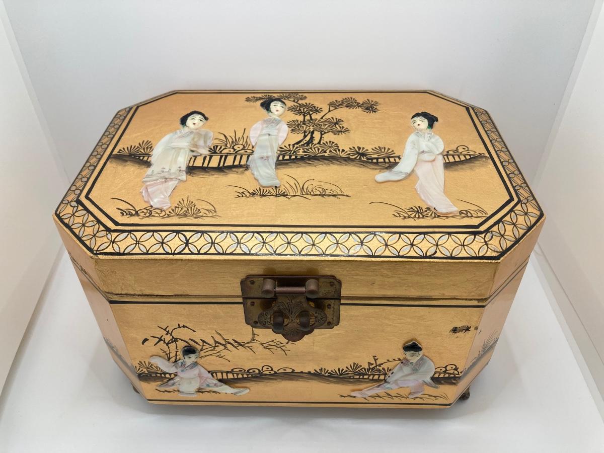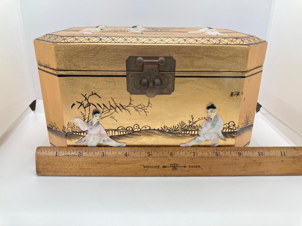 LOT 371: Vintage Asian Gold Lacquer Jewelry Box with Mother of Pearl Embossed Figures