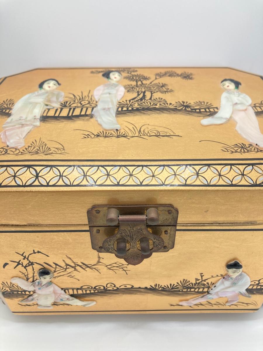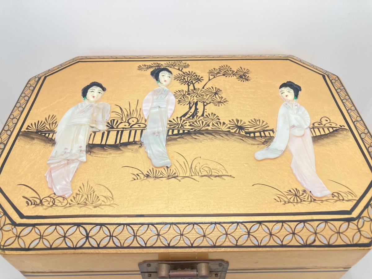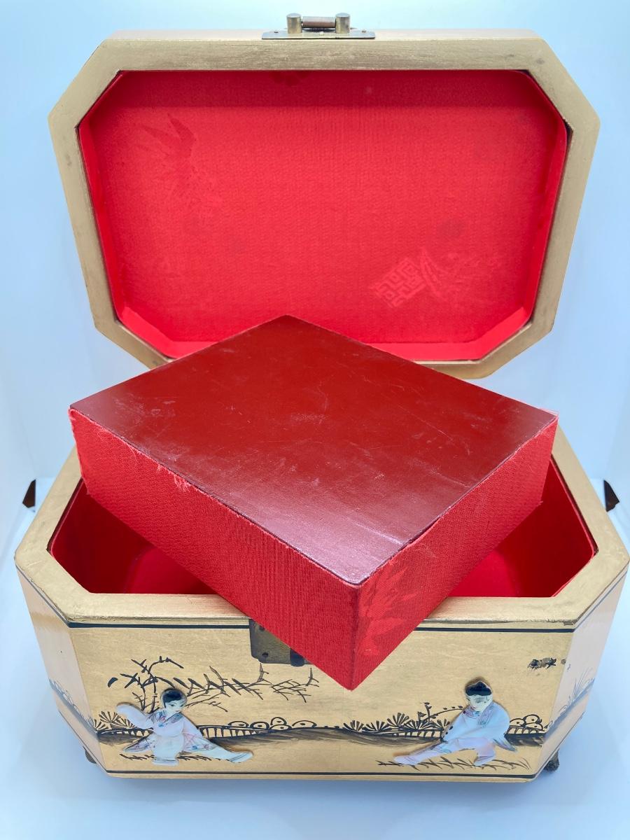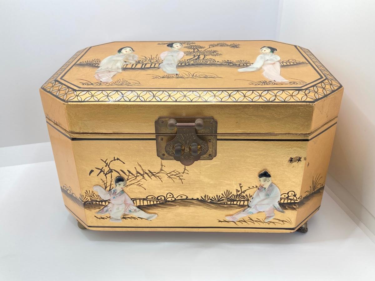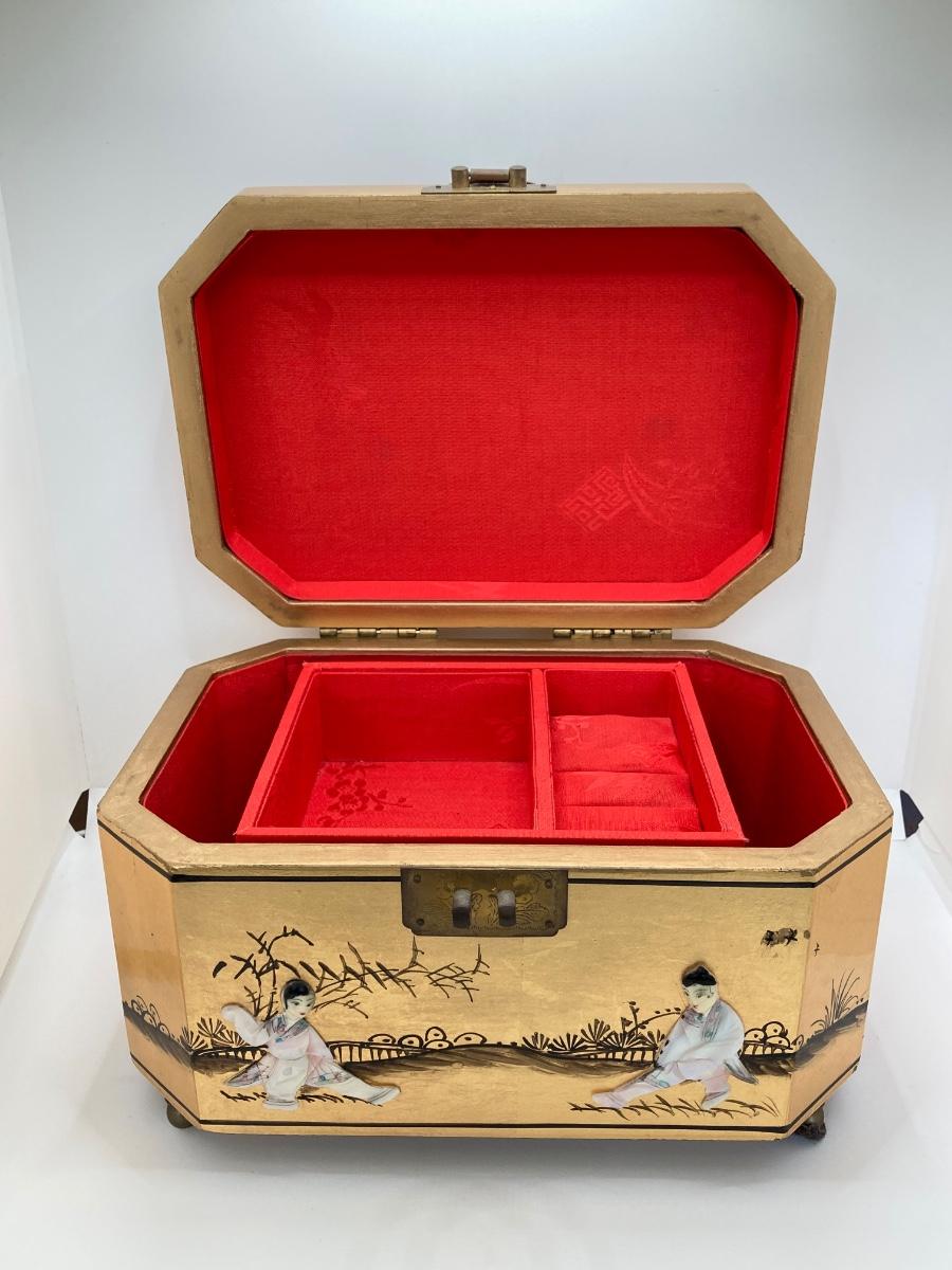 LOT 371: Vintage Asian Gold Lacquer Jewelry Box with Mother of Pearl Embossed Figures