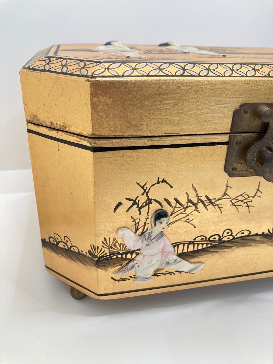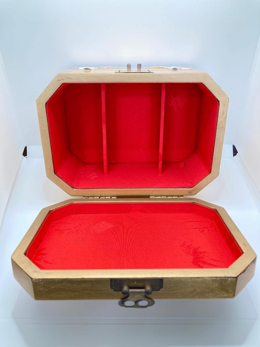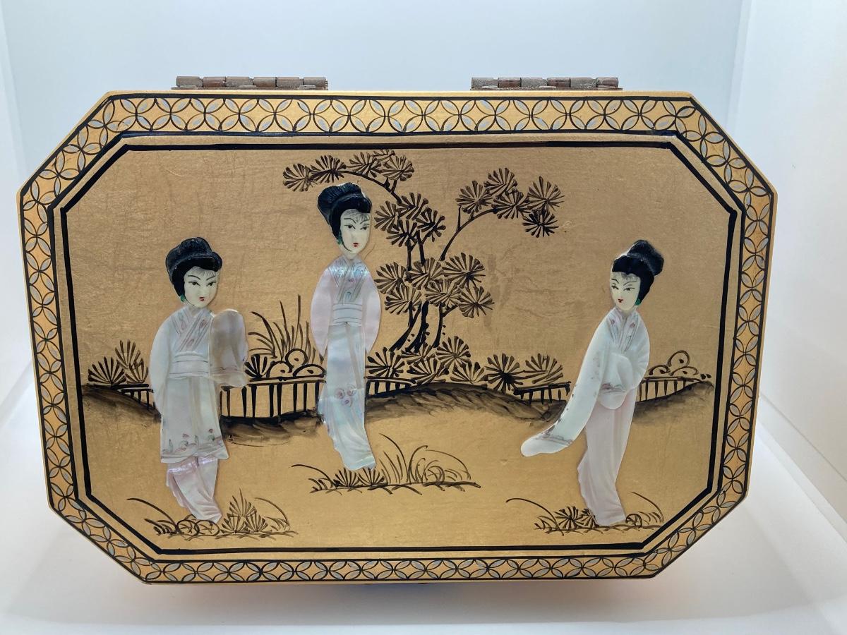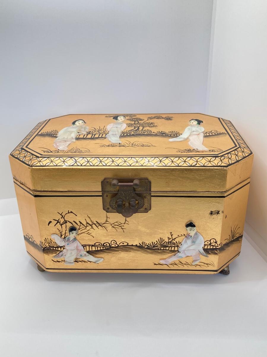 LOT 371: Vintage Asian Gold Lacquer Jewelry Box with Mother of Pearl Embossed Figures