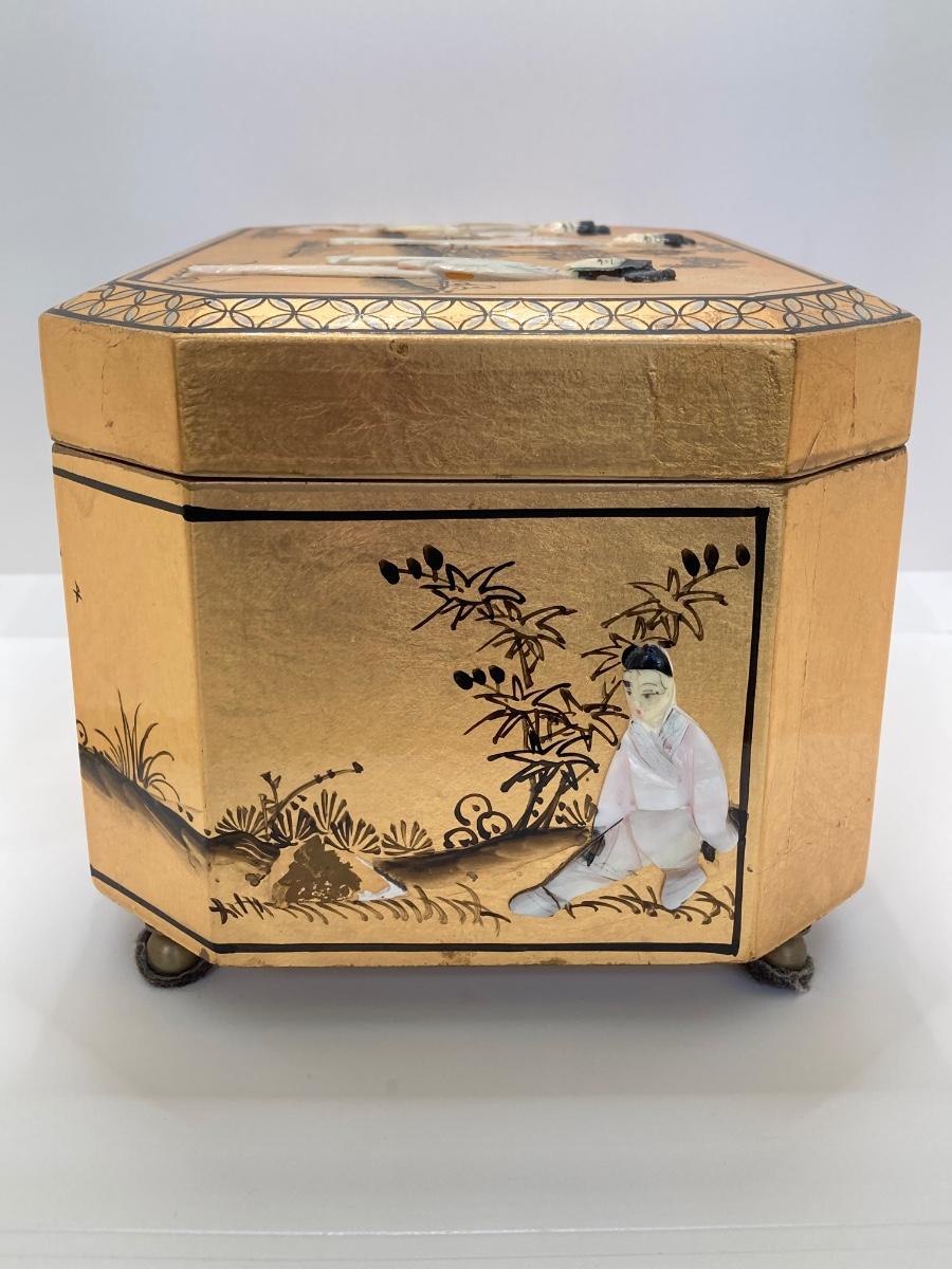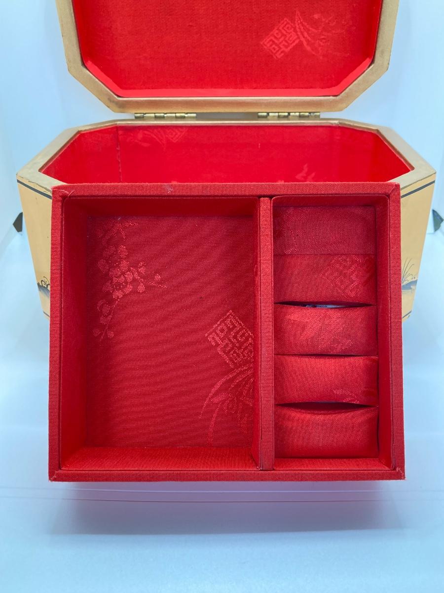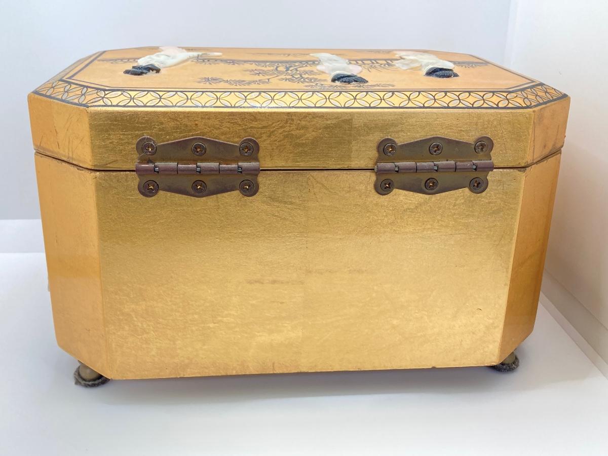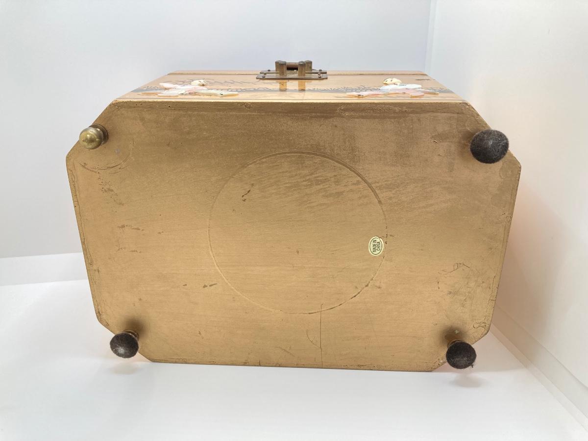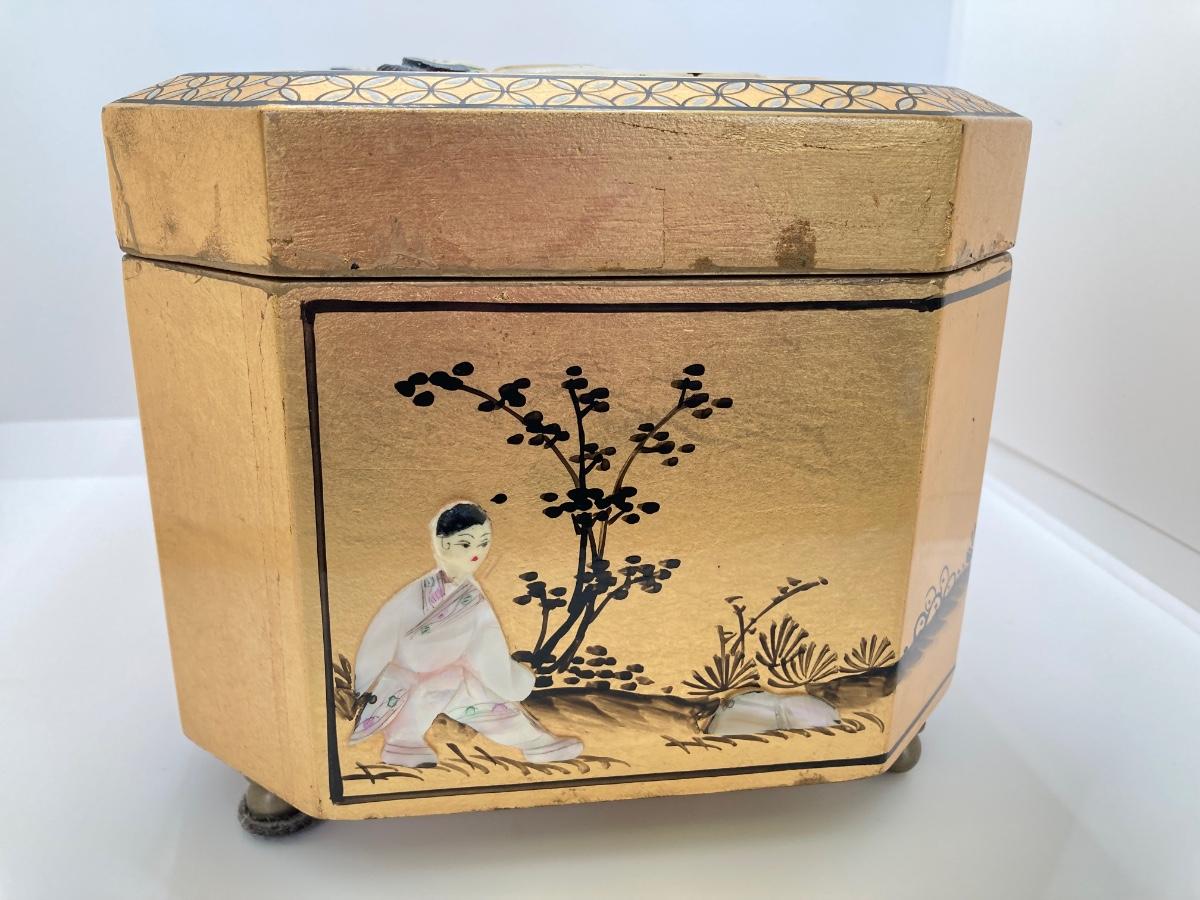 LOT 371: Vintage Asian Gold Lacquer Jewelry Box with Mother of Pearl Embossed Figures