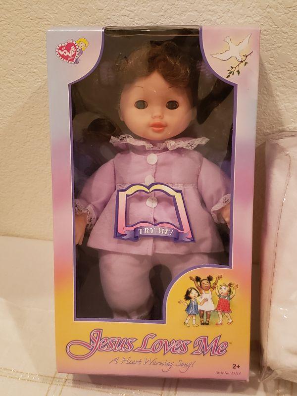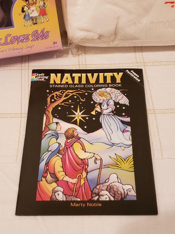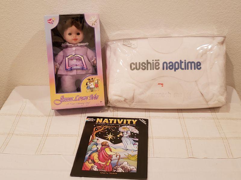 Lot 373: NEW Jesus Loves Me Doll, Nativity Coloring Book & a Cushie Naptime Pillow