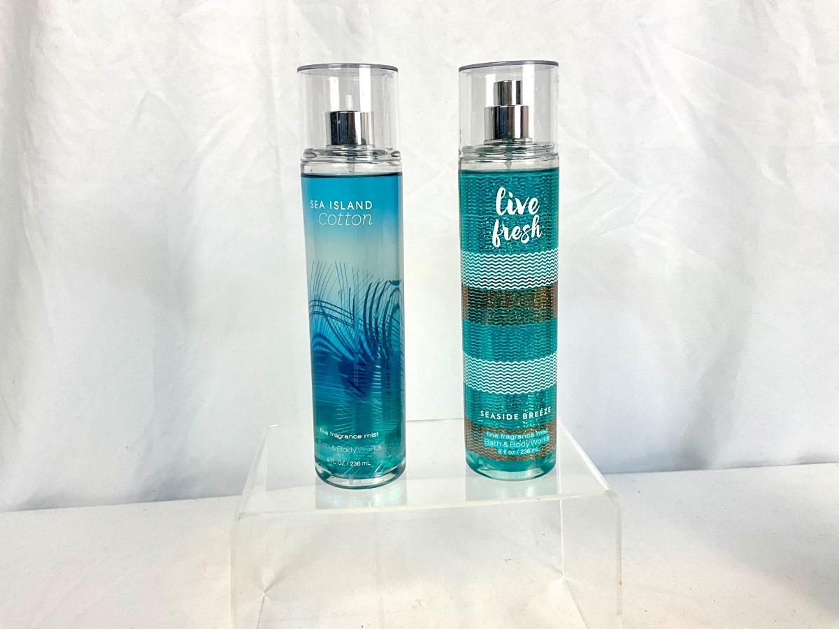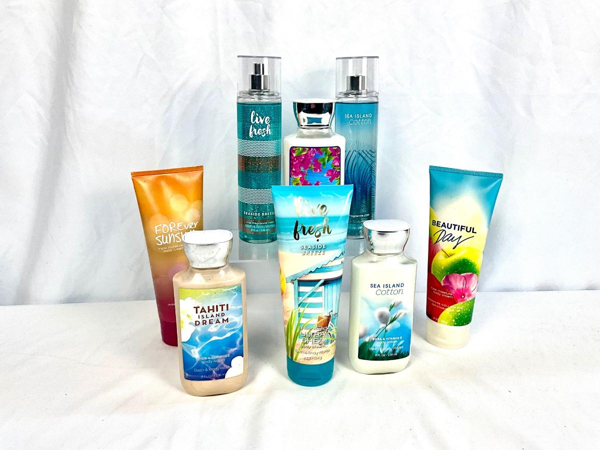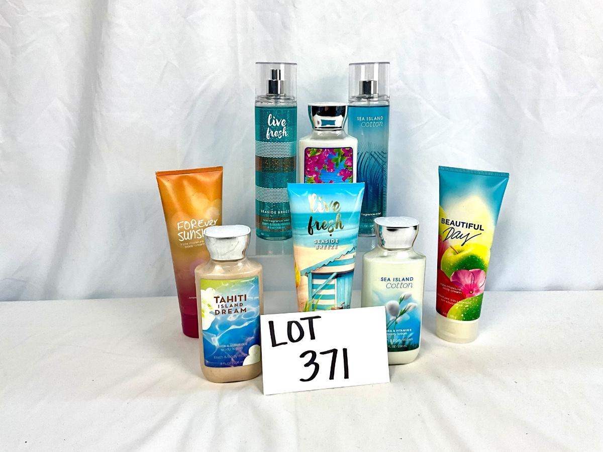 This lot contains 2 fragrance sprays and 6 lotions. The scents in this lot are Live Fresh, Sea Island Cotton, Beautiful Day, Forever Sunshine, Tahiti Island Dream and Seaside Pink Jasmine.