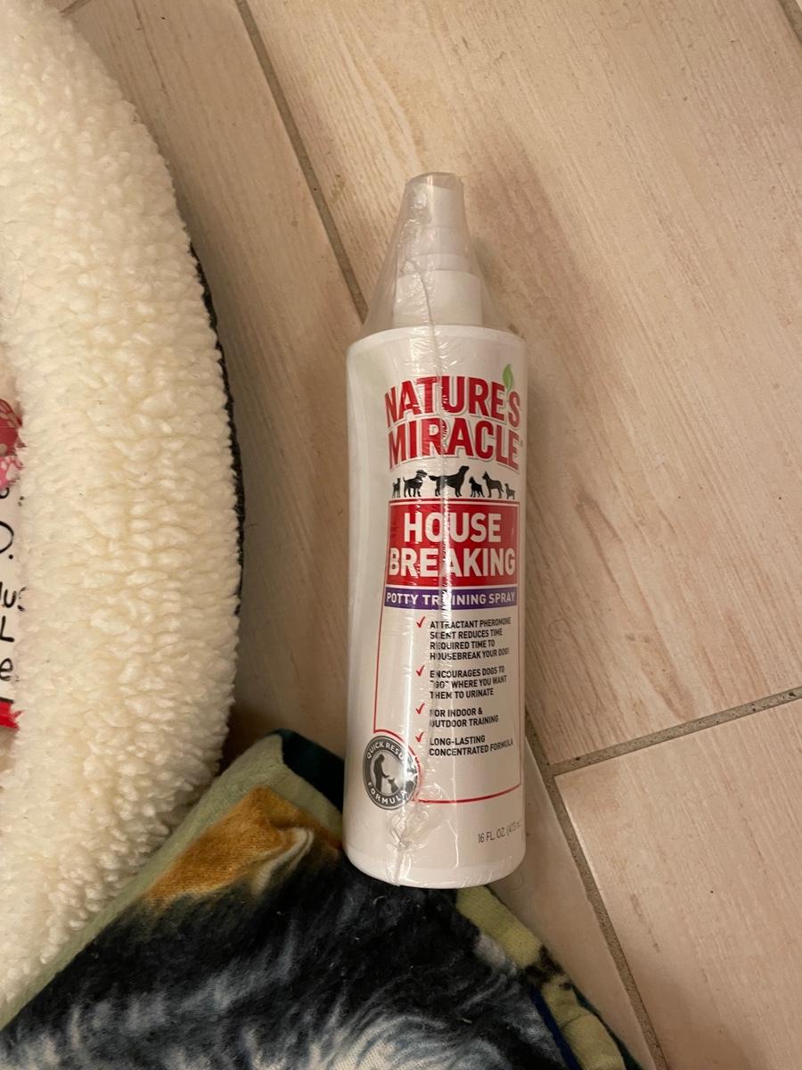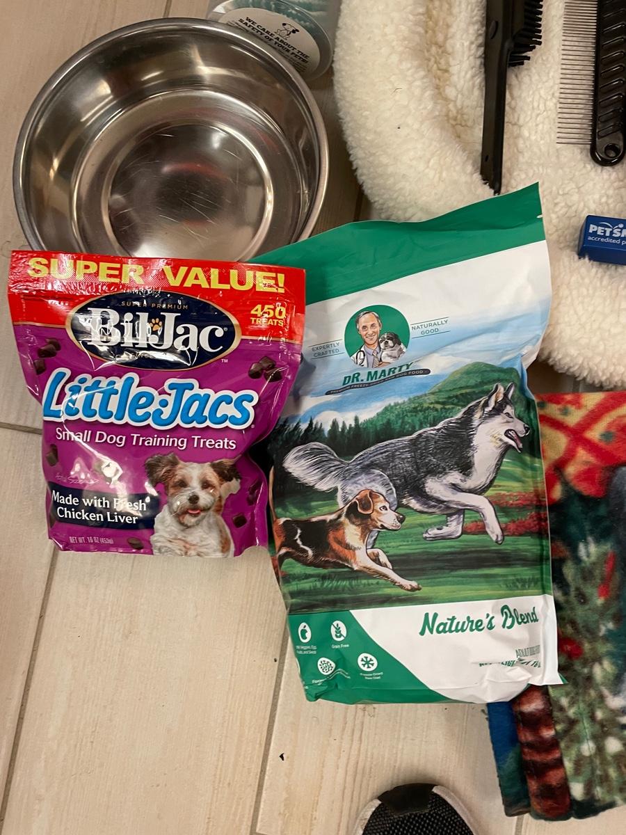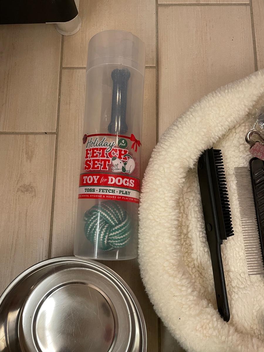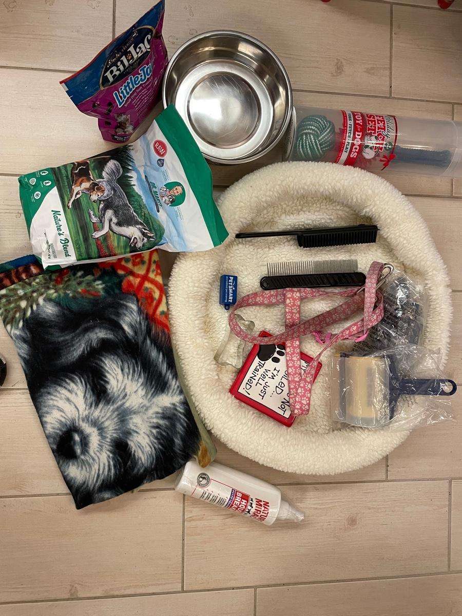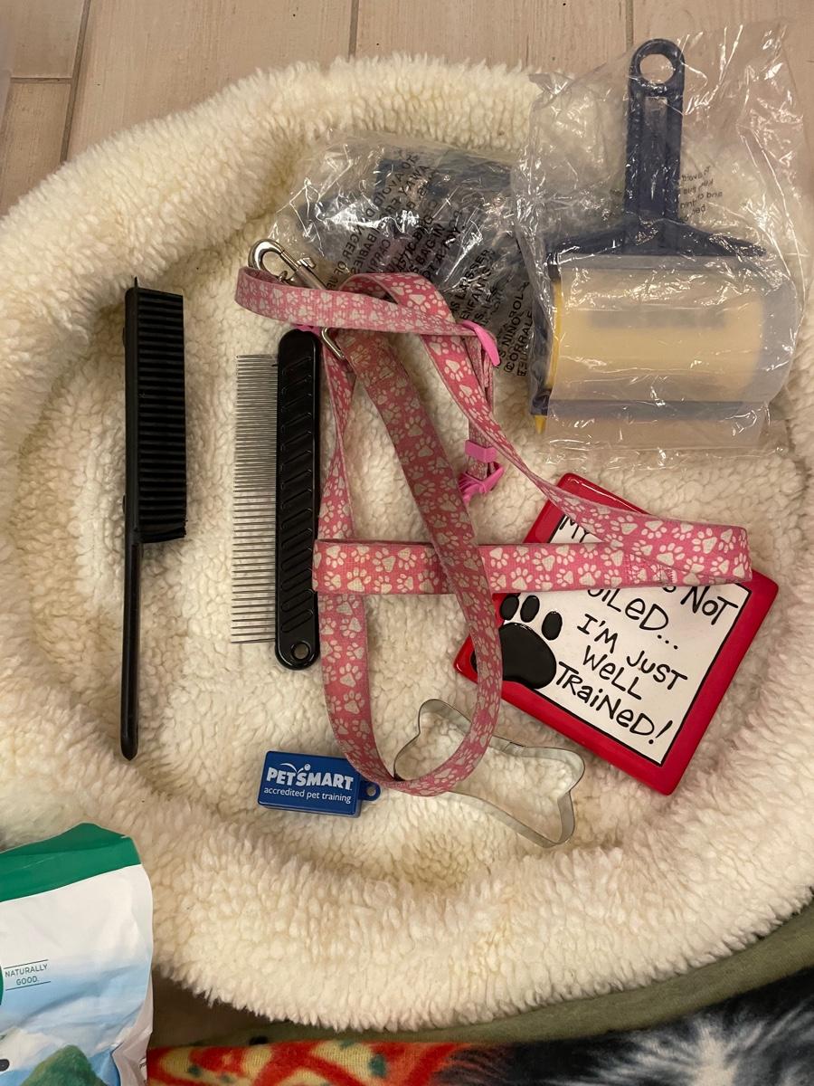Assortment of dog supplies including fleece bed and blanket, dish, leash and collar, grooming items, treats, toys and Nature's Miracle