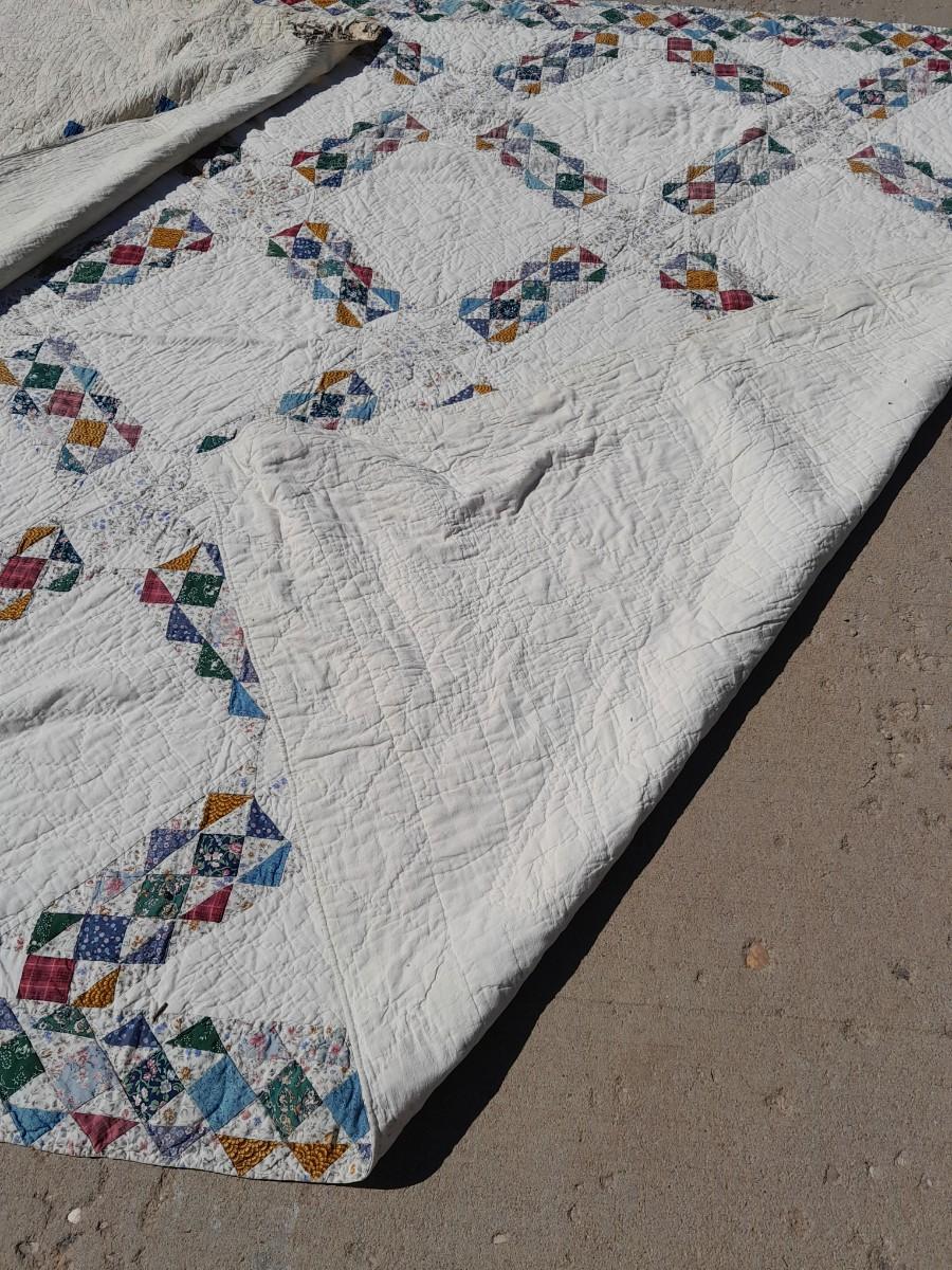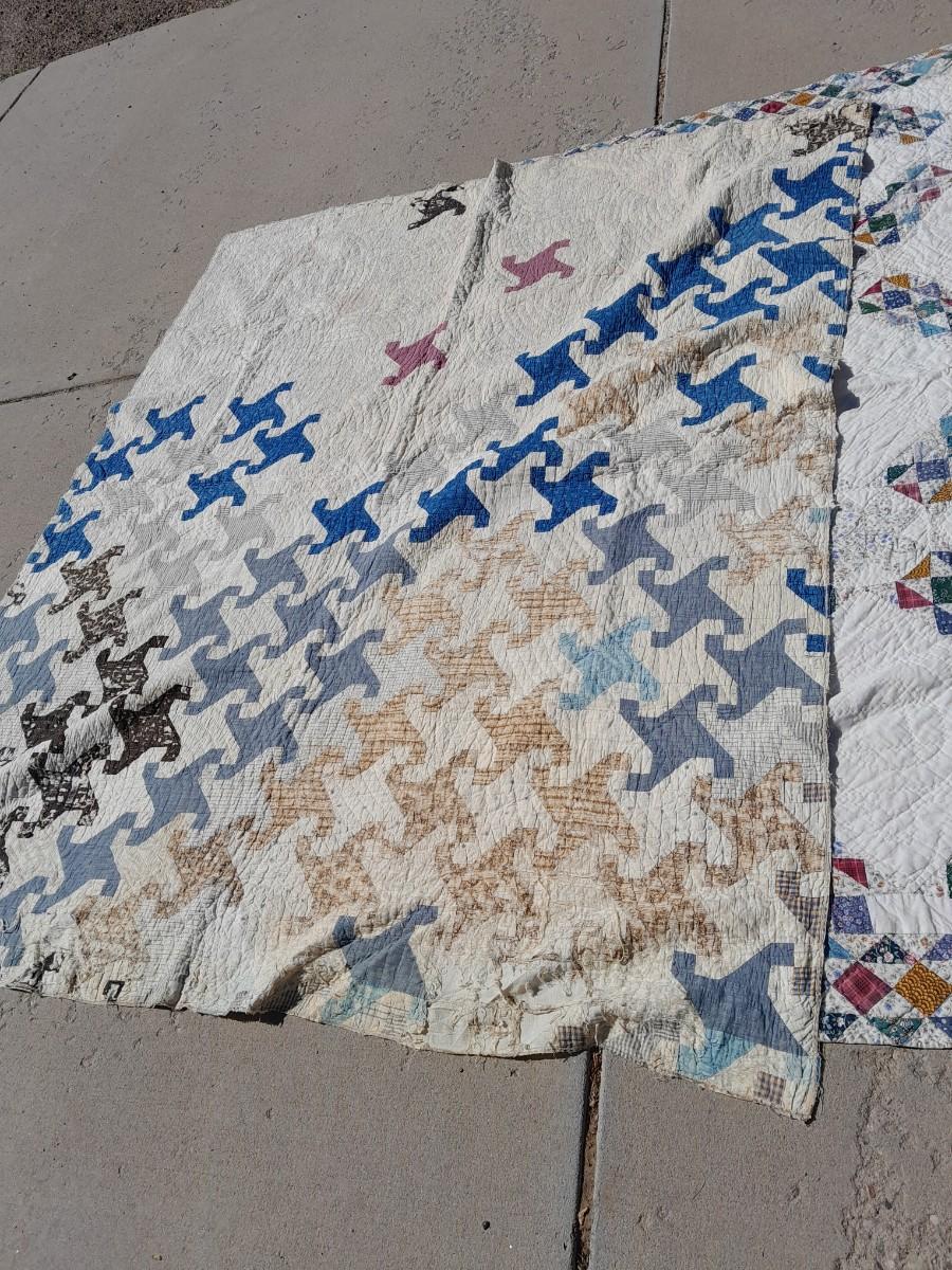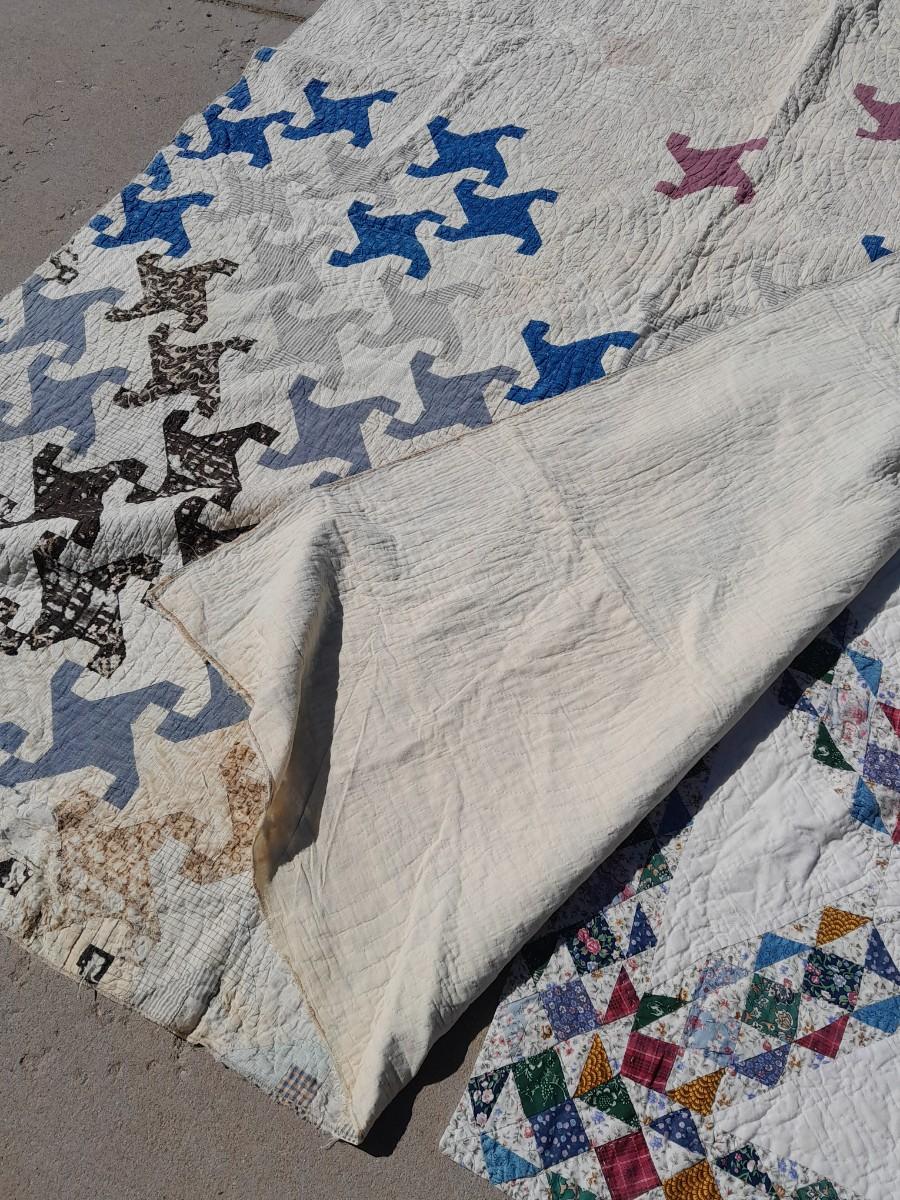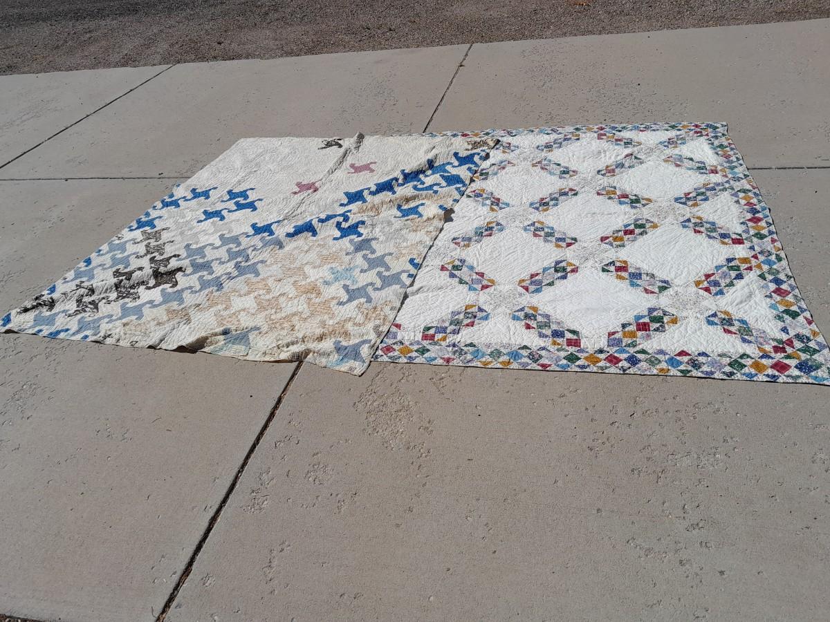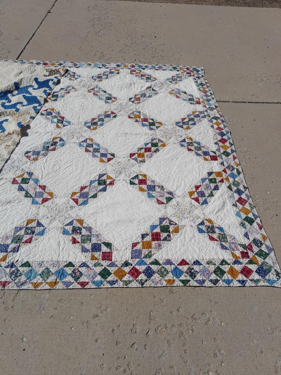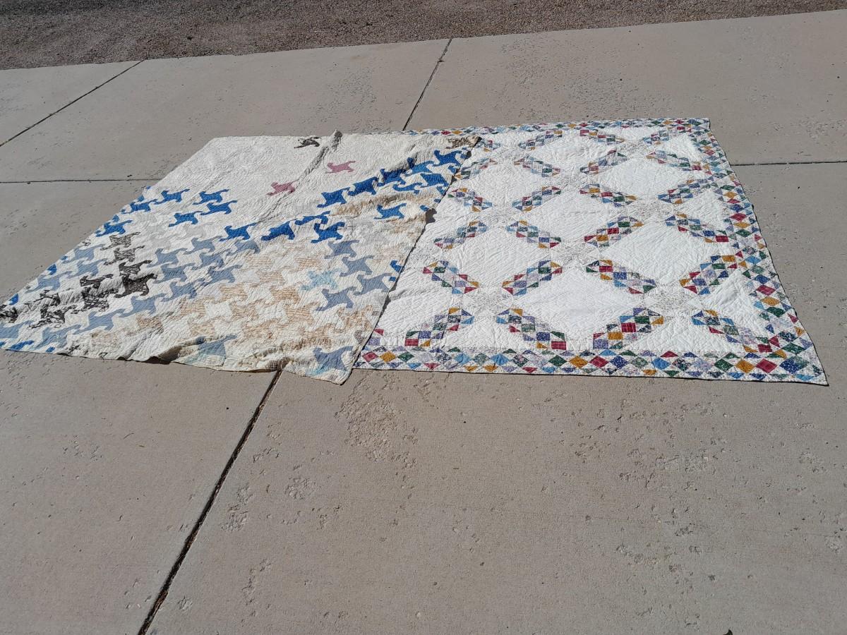 TWO HAND SEWN QUILTS, ONE SHOWS SIGNIFICAN WEAR (blue geometric shapes) 78" X 83" AND 81" X 67"