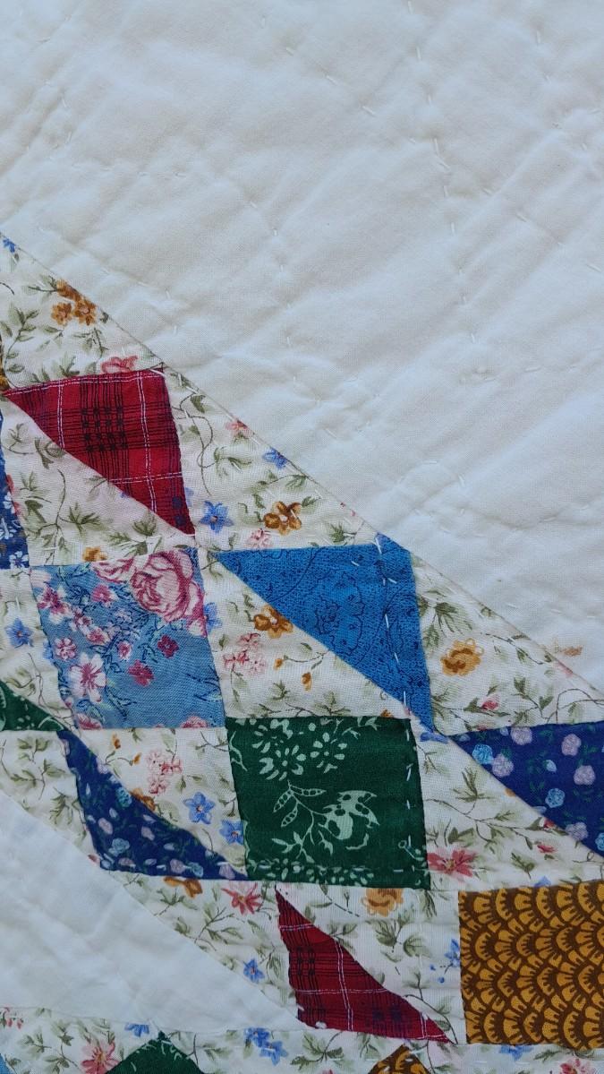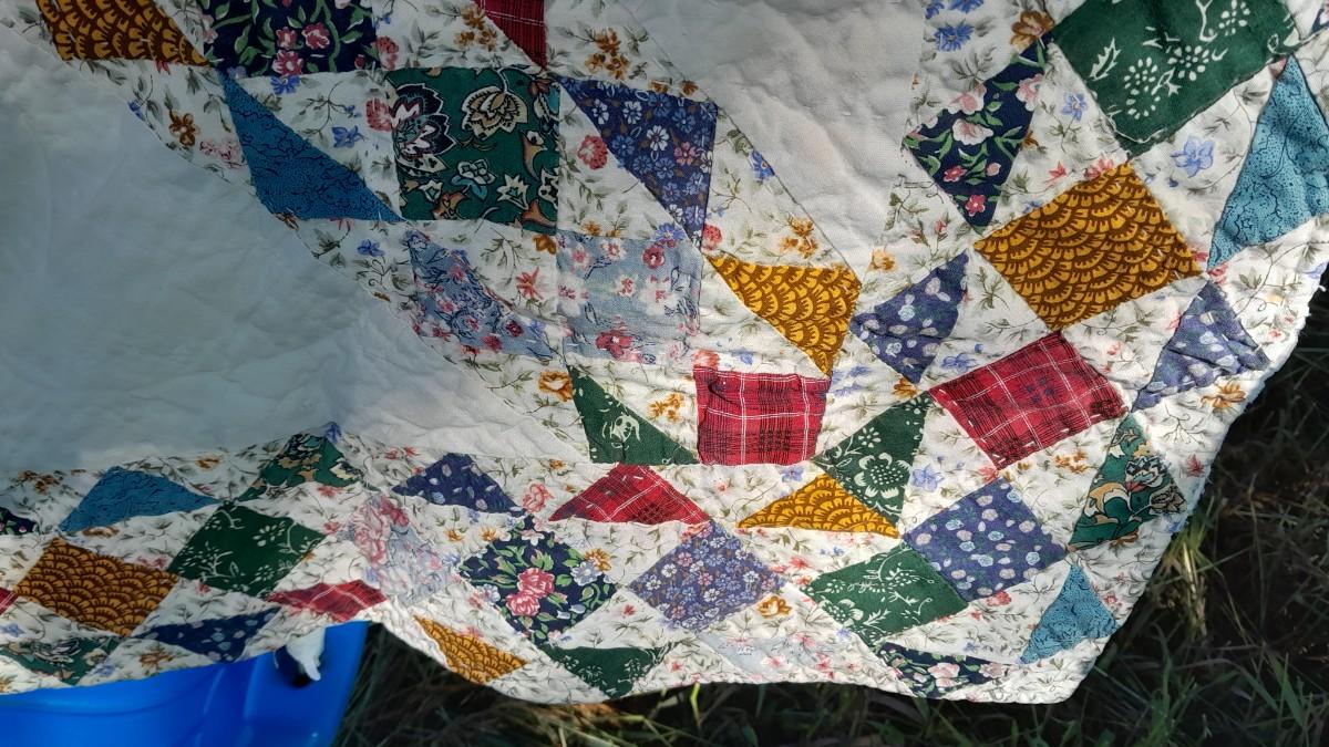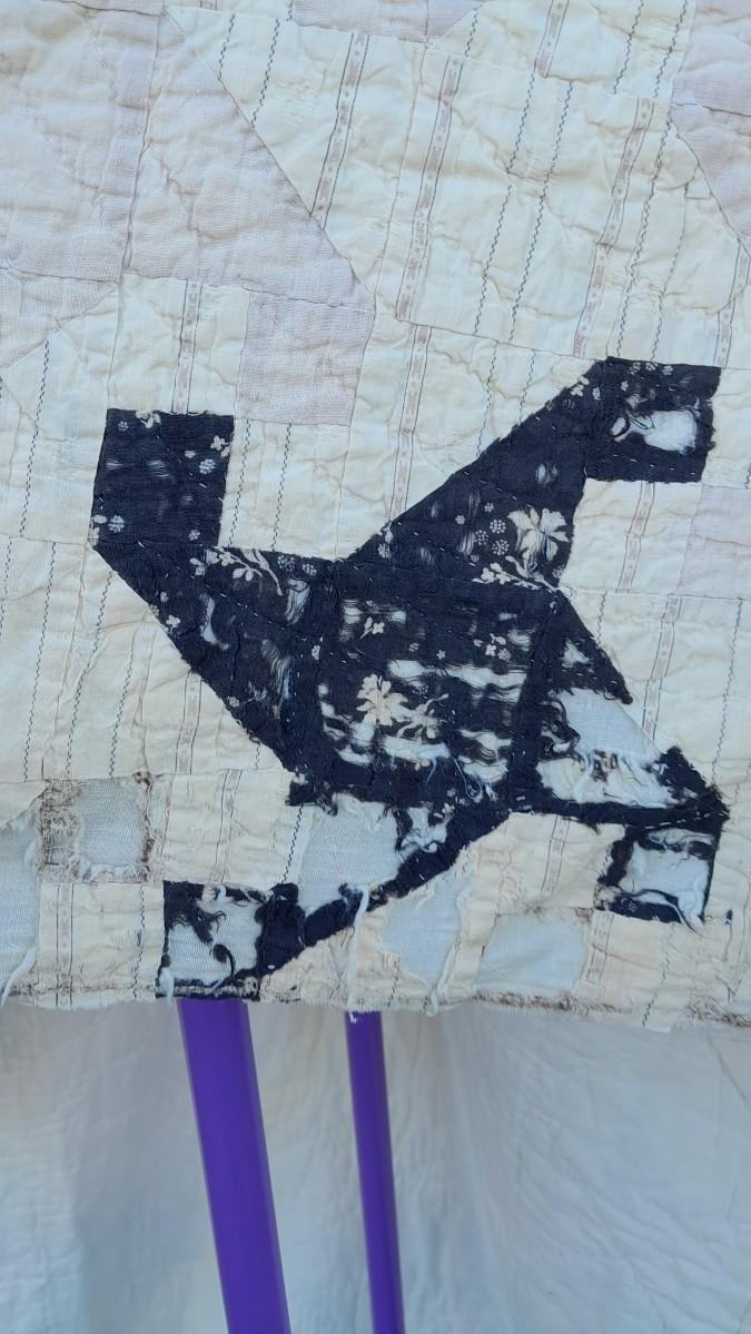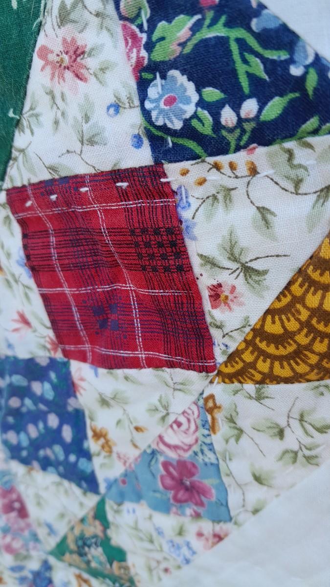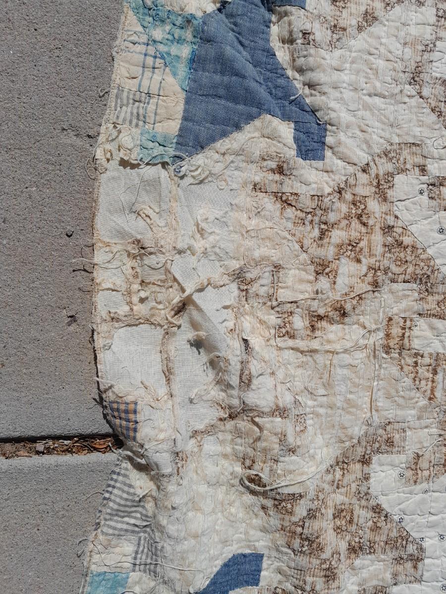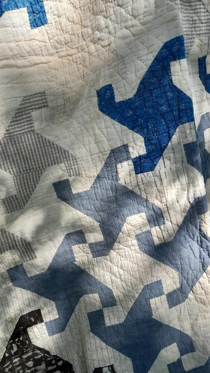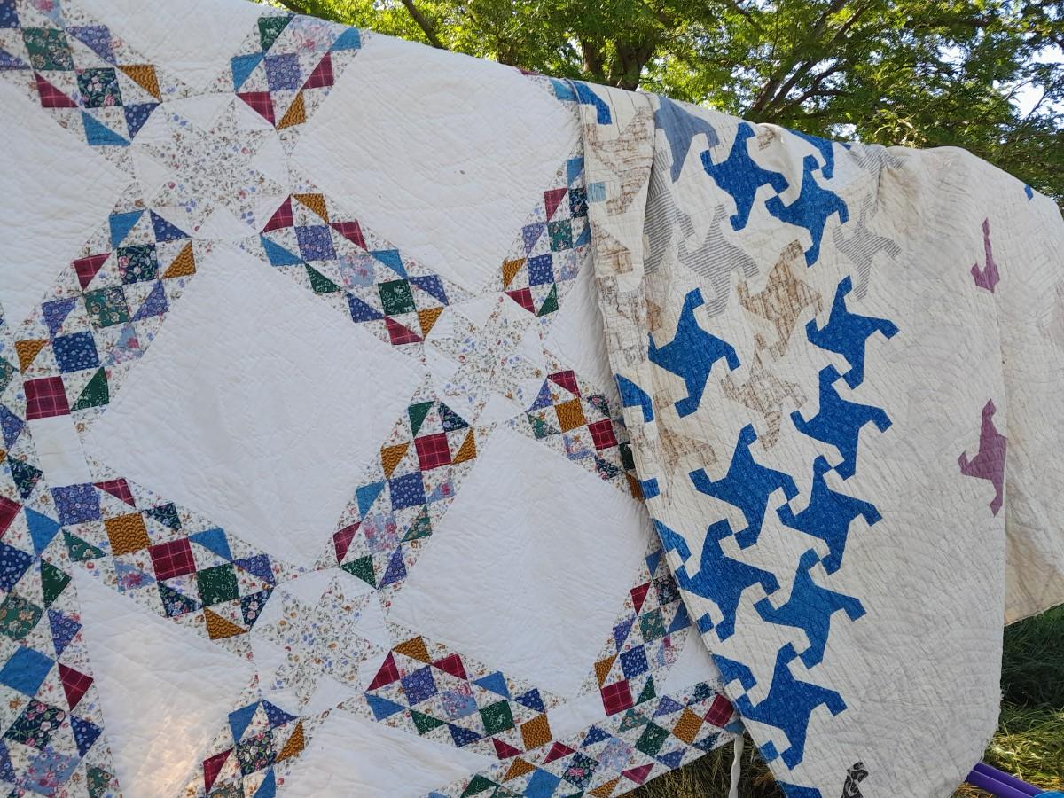 TWO HAND SEWN QUILTS, ONE SHOWS SIGNIFICAN WEAR (blue geometric shapes) 78" X 83" AND 81" X 67"