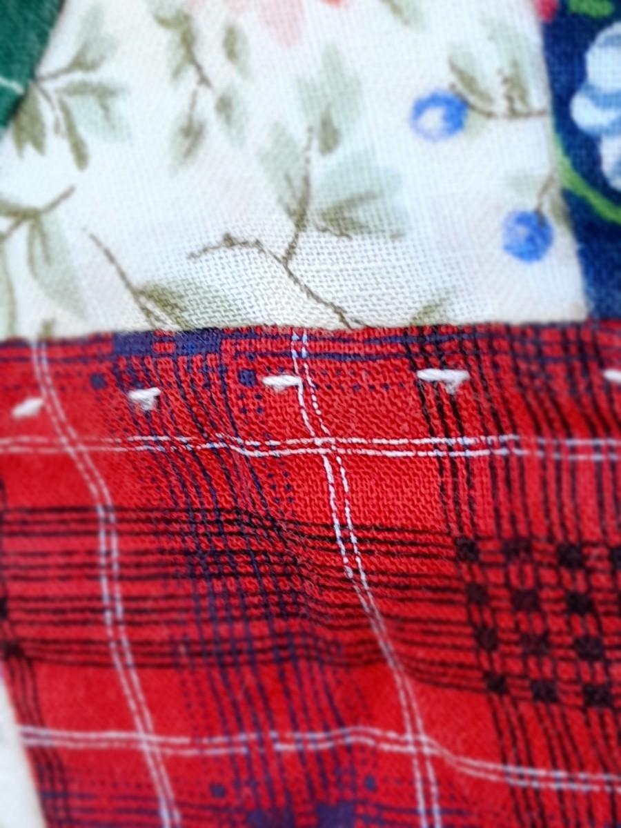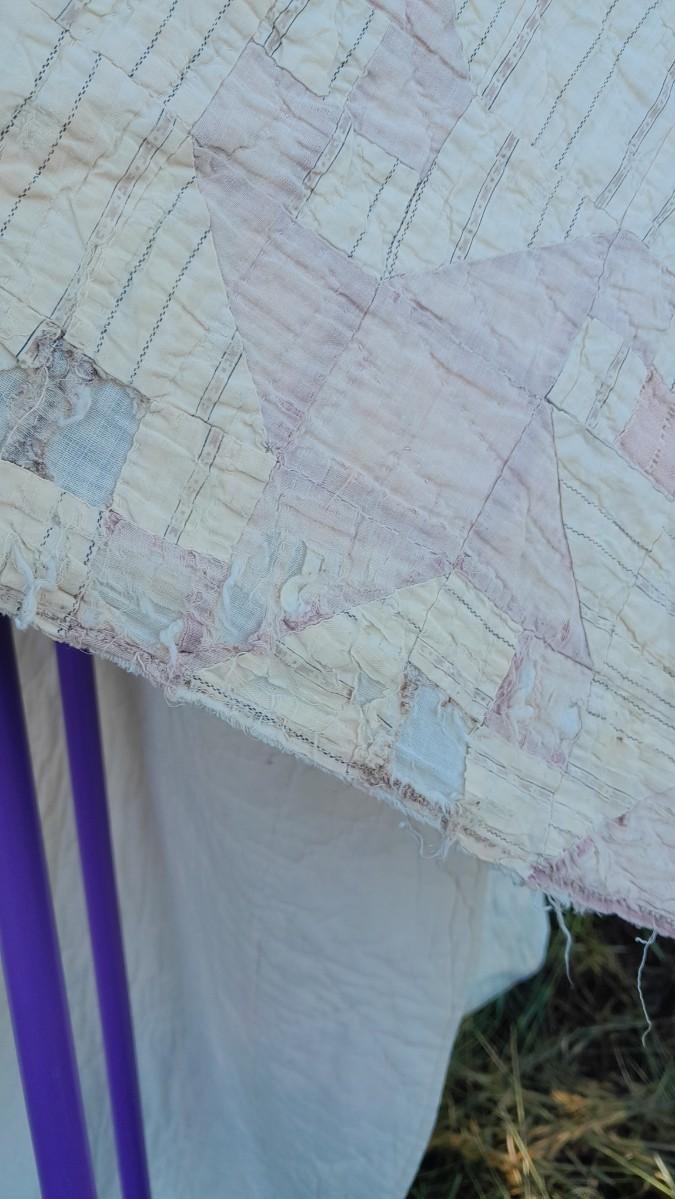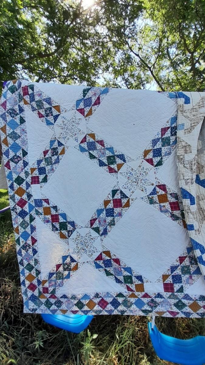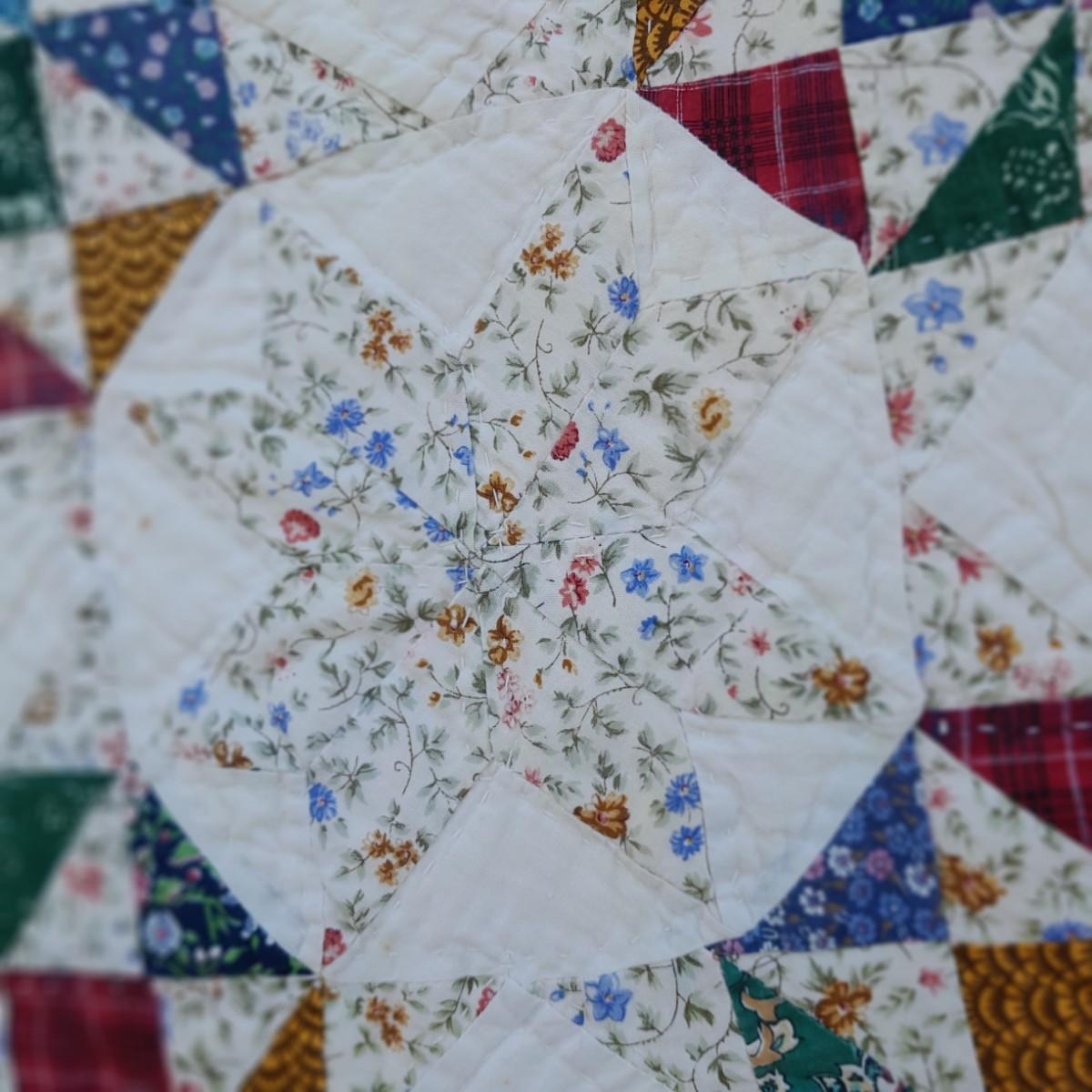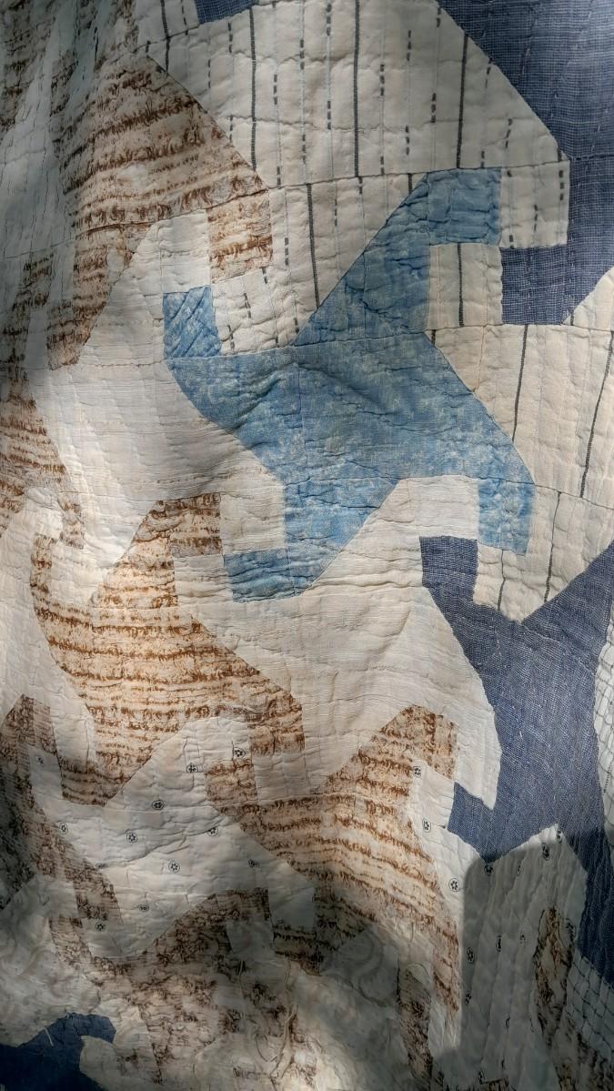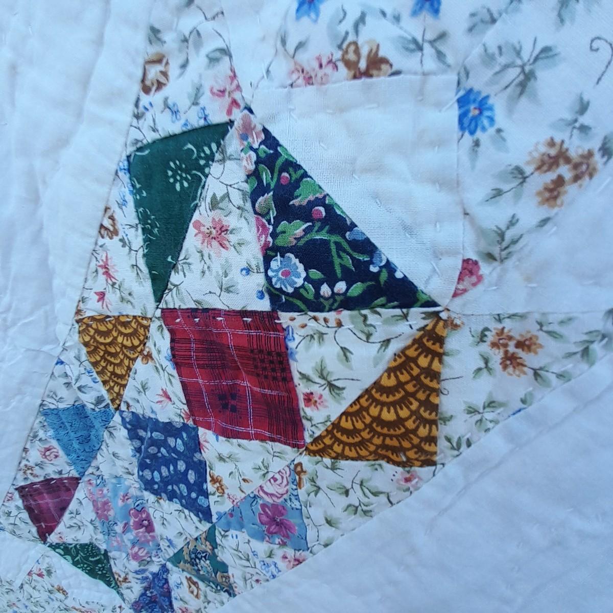 TWO HAND SEWN QUILTS, ONE SHOWS SIGNIFICAN WEAR (blue geometric shapes) 78" X 83" AND 81" X 67"
