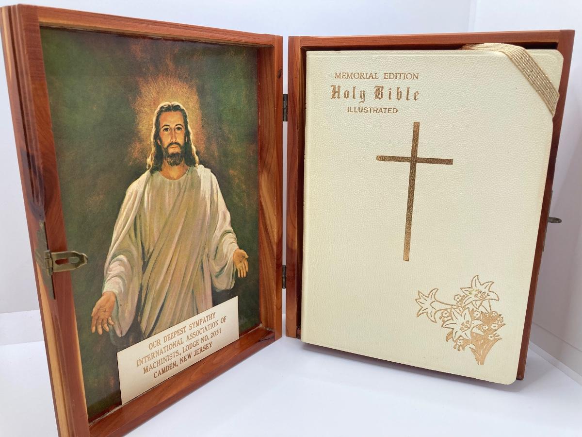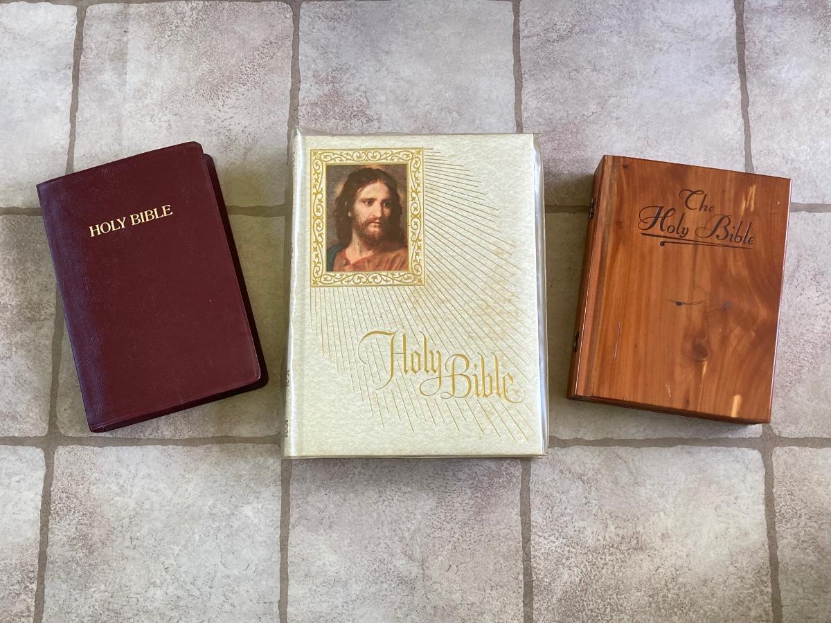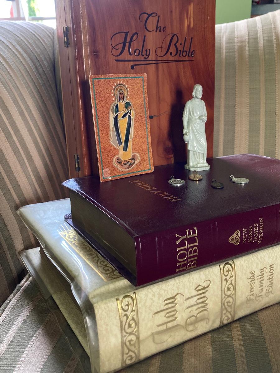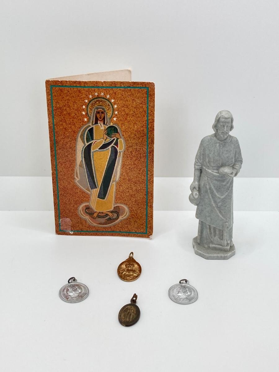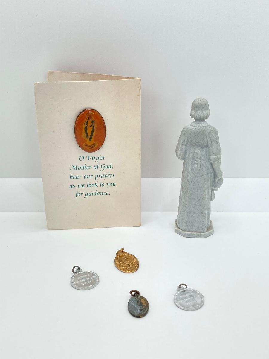 LOT 372: Vintage Religious Collection - Bibles, Medals and Small Statue
