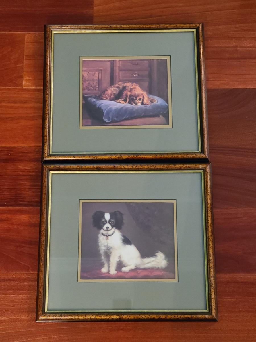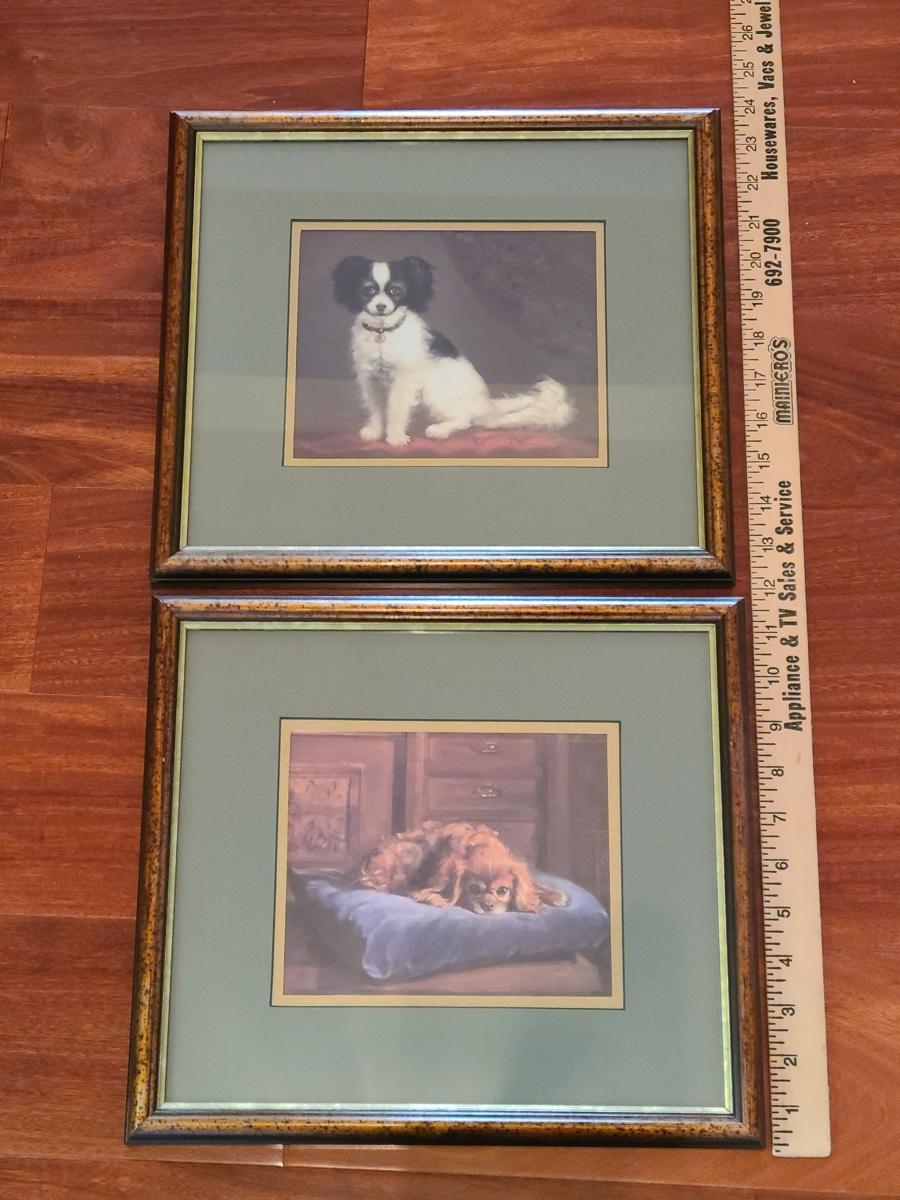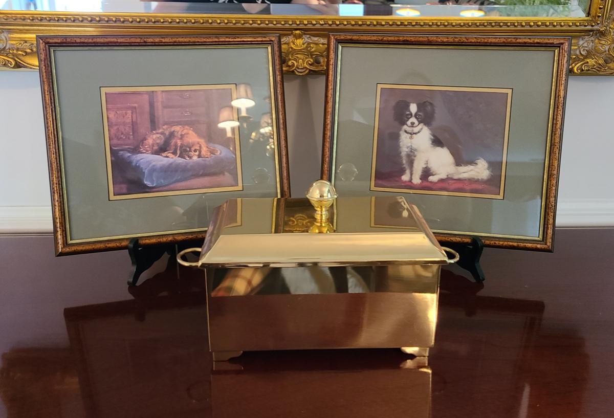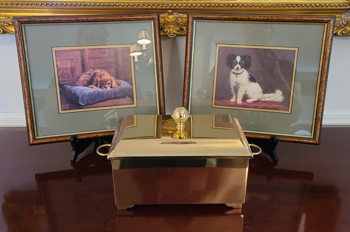 Two artworks of dogs, and a brass colored box. This box is lightweight and does not feel like solid brass, but brass flashed. Please see all pictures as they are the best representation of the items. The pictures show condition, measurements if taken, and what is included in the lot. Due to the large amount that we photograph and the time frame, we are not always able to take measurements. All items unless noted, are pre-owned and have been used. If you purchased furniture, you must bring help. We do not allow one person to carry large furniture out on their own. Bring help, tools and a truck for the safety of our client’s homes, and your personal safety. Company policy. Thank you.